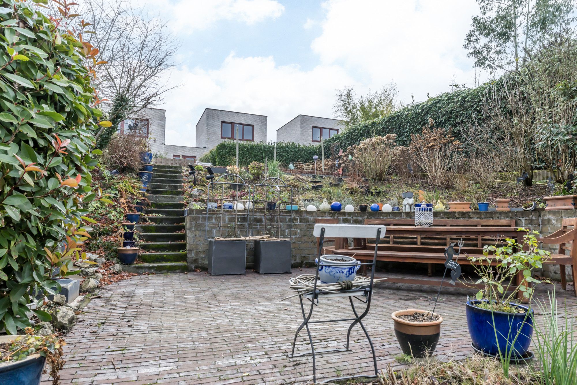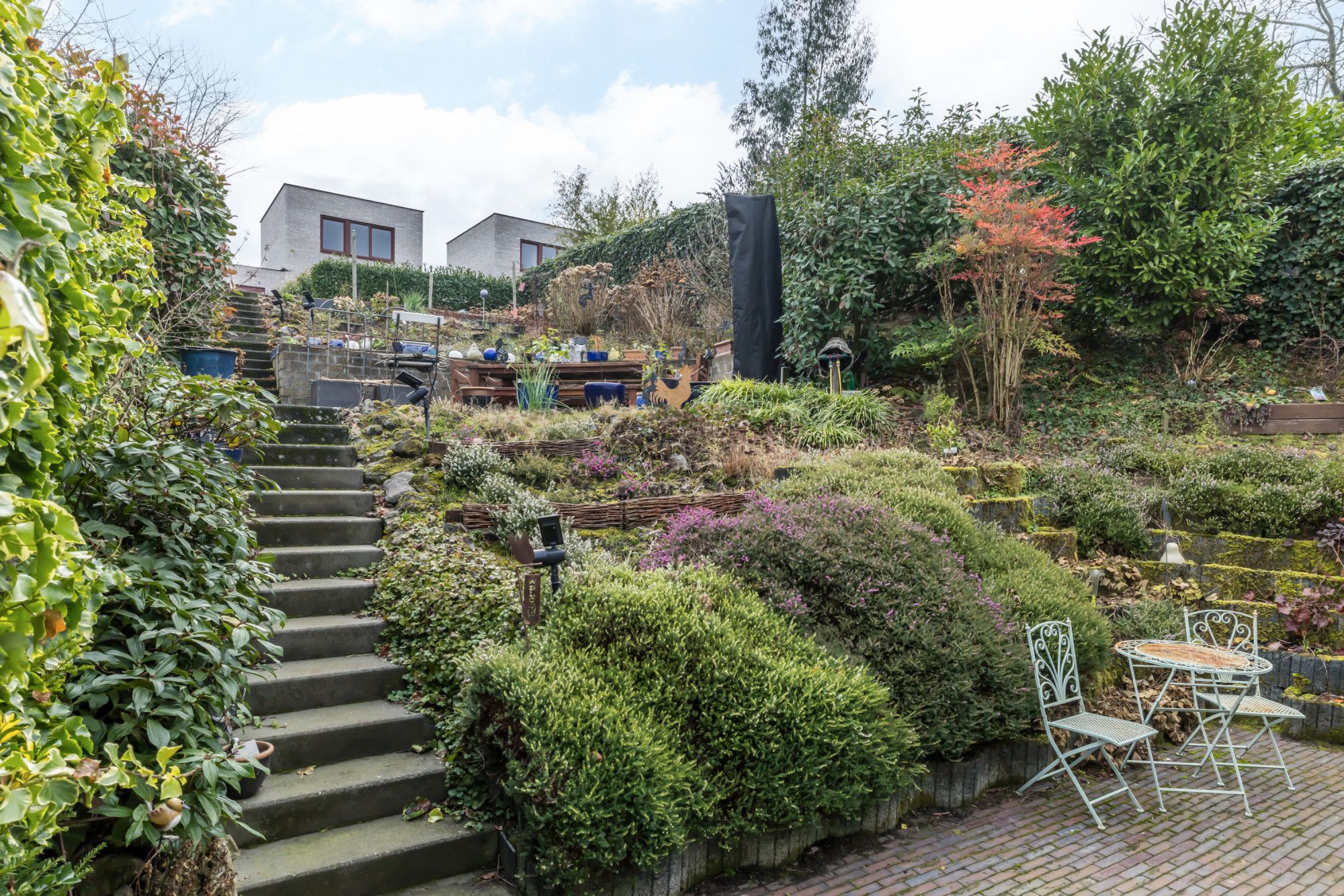 De diepe, fraai aangelegde en volledig omsloten bordestuin op het zuidoosten vormt een waar buitenparadijs. Op de begane grond bevindt zich een gezellig terras met zithoek en buitenkraan. Het eerste niveau biedt sierlijke beplanting en een royaal beklinkerd terras, terwijl niveau twee ruimte biedt aan een gazon, groene borders en een moestuin met houten berging. Vanuit elke hoek van de tuin geniet men van rust en een prachtig zicht op de woning.