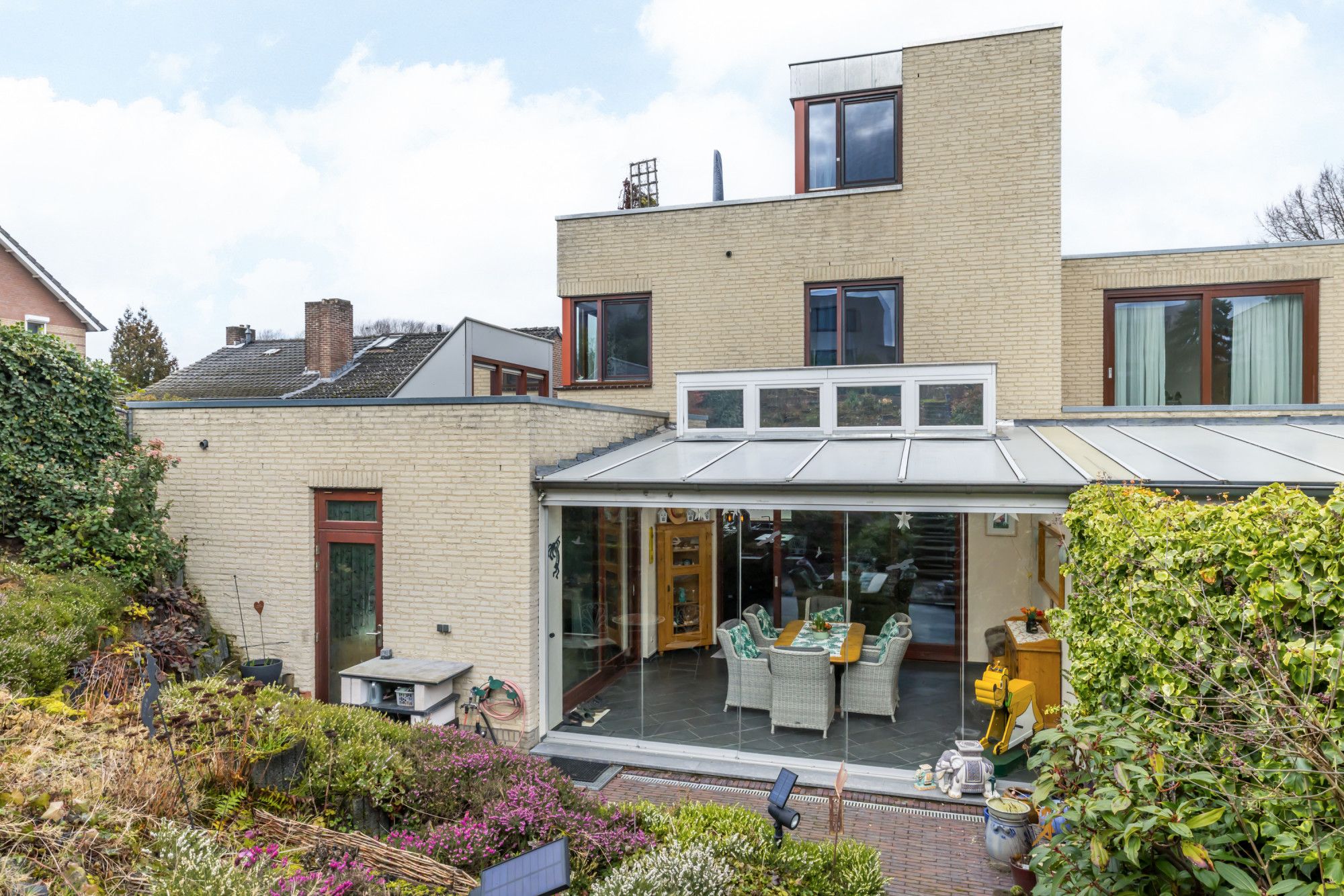 De heldere en lichte serre/tuinkamer geeft veel extra woonruimte, heeft een lichtstraat en glazen schuifwanden welke direct tuincontact en toegang tot het achtergelegen terras bieden.