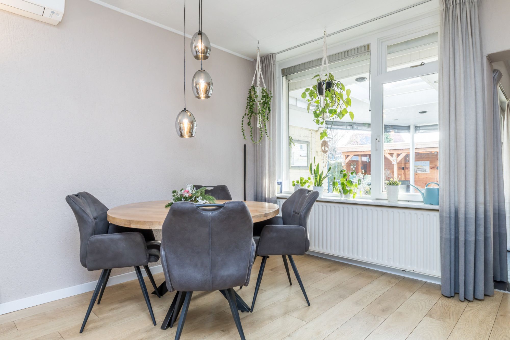 Centraal in de woning bevindt zich de eetkamer met airconditioning en de opgang naar de verdieping, wat zorgt voor een prettige en logische indeling.