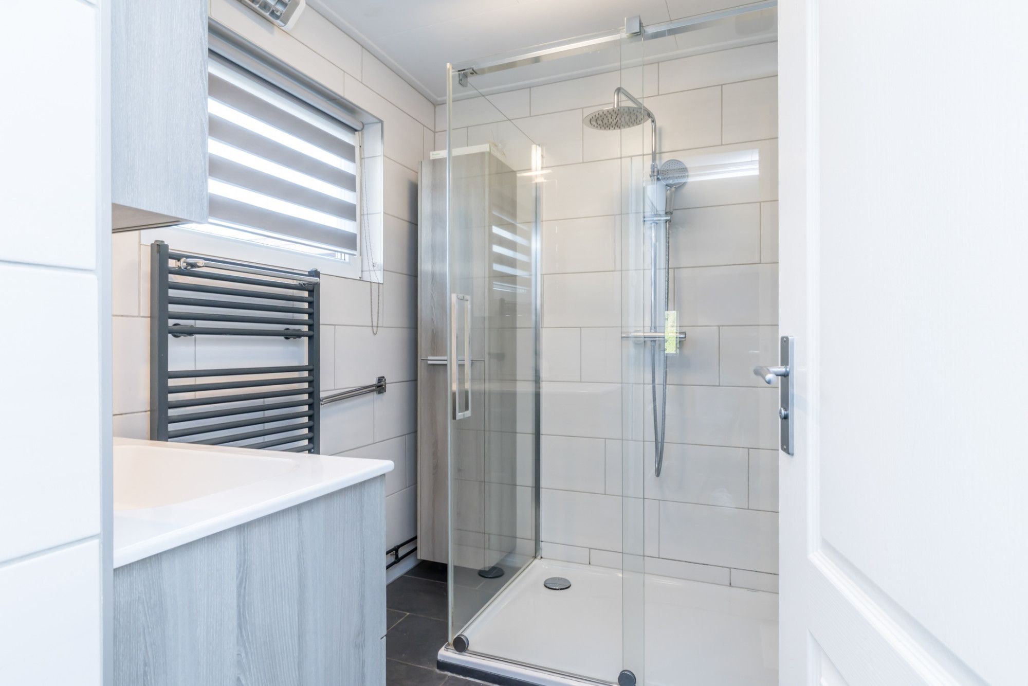* BADKAMER MET INLOOPREGENDOUCHE / VASTE WASTAFEL IN EEN MEUBEL EN DESIGN RADIATOR
