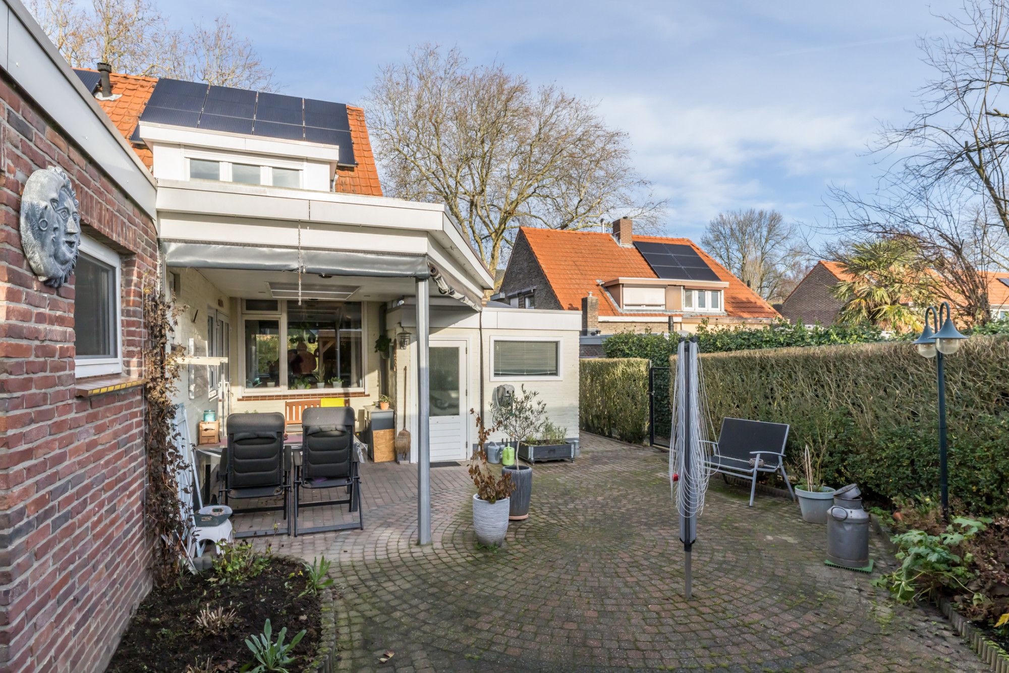 Keurig verzorgde geheel omsloten achtertuin met terras voorzien van een overkapping met lichtkoepel en afsluitbaar middels verandazeilen en borders met aanplanting. Geheel beklinkerde binnenplaats met toegang tot het achtergelegen houten prieel, een tweetal bergingen en de garage. In de stenen berging is de standplaats voor voor de Remeha Calenta CV-Combiketel ( Bouwjaar 2011 / Eigendom), de ander is in gebruik als hobby-/opslagruimte.