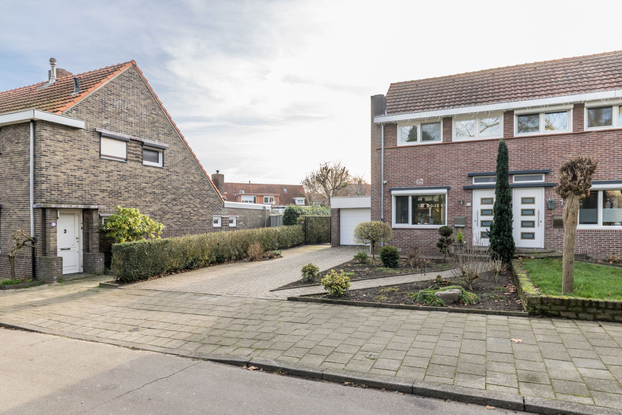 De ruime oprit biedt parkeergelegenheid aan meerdere voertuigen op eigen terrein. Naastgelegen gemeenschappelijk achterpad biedt toegang tot de achtertuin.