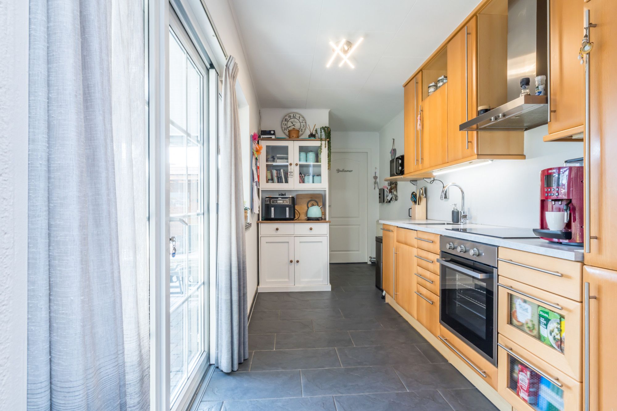 In achterbouw geplaatste keukenruimte, met plavuizenvloer en veel lichtinval, voorzien van een eigentijdse inbouwkeuken met apparatuur, te weten: 4 zones inductie kookplaat / RVS-wandschouw afzuigkap / elektrische oven / lady-vaatwasmachine / wasbak met close-in boiler / koelkast / veel bergruimte en dubbele openslaande tuideuren naar het overdekte terras.