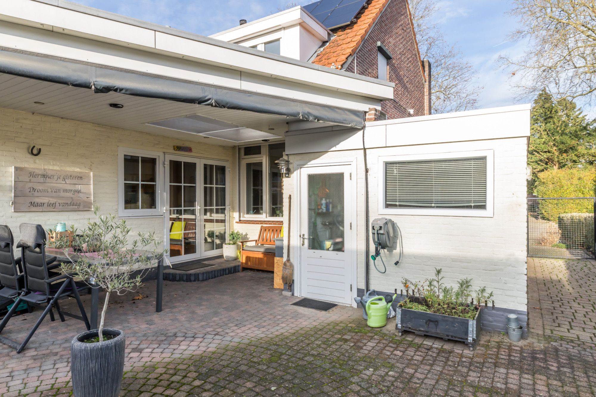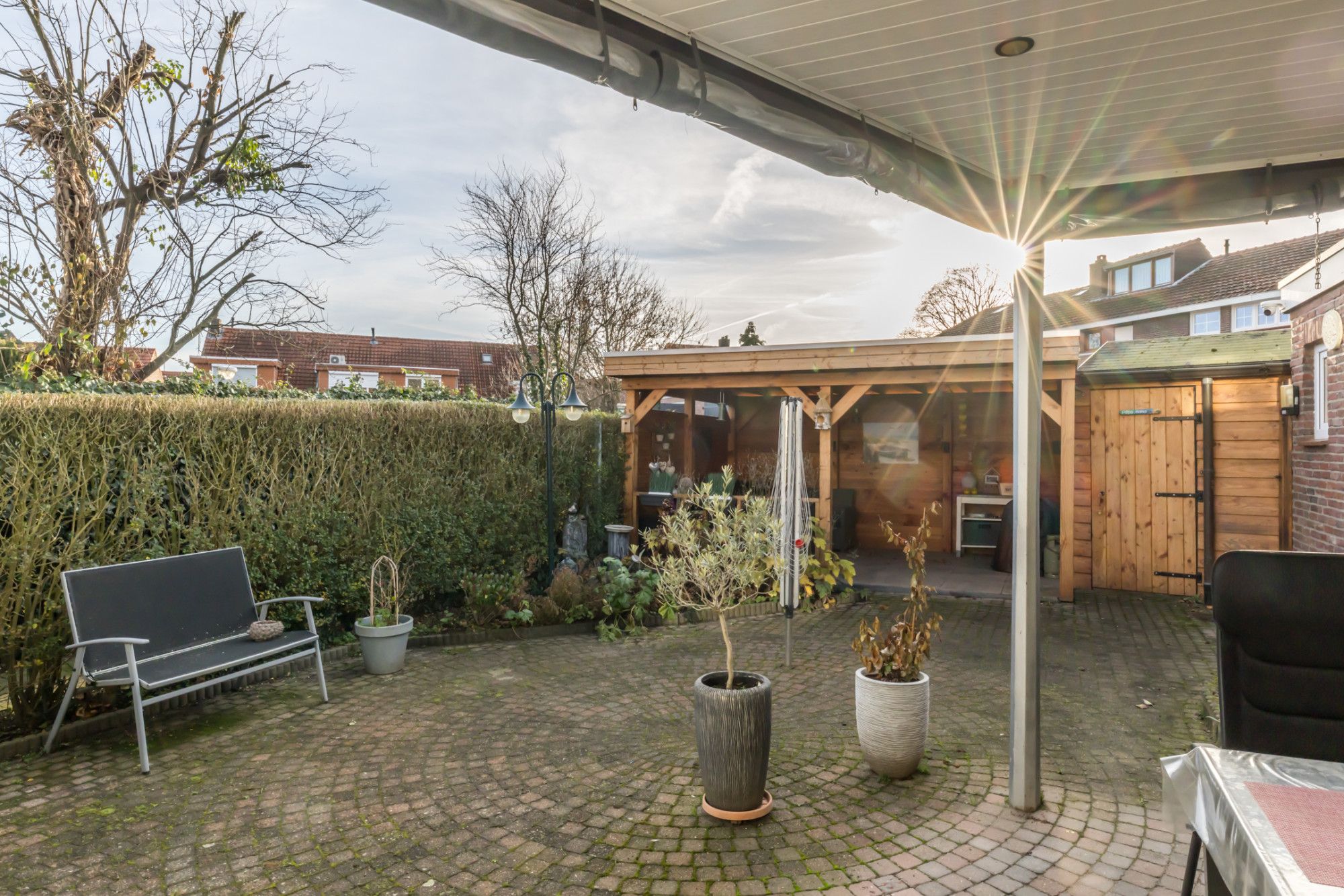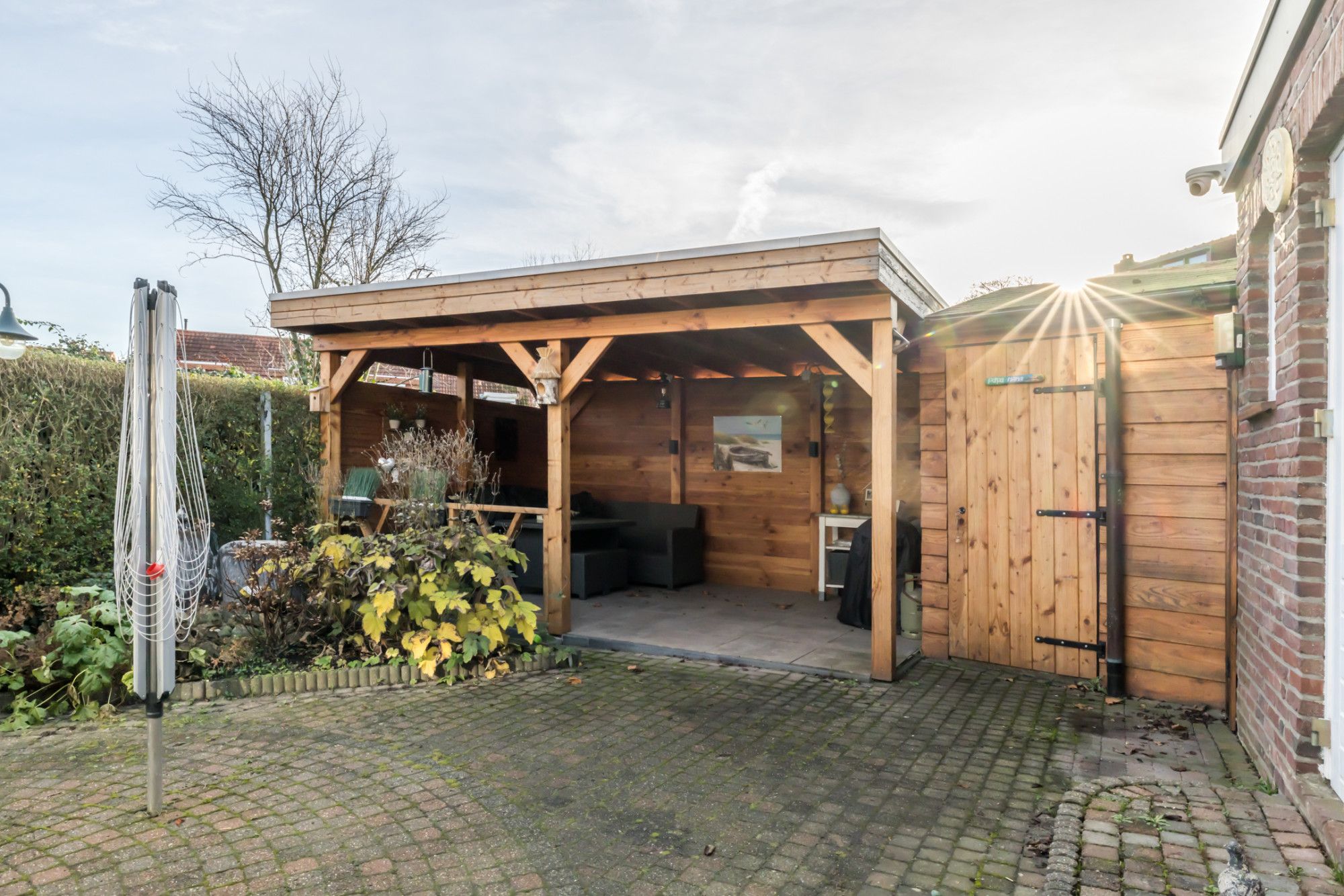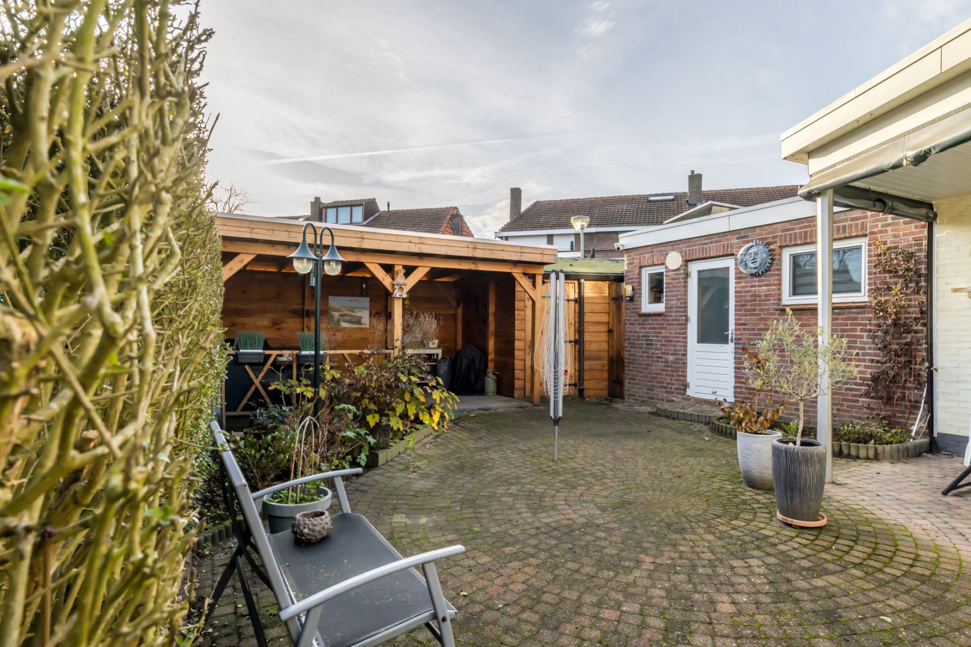 De geheel omsloten achtertuin is een echte plus: een ruim terras met overkapping voorzien van lichtkoepel en verandazeilen, borders met aanplanting, een stenen berging met standplaats voor de cv-combiketel, een extra berging én een houten prieel met gezellige zithoek.