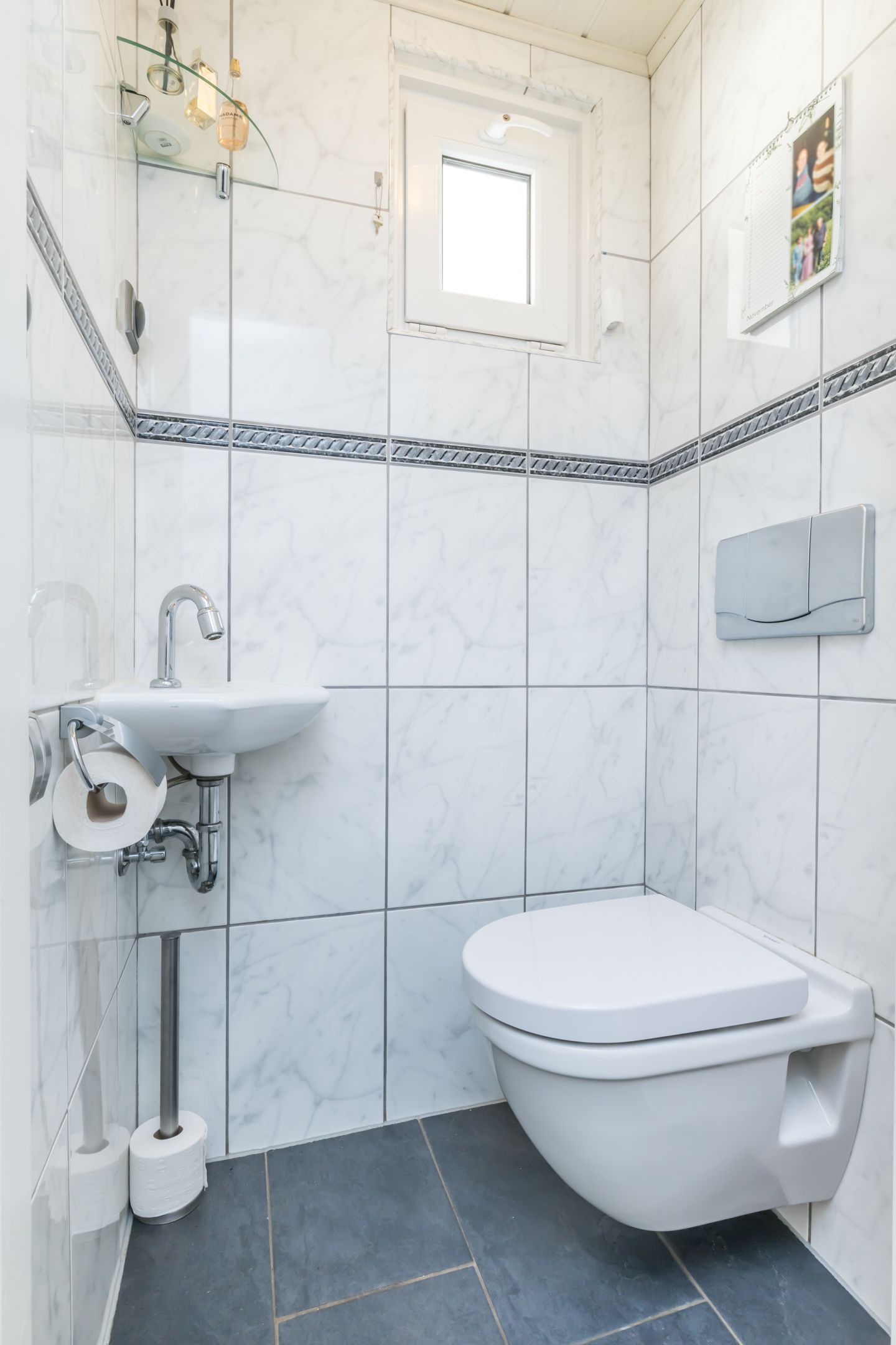 Geheel betegeld gastentoilet met een zwevend wandcloset met fonteintje.