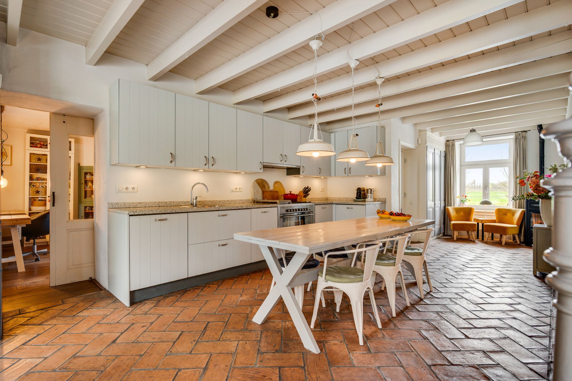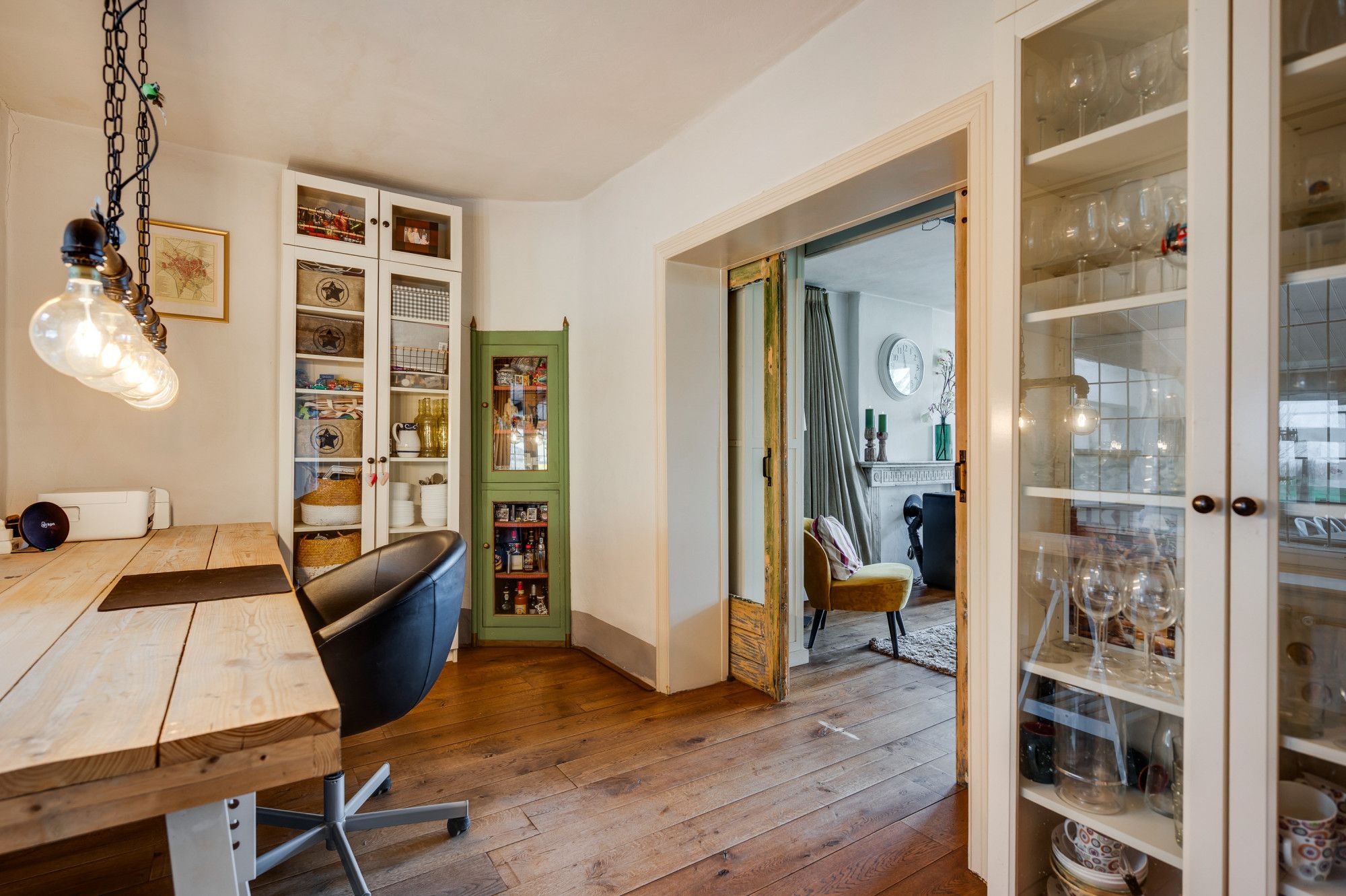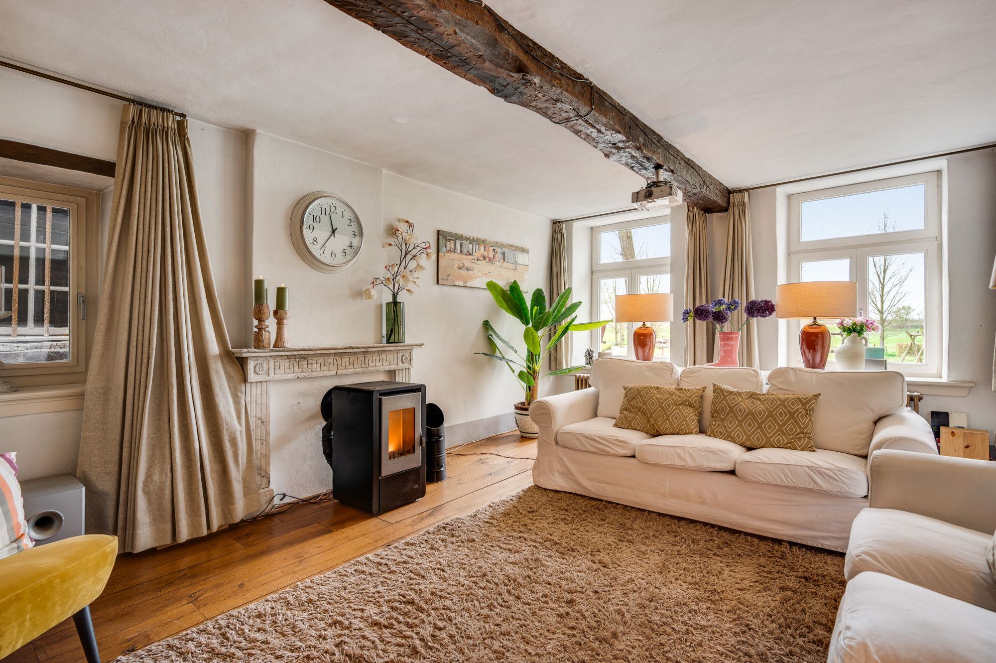 De ontvangsthal met authentieke elementen biedt toegang tot de gasmeter, woonkeuken en de woonkamer. De ruime woonkamer beschikt over een gezellige pelletkachel en en-suite deuren. De woonkamer staat in verbinding met de aangrenzende werkkamer. De riante landelijke woonkeuken met vloerverwarming is uitgevoerd in L-opstelling met granieten blad en voorzien van inbouwapparatuur, waaronder een 6 pits fornuis, oven, afzuigkap en vaatwasser. De keuken heeft tevens een pelletkachel voor gezellige warmte. Een authentieke houten kast in de keuken biedt toegang tot de meterkast. Aangrenzend aan de keuken is een volledige ruimte ingericht als koffiehoek met koffiebar. Aan de voorzijde van het huis bevindt zich nog een kamer, die thans wordt gebruikt als tv kamer, maar uitstekend kan functioneren als kantoor, speelruimte of slaapkamer. Vanuit de woonkeuken bieden zowel dubbele tuindeuren als een aparte tuindeur toegang tot de riante veranda en de heerlijke grote tuin. Ook is de kelder vanuit de woonkeuken goed te bereiken. In het tussen portaal, thans dienst doend als tweede garderobe, bevinden zich - naast aansluitingen en afvoeren voor wasmachine en droger, de toilet met apart fonteintje en bidetdouche.
