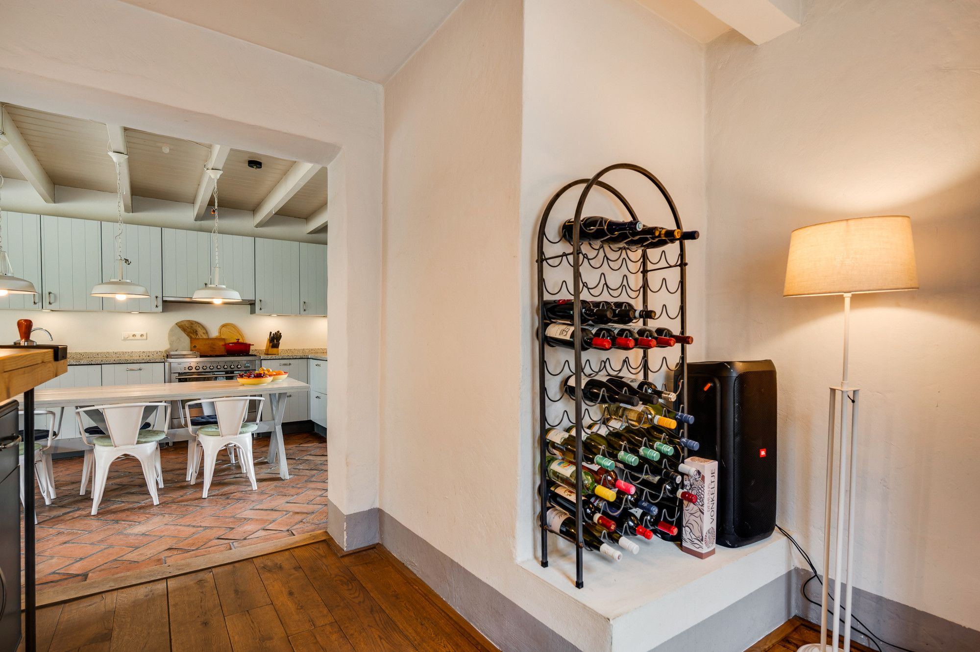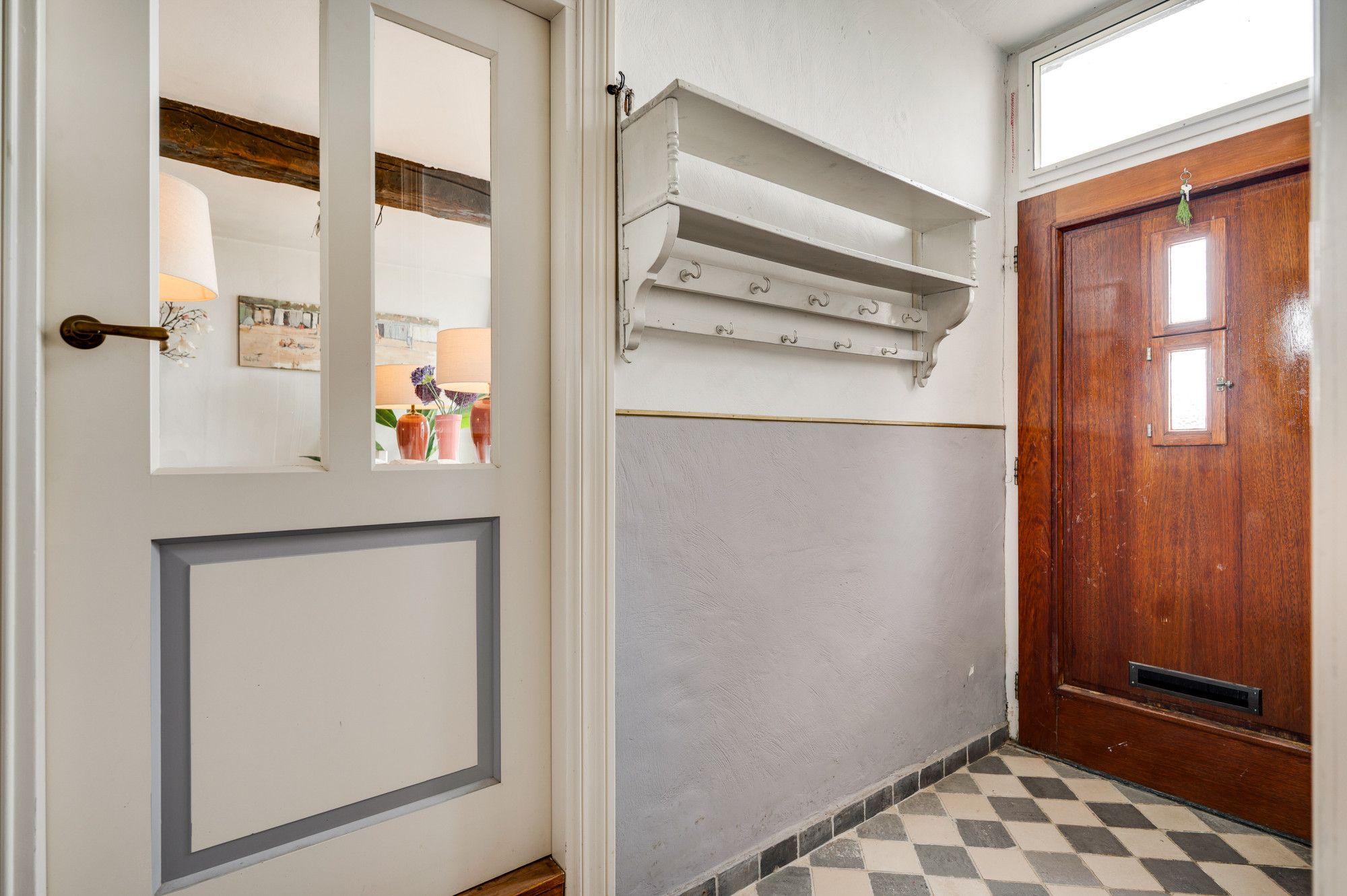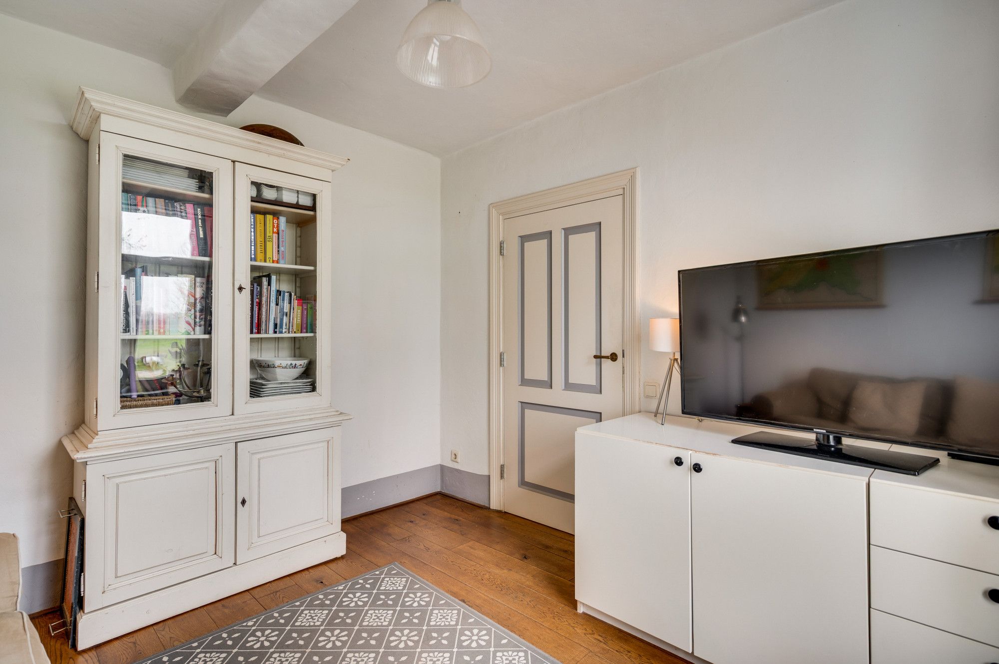 De ontvangsthal met authentieke elementen biedt toegang tot de gasmeter, woonkeuken en de woonkamer. De ruime woonkamer beschikt over een gezellige pelletkachel en en-suite deuren. De woonkamer staat in verbinding met de aangrenzende werkkamer. De riante landelijke woonkeuken met vloerverwarming is uitgevoerd in L-opstelling met granieten blad en voorzien van inbouwapparatuur, waaronder een 6 pits fornuis, oven, afzuigkap en vaatwasser. De keuken heeft tevens een pelletkachel voor gezellige warmte. Een authentieke houten kast in de keuken biedt toegang tot de meterkast. Aangrenzend aan de keuken is een volledige ruimte ingericht als koffiehoek met koffiebar. Aan de voorzijde van het huis bevindt zich nog een kamer, die thans wordt gebruikt als tv kamer, maar uitstekend kan functioneren als kantoor, speelruimte of slaapkamer. Vanuit de woonkeuken bieden zowel dubbele tuindeuren als een aparte tuindeur toegang tot de riante veranda en de heerlijke grote tuin. Ook is de kelder vanuit de woonkeuken goed te bereiken. In het tussen portaal, thans dienst doend als tweede garderobe, bevinden zich - naast aansluitingen en afvoeren voor wasmachine en droger, de toilet met apart fonteintje en bidetdouche.