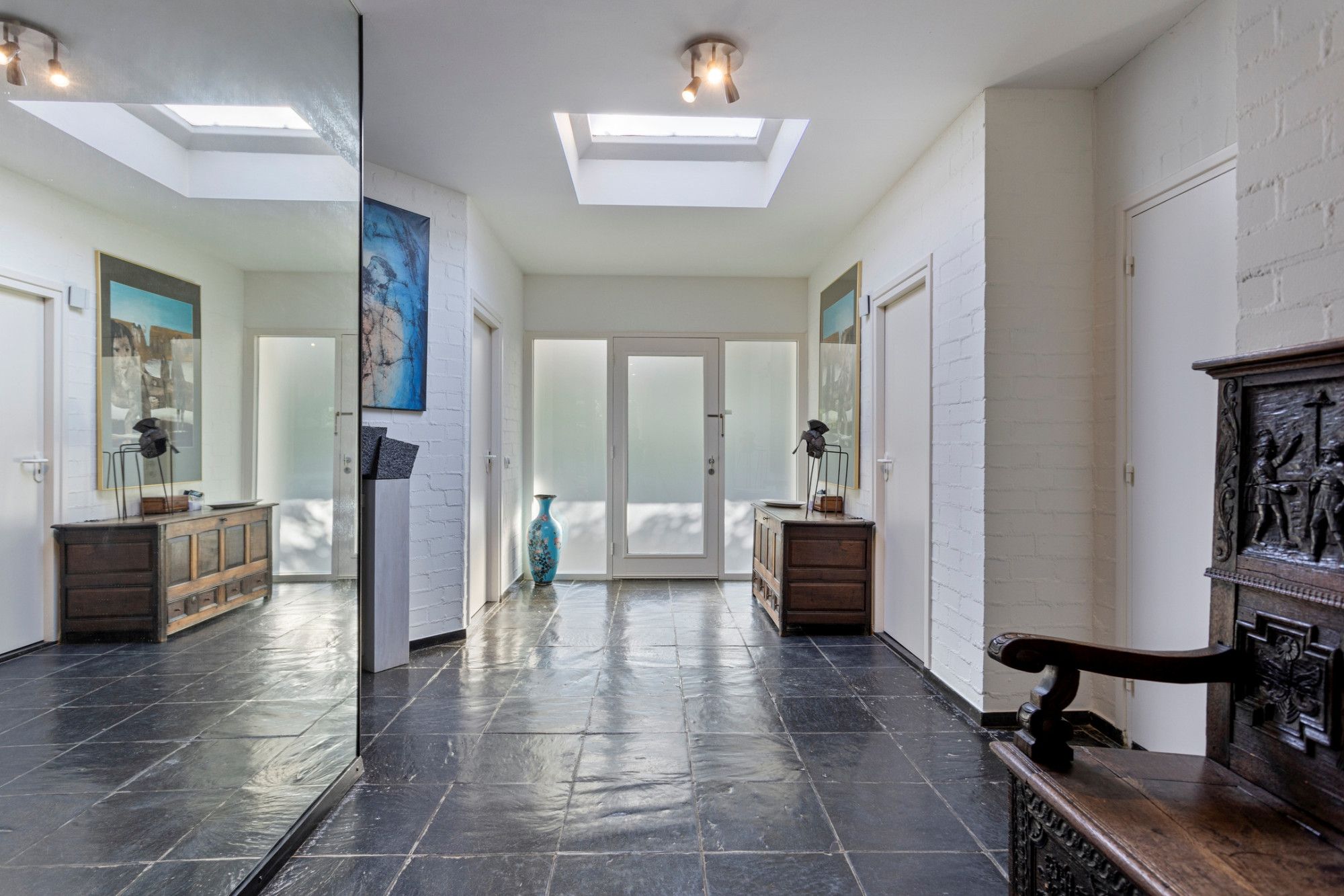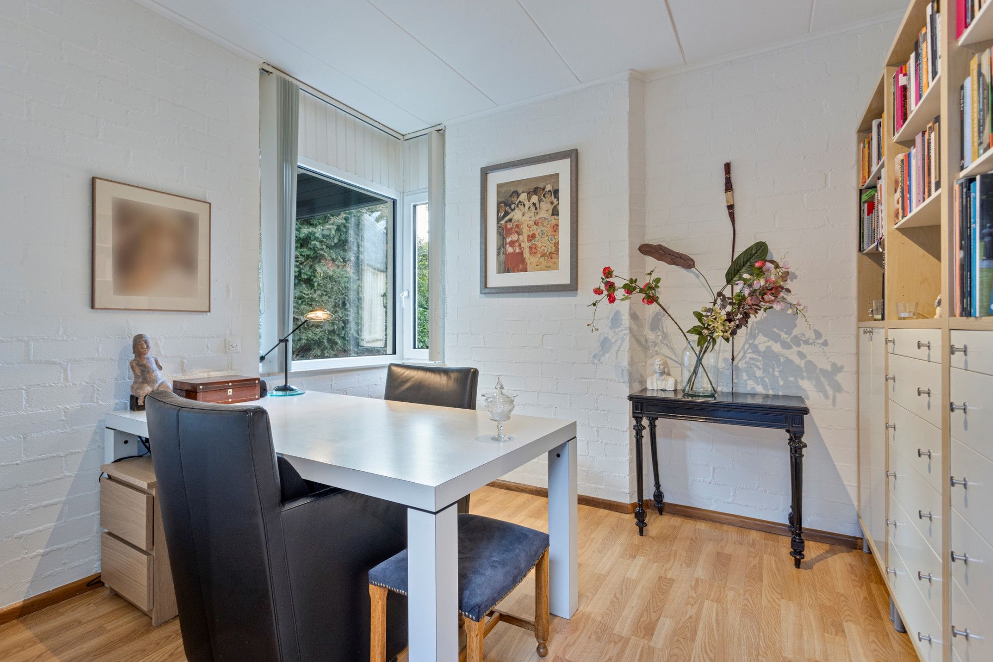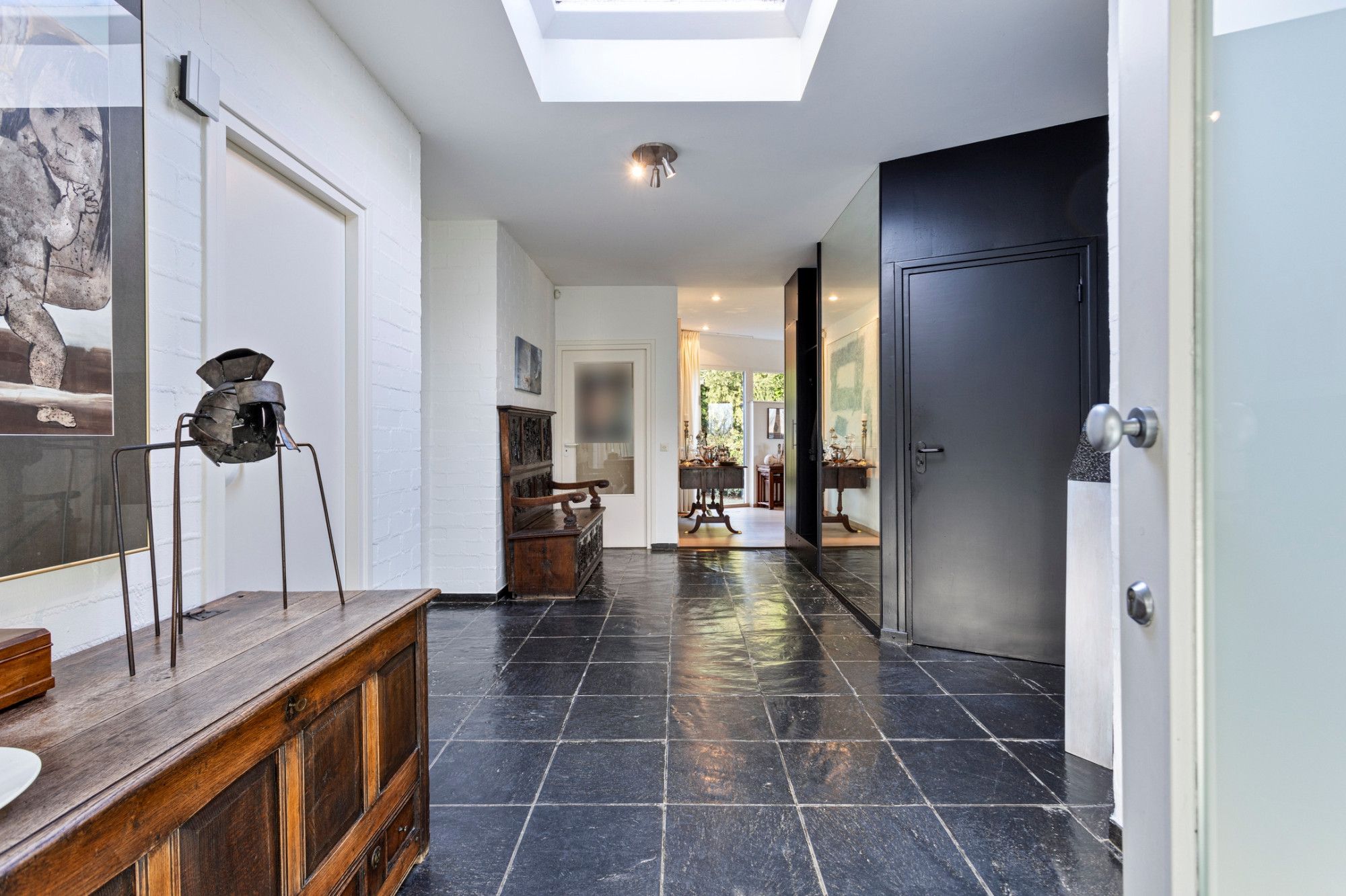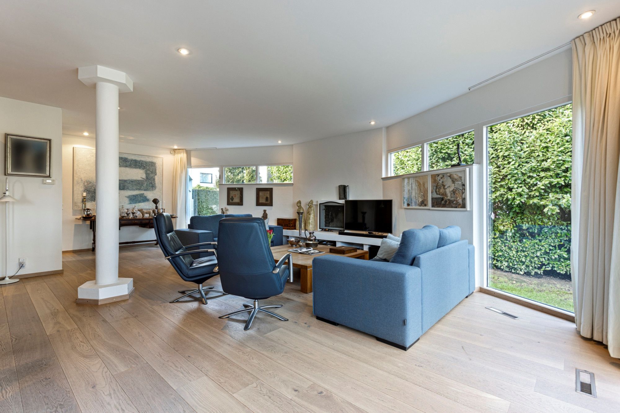 U komt binnen in de royale betegelde hal die u verwelkomt door het ruimtelijk design en de lichtinval door de dakkoepel. Hier bevinden zich het toilet, garderobe en de meterkast. Vanuit deze hal heeft u aan uw rechterzijde toegang tot de keuken, aan de linkerzijde bevindt zich de eerste slaapkamer, op dit moment in gebruik als kantoor. Zowel vanuit de hal als vanuit de keuken is er toegang tot de living met hoge ramen die veel natuurlijk licht toelaten en met vrij uitzicht naar de tuin aan de achterzijde, een ontspannen plek waar u graag wil vertoeven. Via openslaande deuren is er toegang tot het terras/tuin. De living (ca. 55m²), bestaande uit een woon- en eetgedeelte, is voorzien van een lichte parketvloer en open haard. De keuken (17m²) heeft rechts een rechte rijopstelling met onder- en bovenkasten met diverse inbouwapparatuur zoals 5-pits inductiekookplaat, afzuigkap, vaatwasser. Er tegenover bevindt zich een hoge kastenwand met daarin opgenomen een combimagnetron en koelkast met separate vriezer. De keukenvloer is betegeld (marmer). De strakke badkamer (ca.8 m²), comfortabel met vloerverwarming, grotendeels betegeld en voorzien van inbouwspots), is voorzien van een ligbad, inloopdouche en een sanitair meubel met dubbele wastafel. Slaapkamer I (ca.9m²) is gelegen aan de oostzijde van de woning. De resterende 3 slaapkamers (respectievelijk ca.13m²,13m² en 15m²) zijn allen voorzien van laminaatvloeren, veel daglichttoetreding en een mooi uitzicht op de tuin.