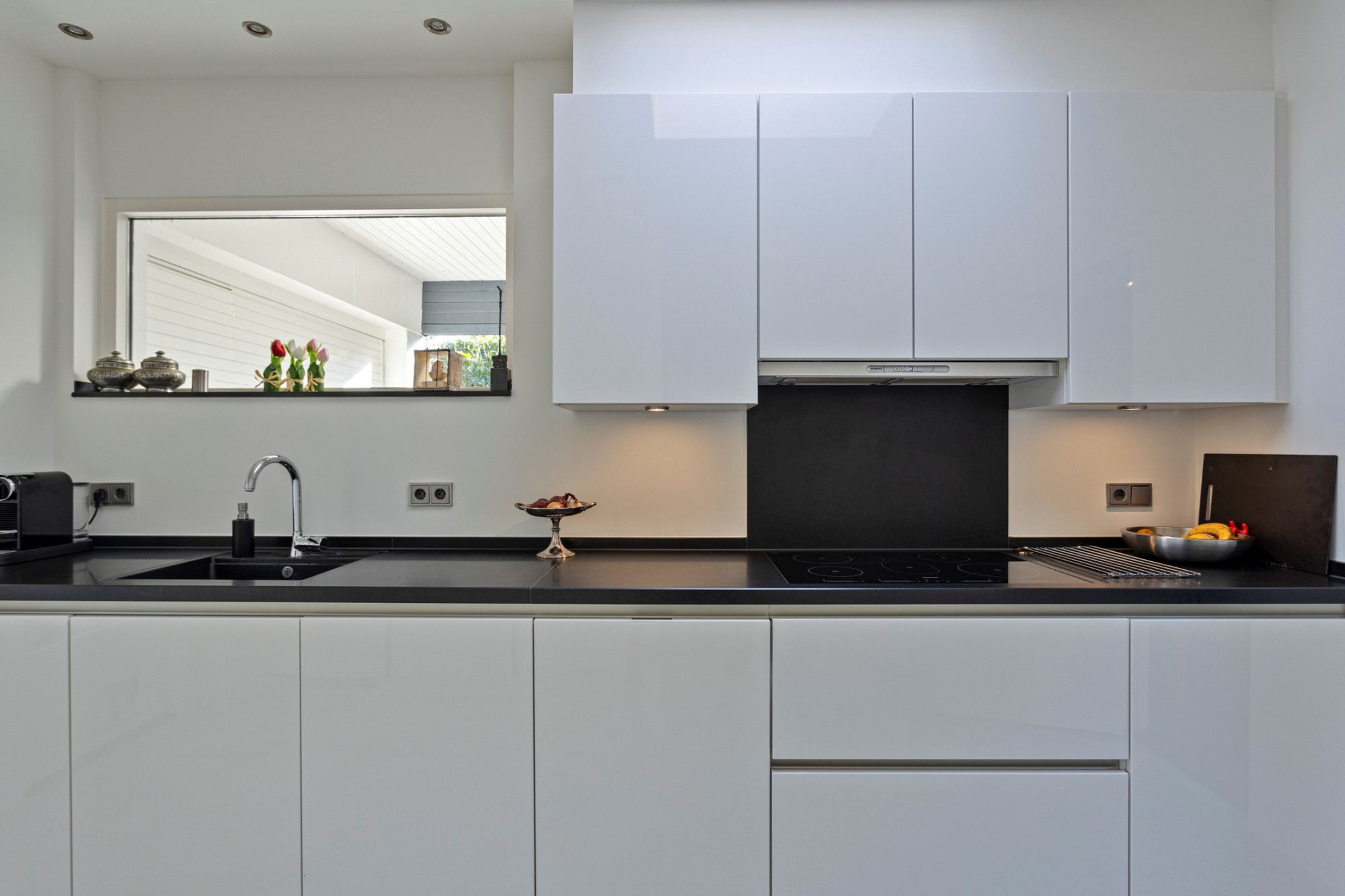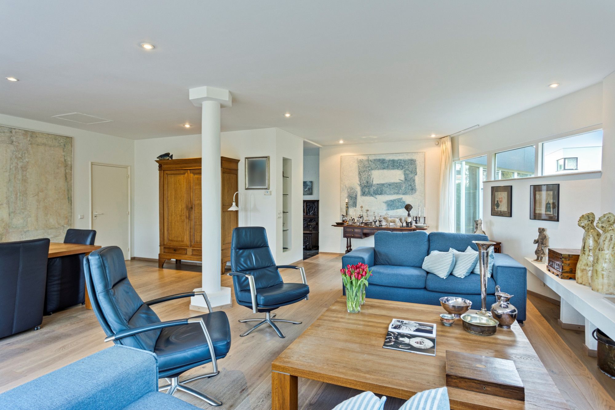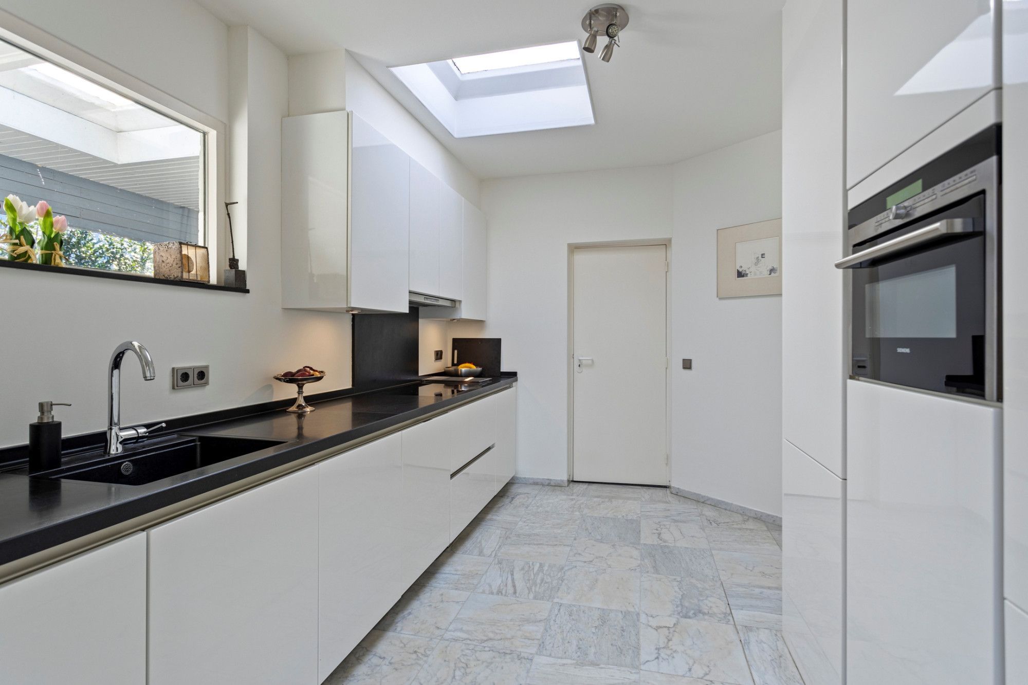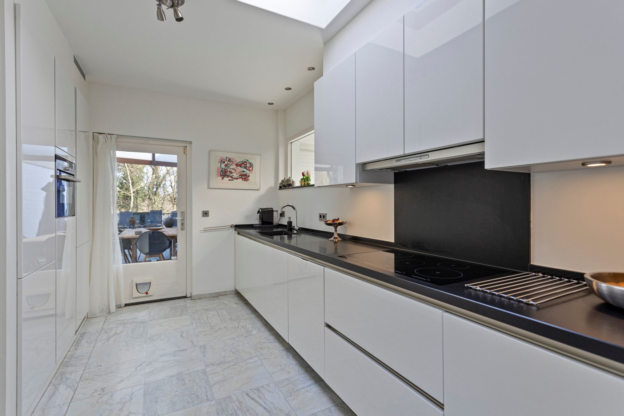 U komt binnen in de royale betegelde hal die u verwelkomt door het ruimtelijk design en de lichtinval door de dakkoepel. Hier bevinden zich het toilet, garderobe en de meterkast. Vanuit deze hal heeft u aan uw rechterzijde toegang tot de keuken, aan de linkerzijde bevindt zich de eerste slaapkamer, op dit moment in gebruik als kantoor. Zowel vanuit de hal als vanuit de keuken is er toegang tot de living met hoge ramen die veel natuurlijk licht toelaten en met vrij uitzicht naar de tuin aan de achterzijde, een ontspannen plek waar u graag wil vertoeven. Via openslaande deuren is er toegang tot het terras/tuin. De living (ca. 55m²), bestaande uit een woon- en eetgedeelte, is voorzien van een lichte parketvloer en open haard. De keuken (17m²) heeft rechts een rechte rijopstelling met onder- en bovenkasten met diverse inbouwapparatuur zoals 5-pits inductiekookplaat, afzuigkap, vaatwasser. Er tegenover bevindt zich een hoge kastenwand met daarin opgenomen een combimagnetron en koelkast met separate vriezer. De keukenvloer is betegeld (marmer). De strakke badkamer (ca.8 m²), comfortabel met vloerverwarming, grotendeels betegeld en voorzien van inbouwspots), is voorzien van een ligbad, inloopdouche en een sanitair meubel met dubbele wastafel. Slaapkamer I (ca.9m²) is gelegen aan de oostzijde van de woning. De resterende 3 slaapkamers (respectievelijk ca.13m²,13m² en 15m²) zijn allen voorzien van laminaatvloeren, veel daglichttoetreding en een mooi uitzicht op de tuin.