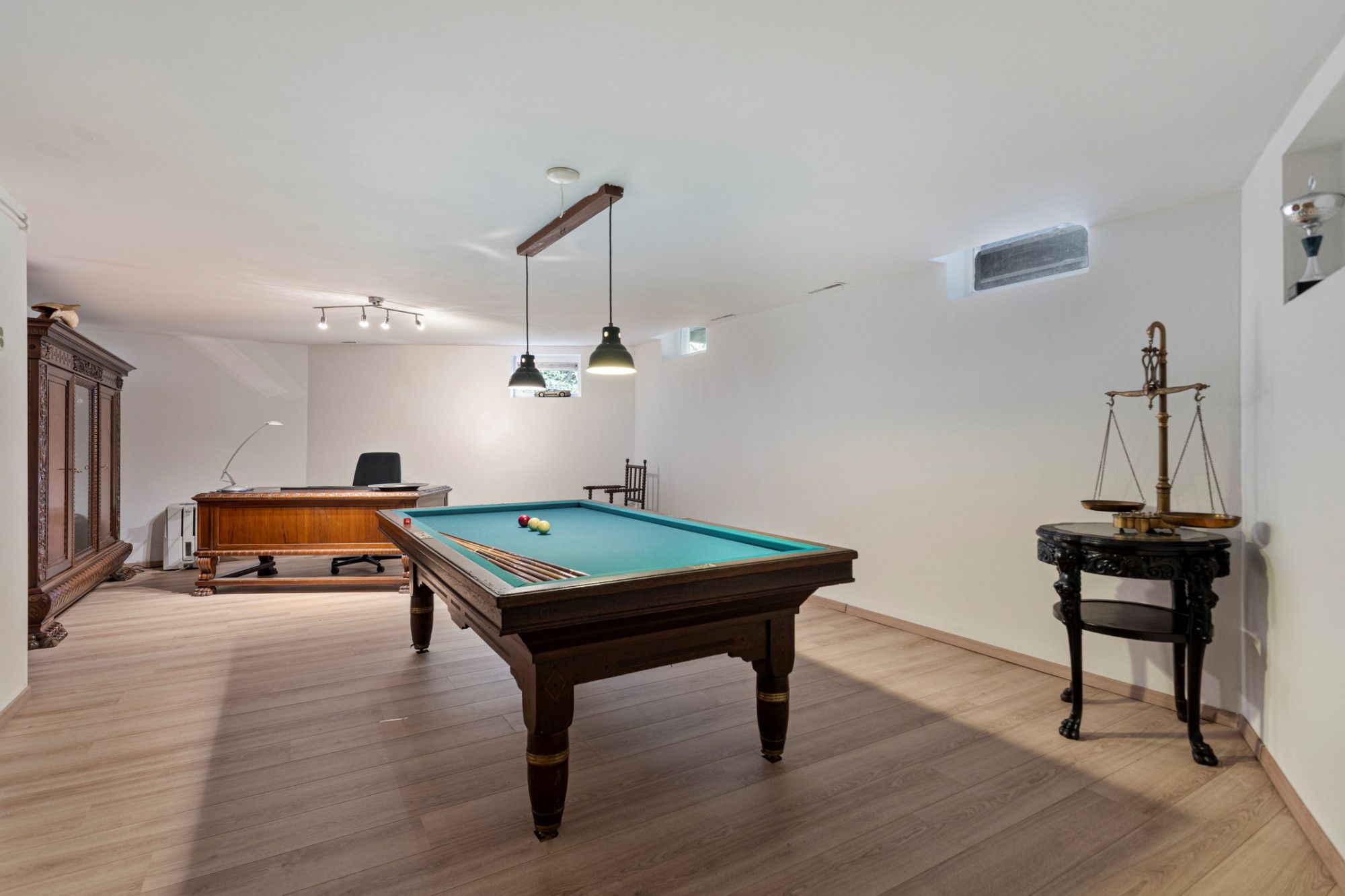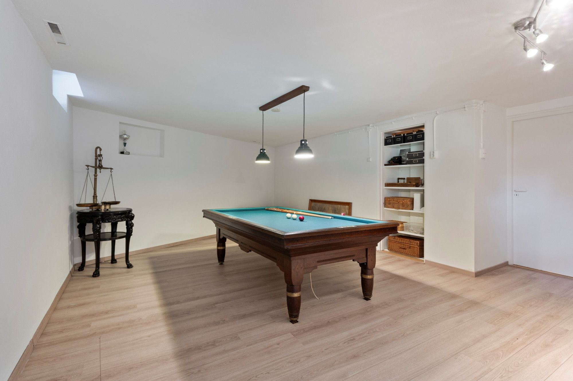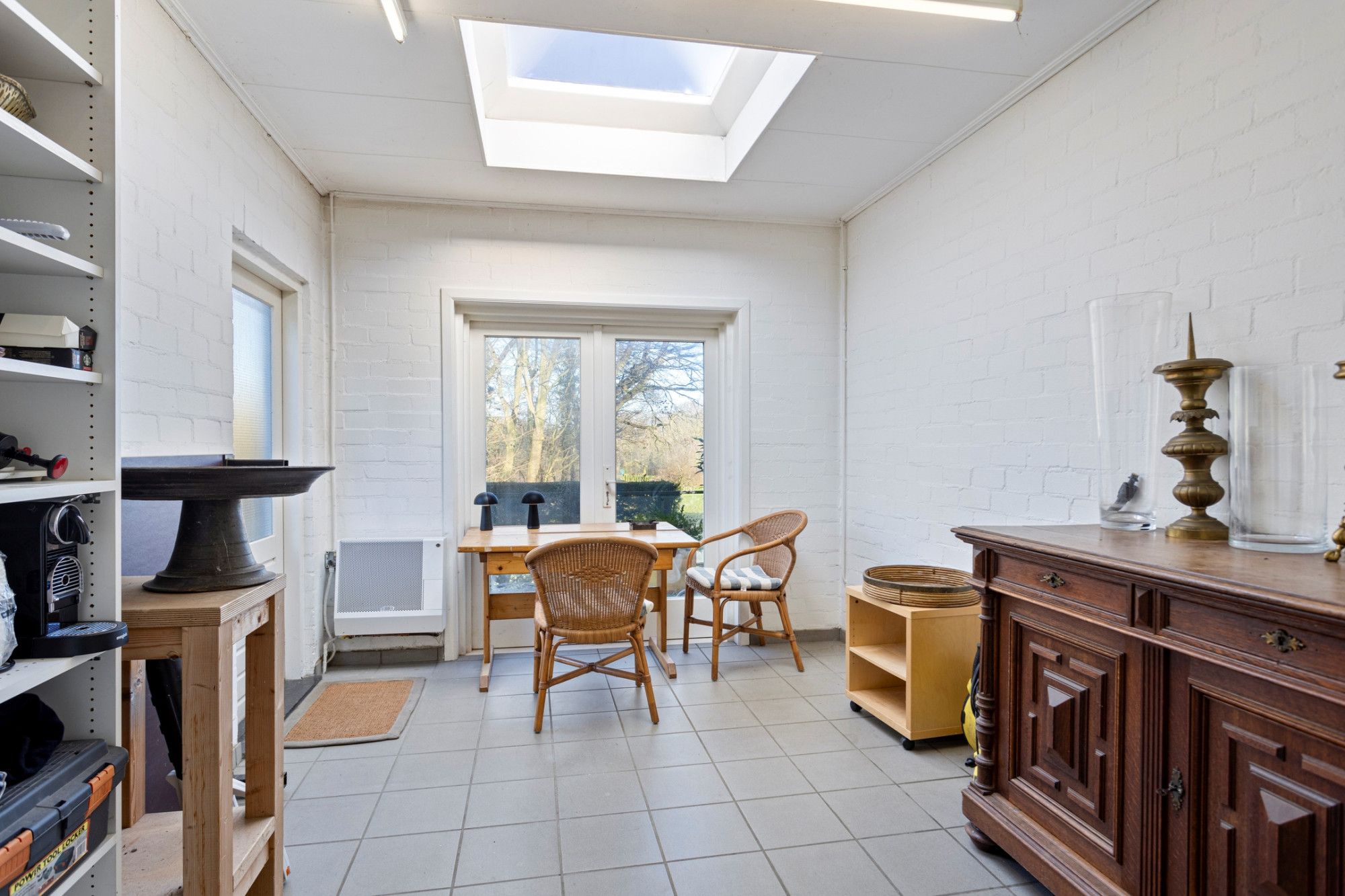 Het souterrain is opgedeeld in verschillende ruimtes; een toilet met douchemogelijkheid, cv-ruimte, bergruimte en een royale multifunctionele ruimte. De multifunctionele ruimte (ca.31m²) kan uiteraard dienstdoen als kantoor, muziekruimte, home gym of bibliotheek en is voorzien van een laminaat vloer. De toiletruimte (ca.3m²) beschikt over een staand toilet (sanibroyeur), een wastafel in meubel en een douche. Vanuit deze badkamer is de kruipruimte toegankelijk. In de cv-ruimte (ca.8m²) bevinden zich de heteluchtverwarming, de boiler en het witgoed.