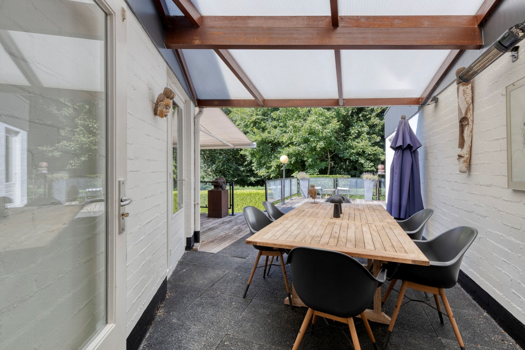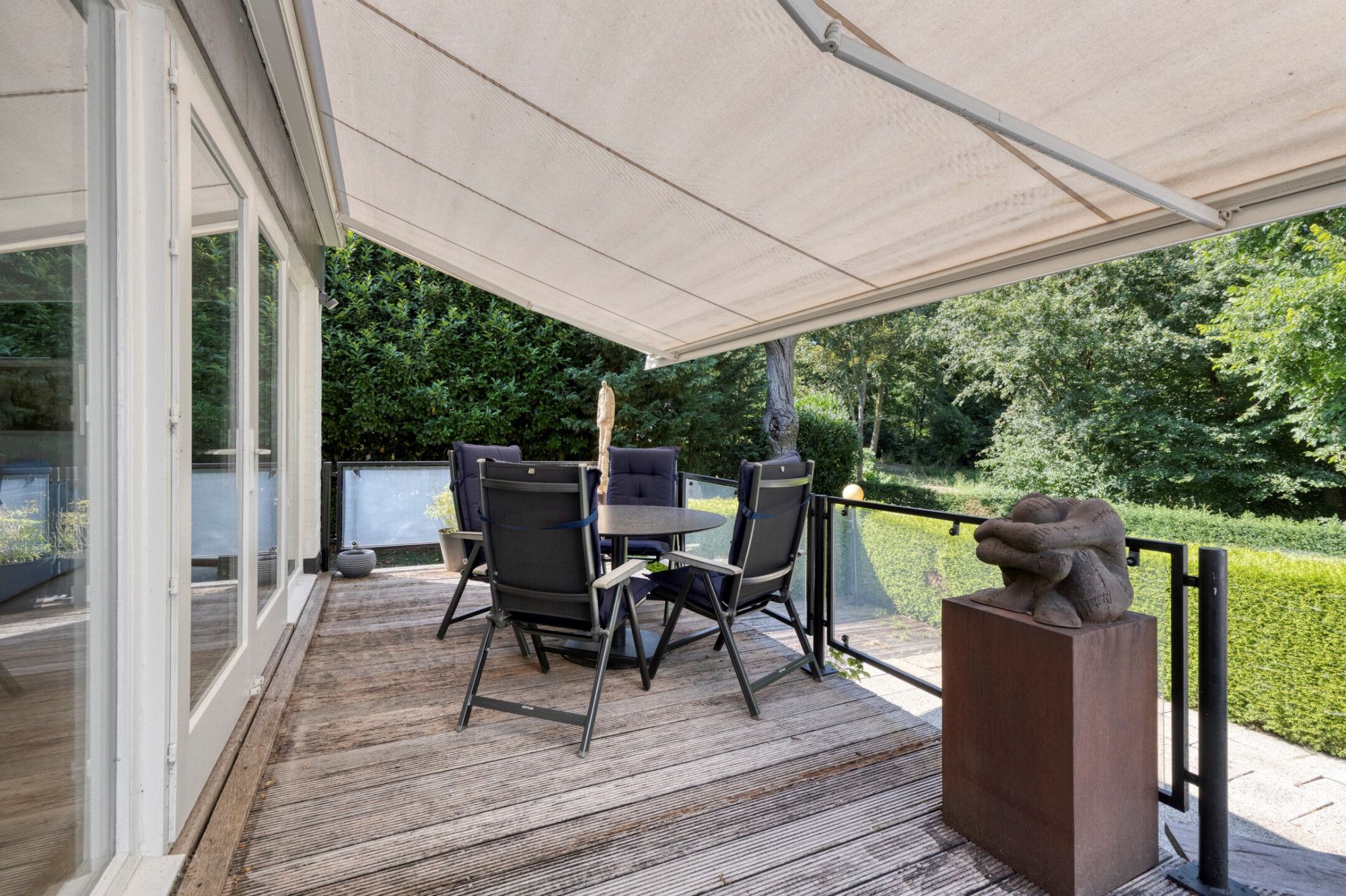 De grote tuin rondom de woning gelegen voorziet in veel ruimte en biedt privacy en legio mogelijkheden. Aan de achterzijde van de woning zijn over de gehele breedte van de woning meerdere terrassen waar diverse zitplekken mogelijk zijn. Ook is er een breed zonnescherm aanwezig op het terras en sfeervolle buitenverlichting die automatisch aanspringt. Via een toegangspoort rechts en links van de woning komt men in de achtertuin. De voortuin is onderhoudsvriendelijk aangelegd met gazon en een brede oprit met carport die het parkeren van meerdere voertuigen op eigen terrein mogelijk maakt.