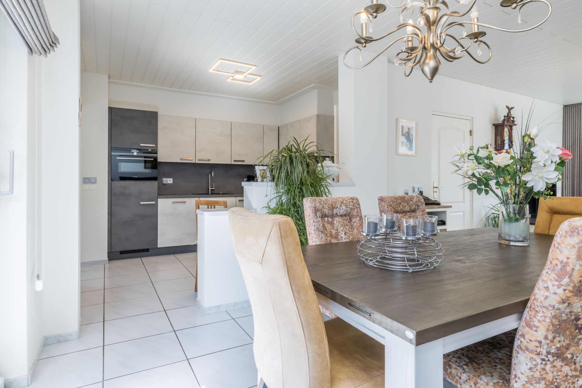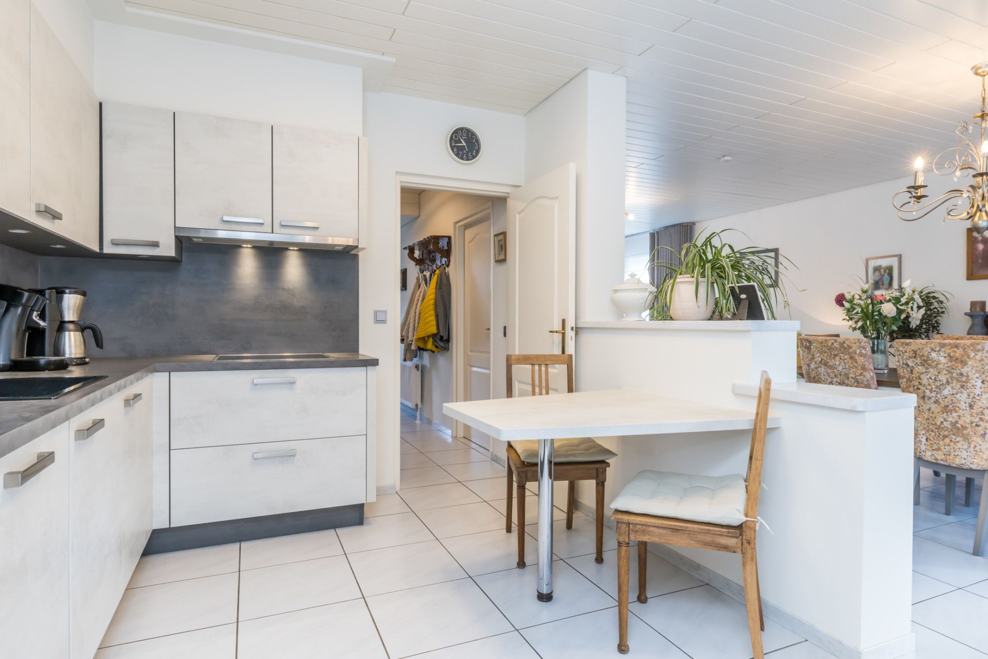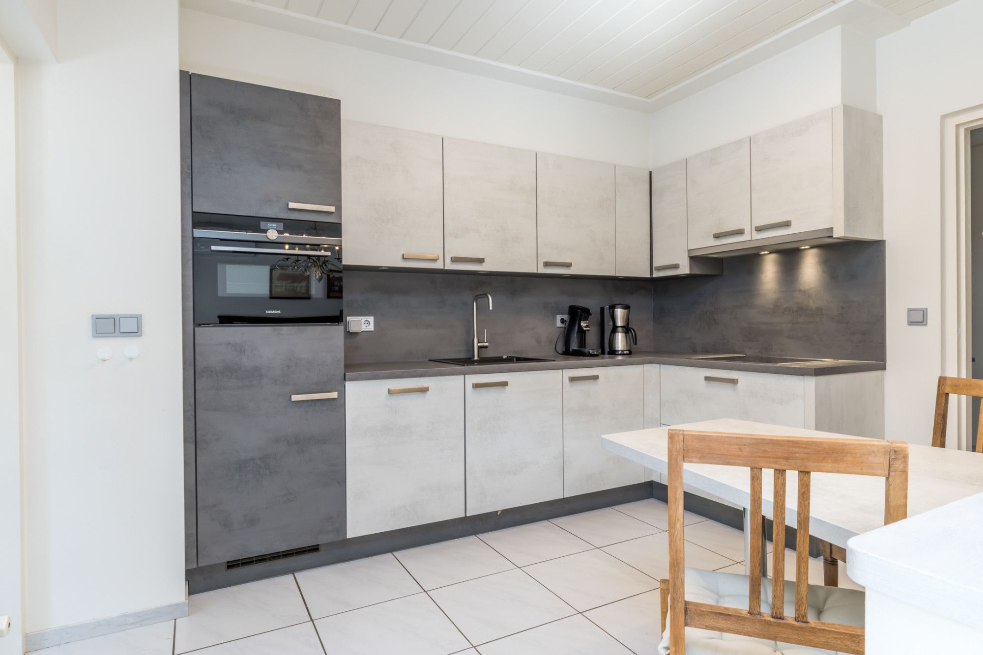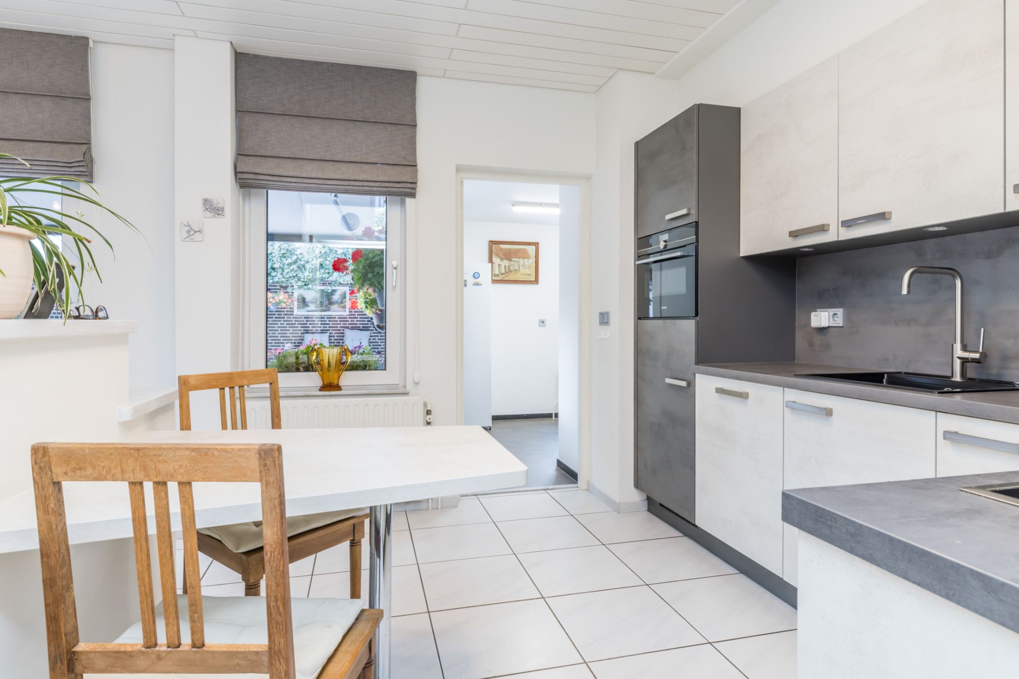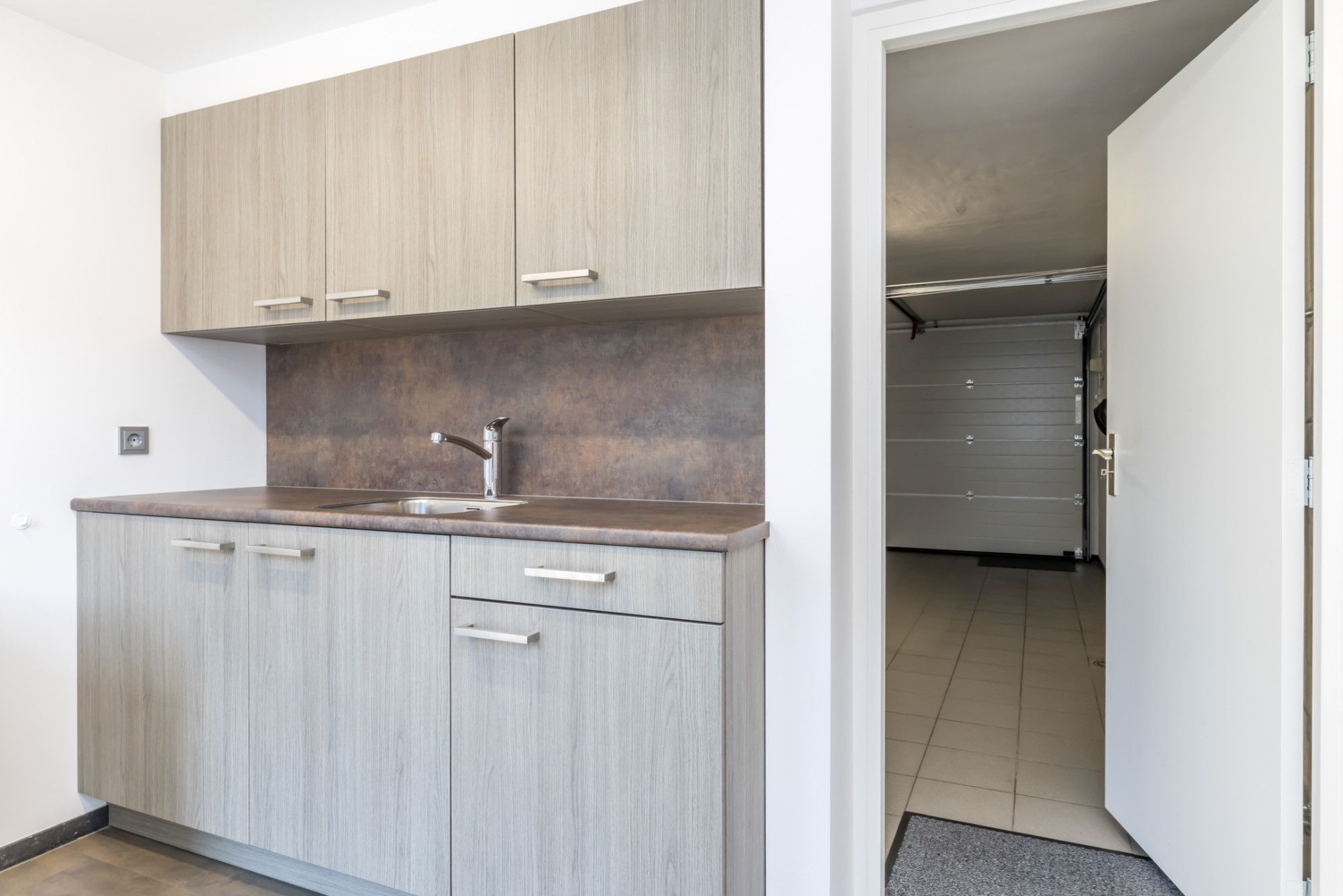 De halfopen keuken is voorzien van een inbouwkeuken in hoekopstelling met de volgende apparatuur: koelkast, gootsteen, vaatwasser, combi-oven en keramische kookplaat met afzuiging. Vanuit de keuken is de bijkeuken bereikbaar, die is uitgerust met was- en droogaansluitingen en een keukenblok met gootsteen. Via de bijkeuken is zowel de achtertuin toegankelijk als de garage. De verwarmde garage beschikt eveneens over een witgoedaansluiting en is voorzien van een elektrische sectionaalpoort.