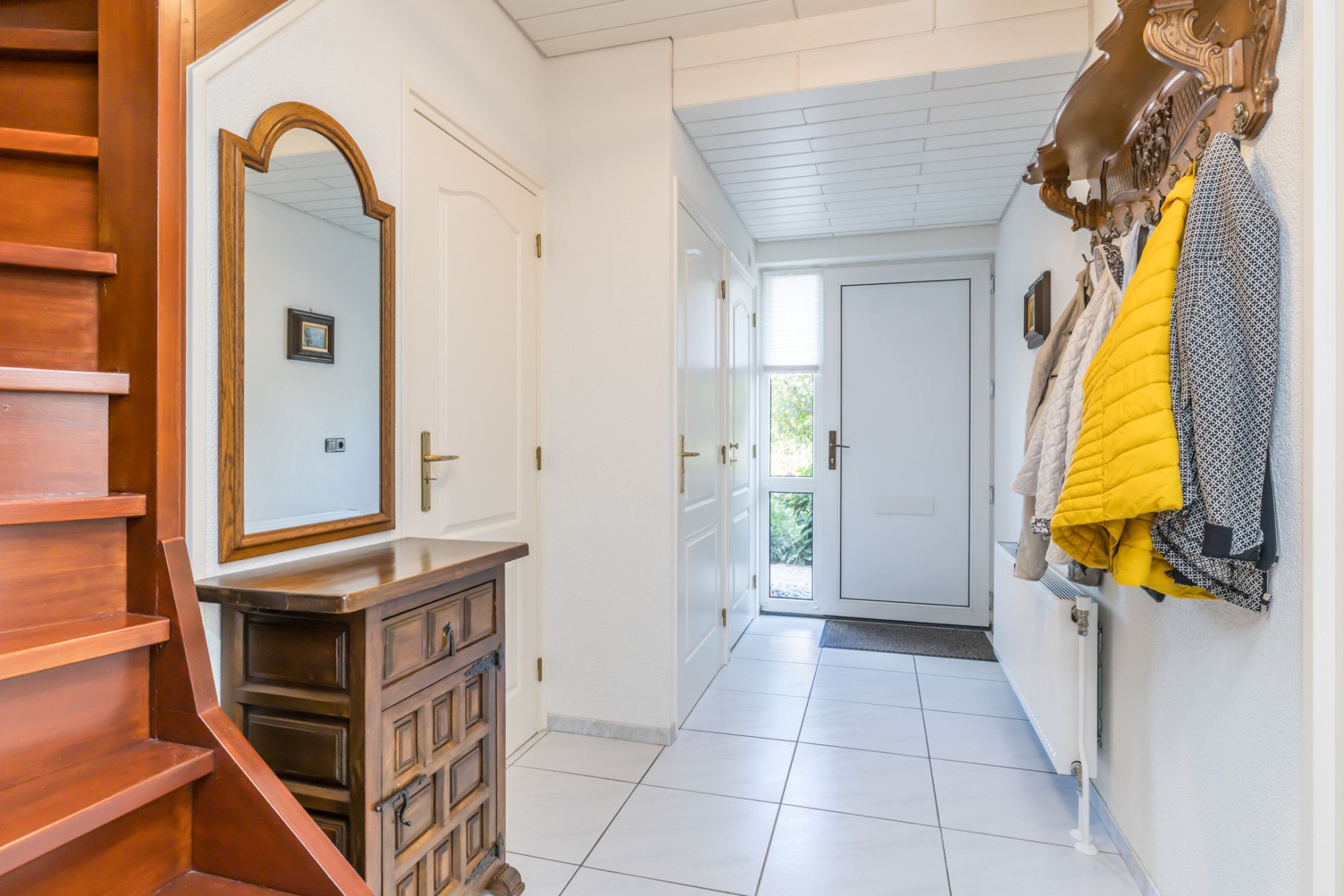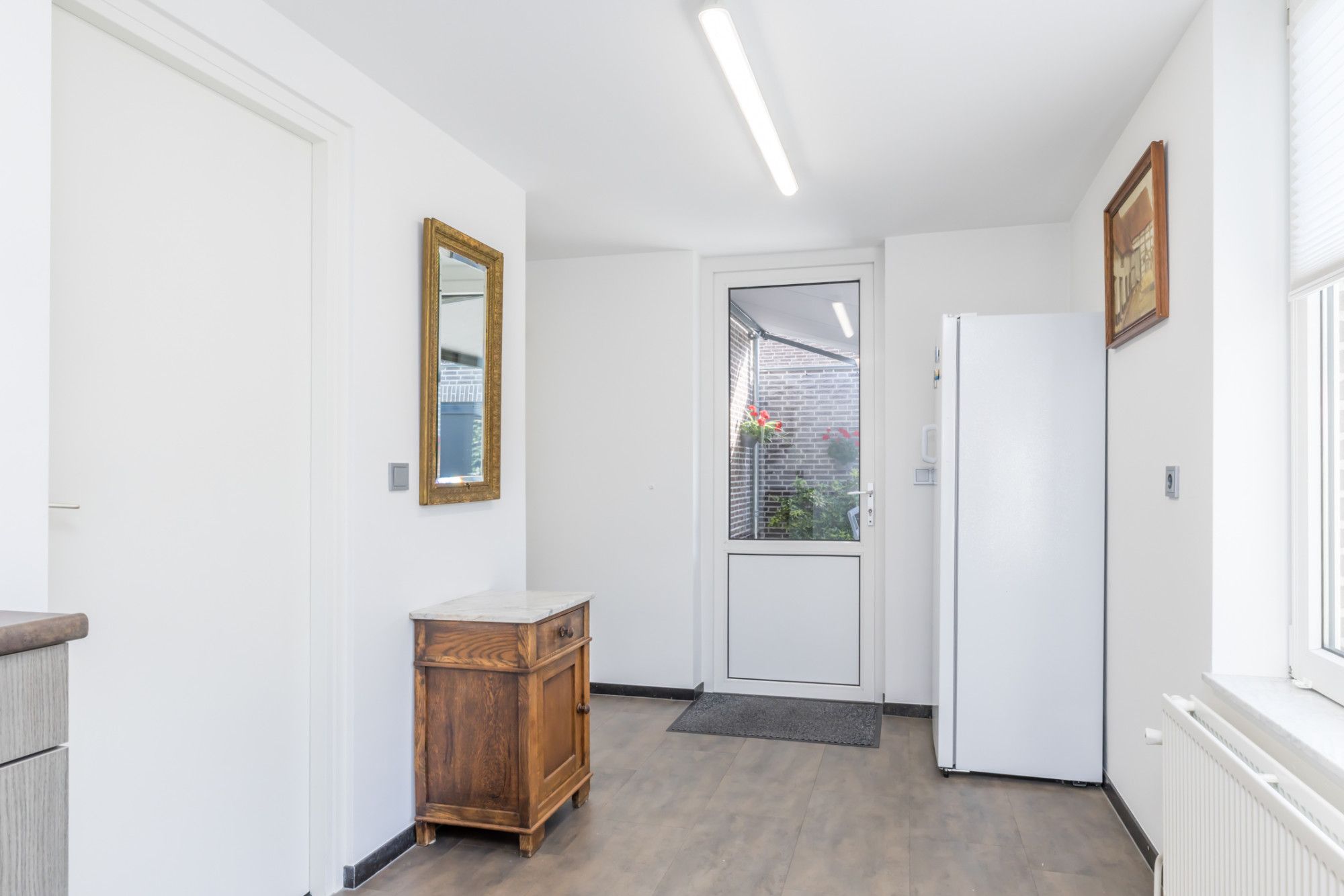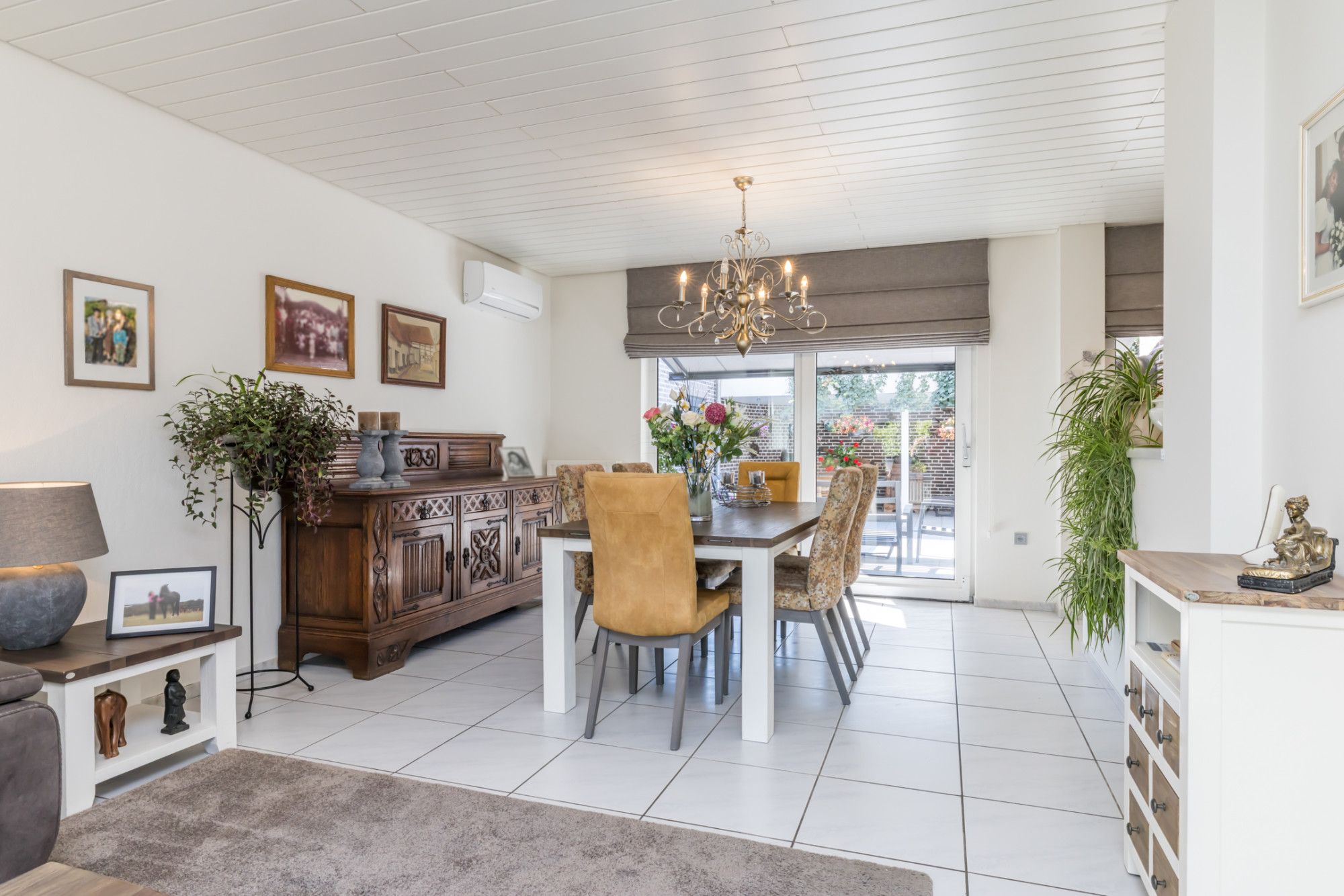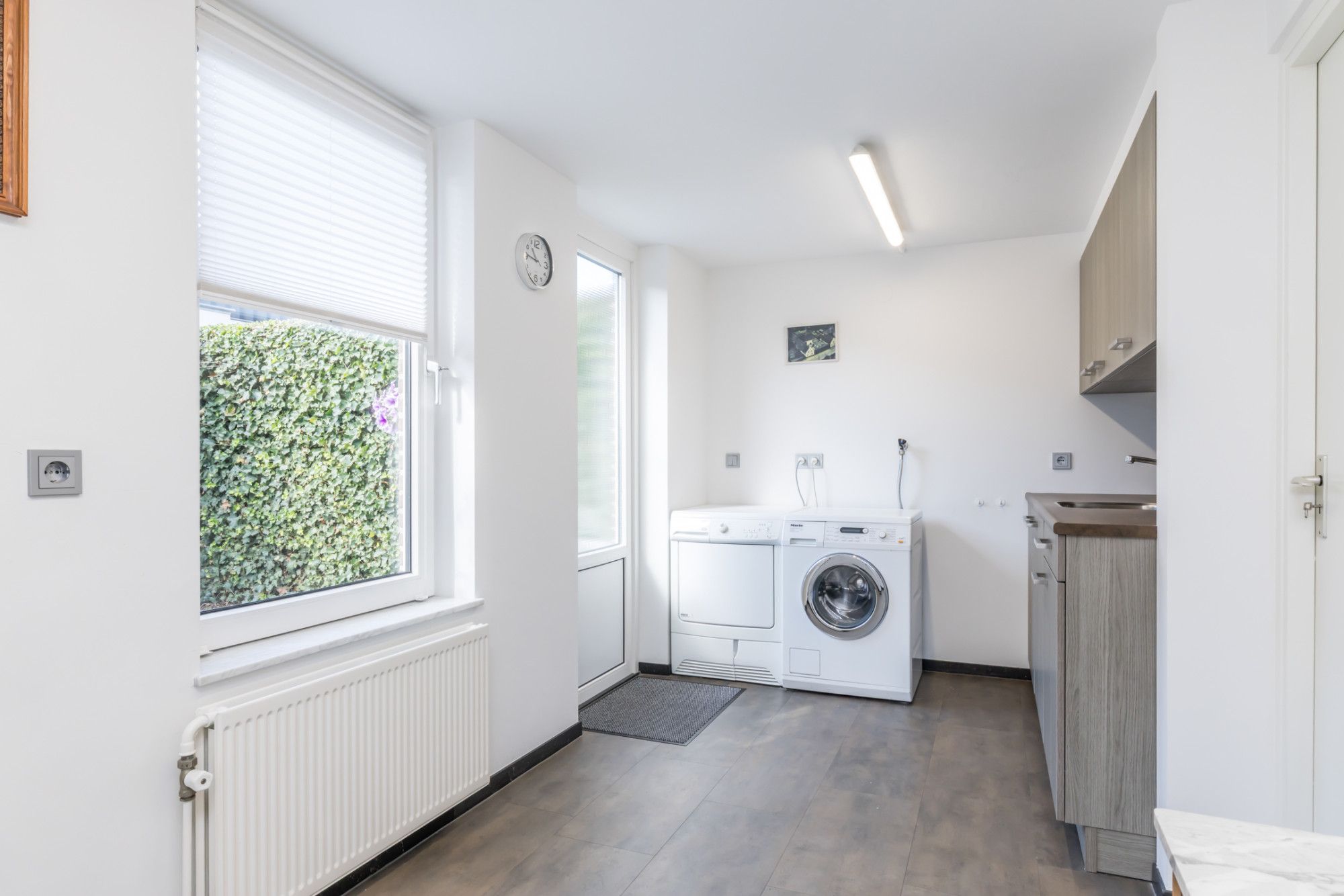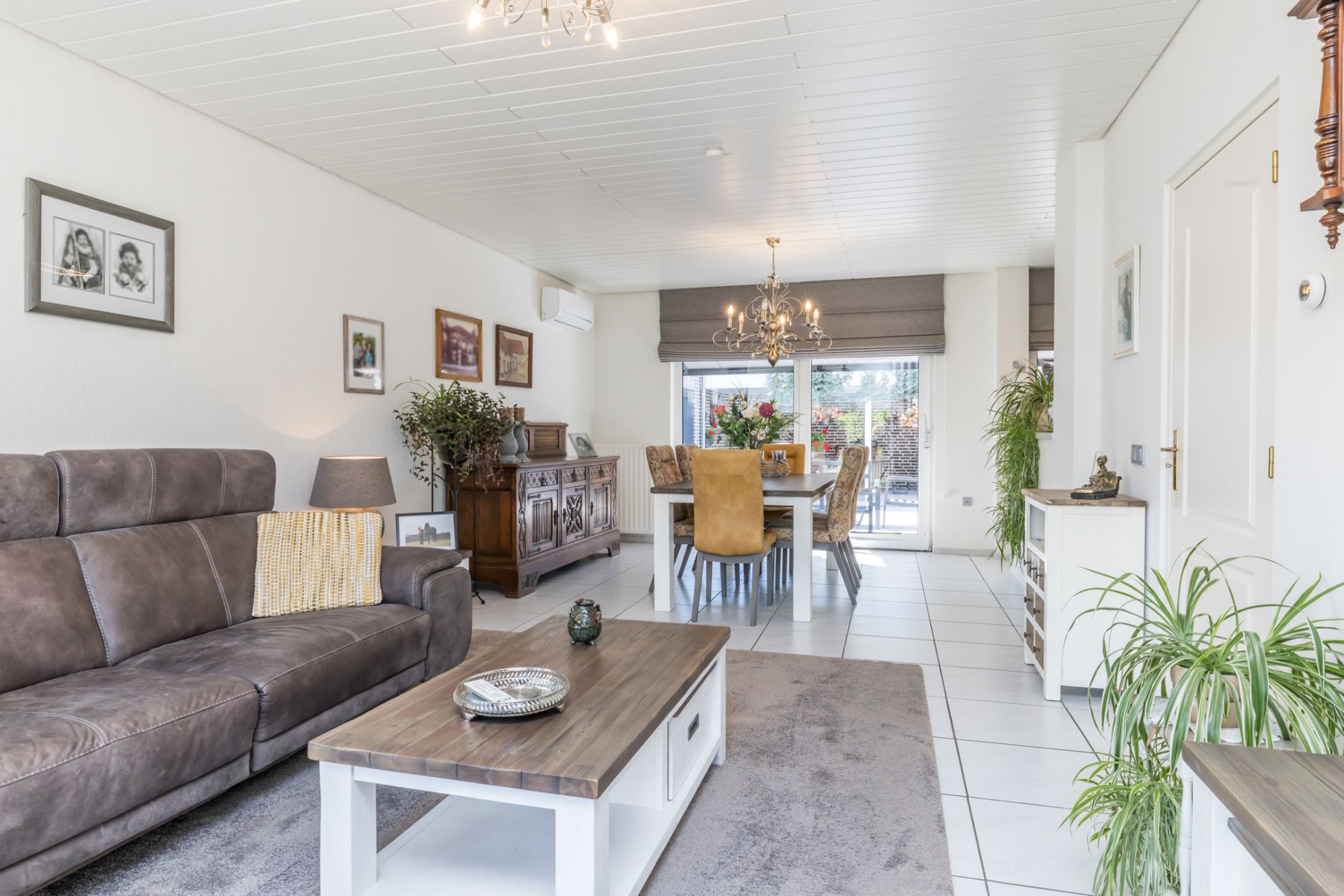 De hal biedt toegang tot de meterkast, toiletruimte, woonkamer, keuken, trapopgang naar de verdieping en een praktische berging onder de trap. De toiletruimte is uitgerust met een staand closet en een fonteintje. De woonkamer, met een oppervlakte van circa 32 m², is ingedeeld in een zitgedeelte aan de voorzijde en een eetgedeelte aan de achterzijde van de woning. Dankzij de grote raampartijen aan zowel de voor- als achterzijde baadt deze leefruimte in natuurlijk daglicht. De schuifpui in de eetkamer zorgt voor direct tuincontact en een prettige binnen-buitenbeleving. Bovendien is hier airconditioning aanwezig.