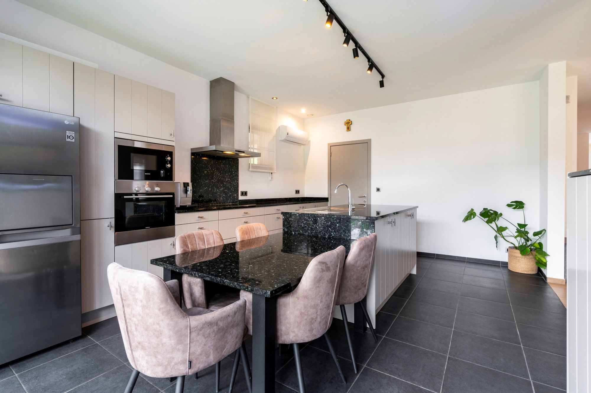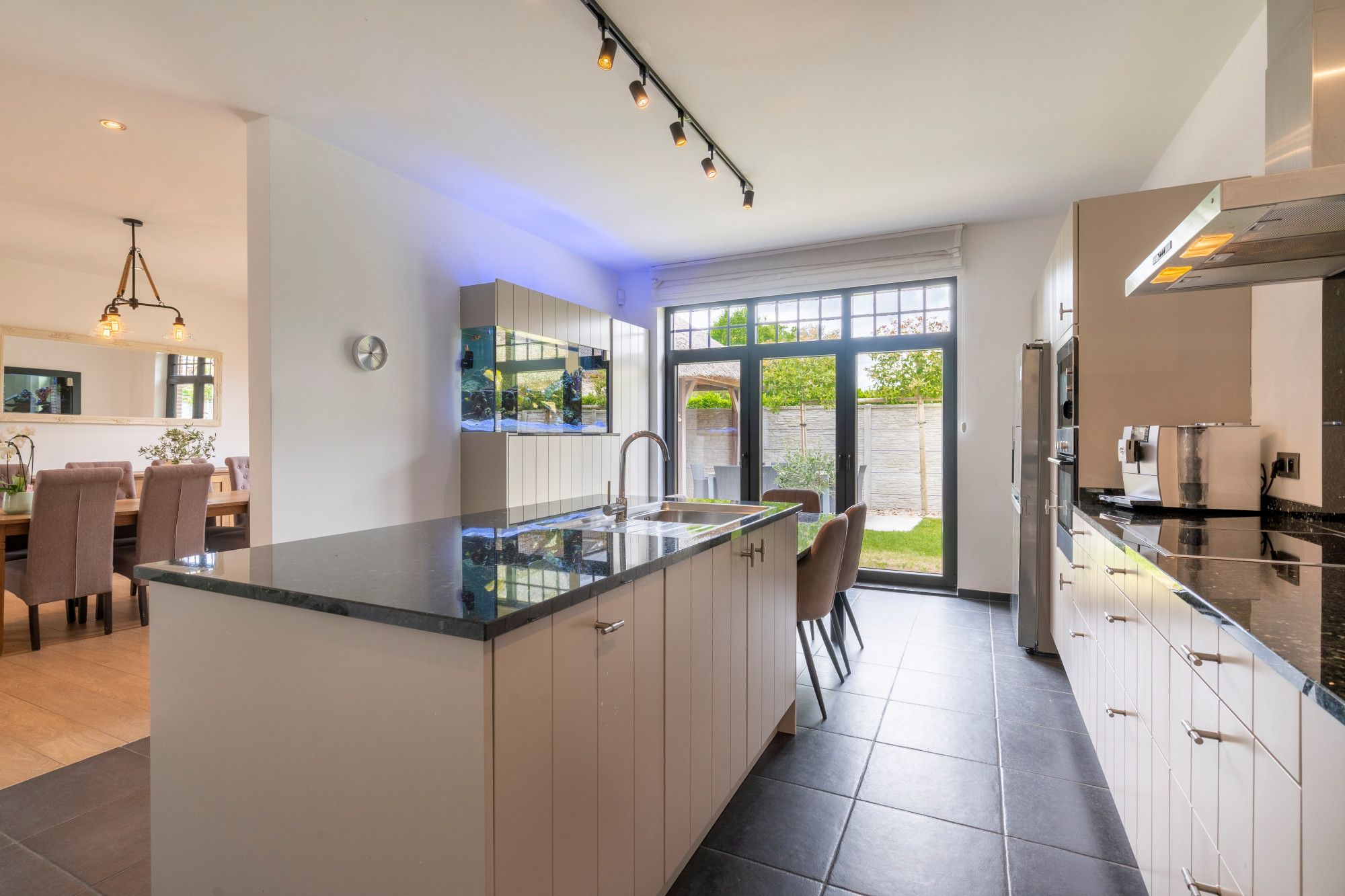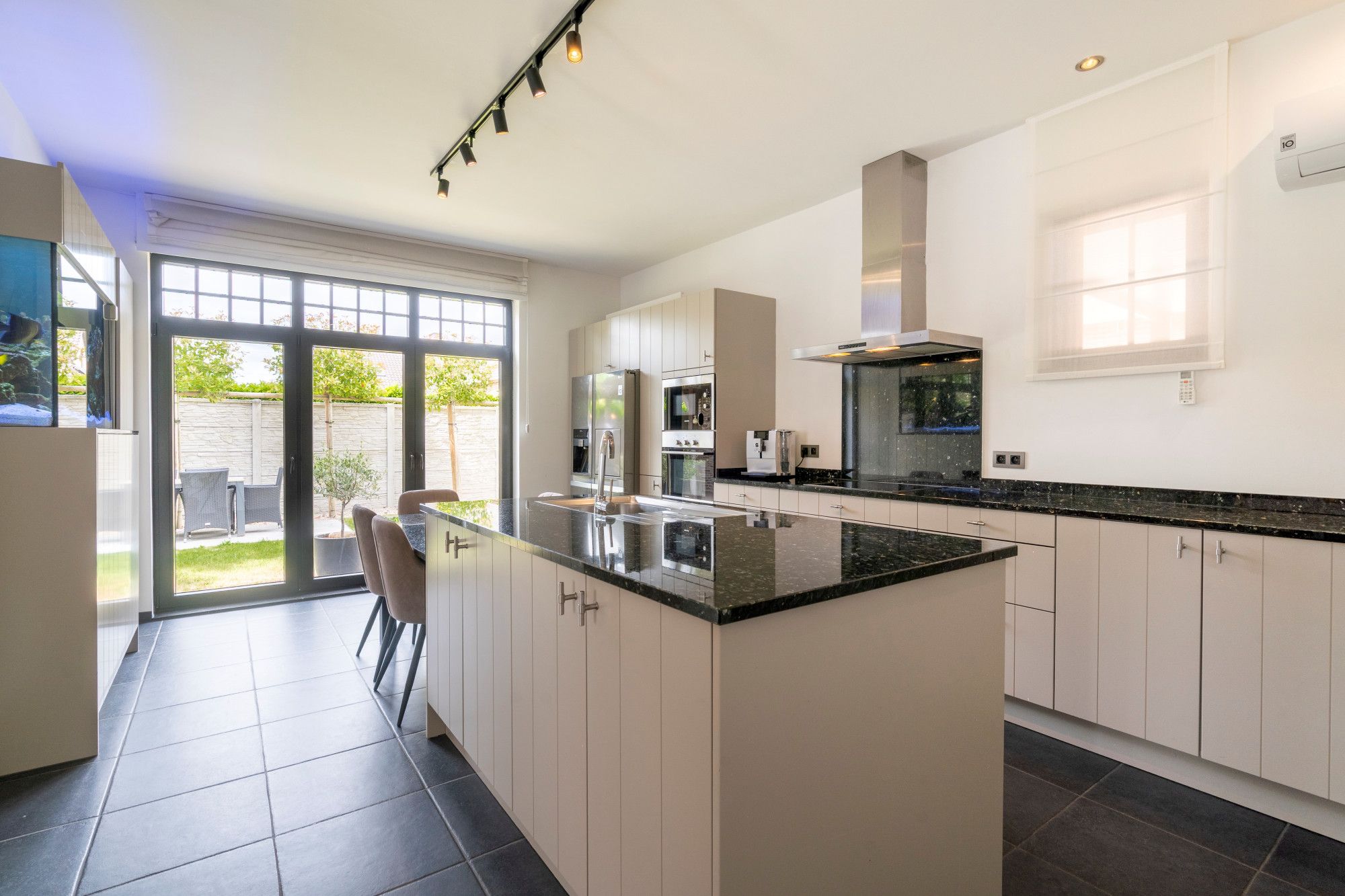 The bespoke kitchen is fitted with low and high cabinets with work surfaces and dining area in natural stone (granite grading), A-brand appliances, large sink with verlek, 90 cm induction hob and matching extractor hood, dishwasher, oven, microwave and an American fridge.