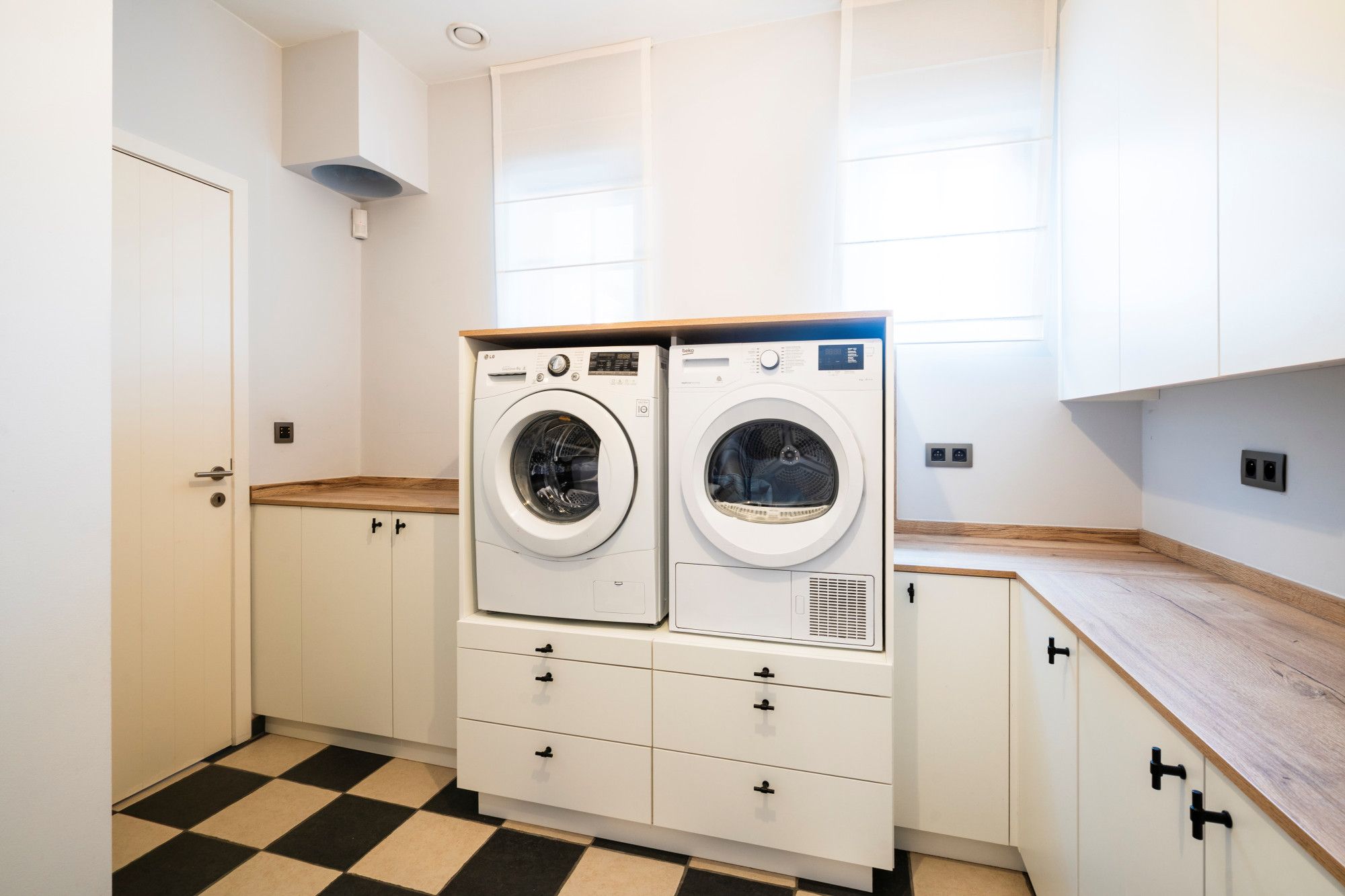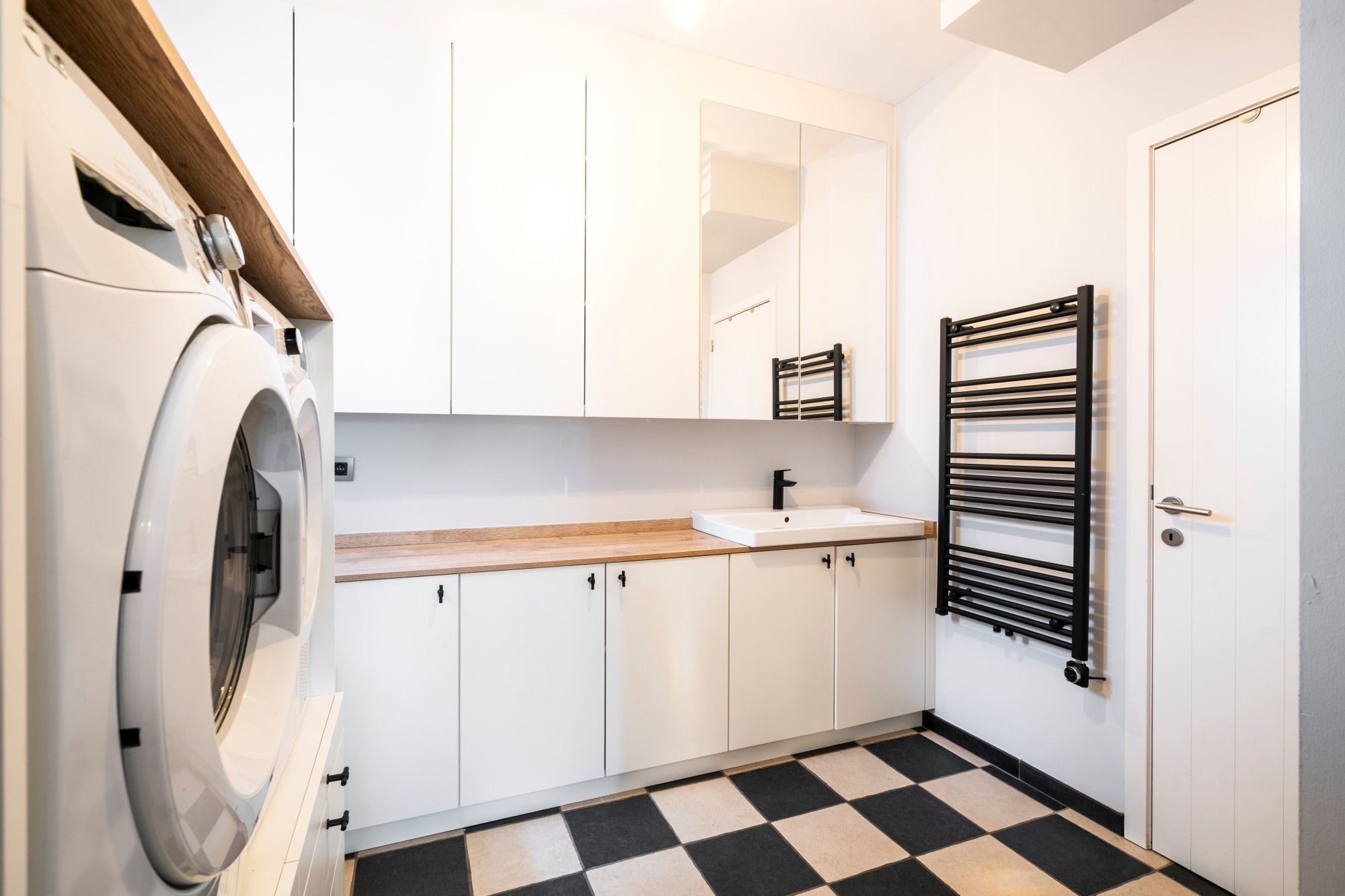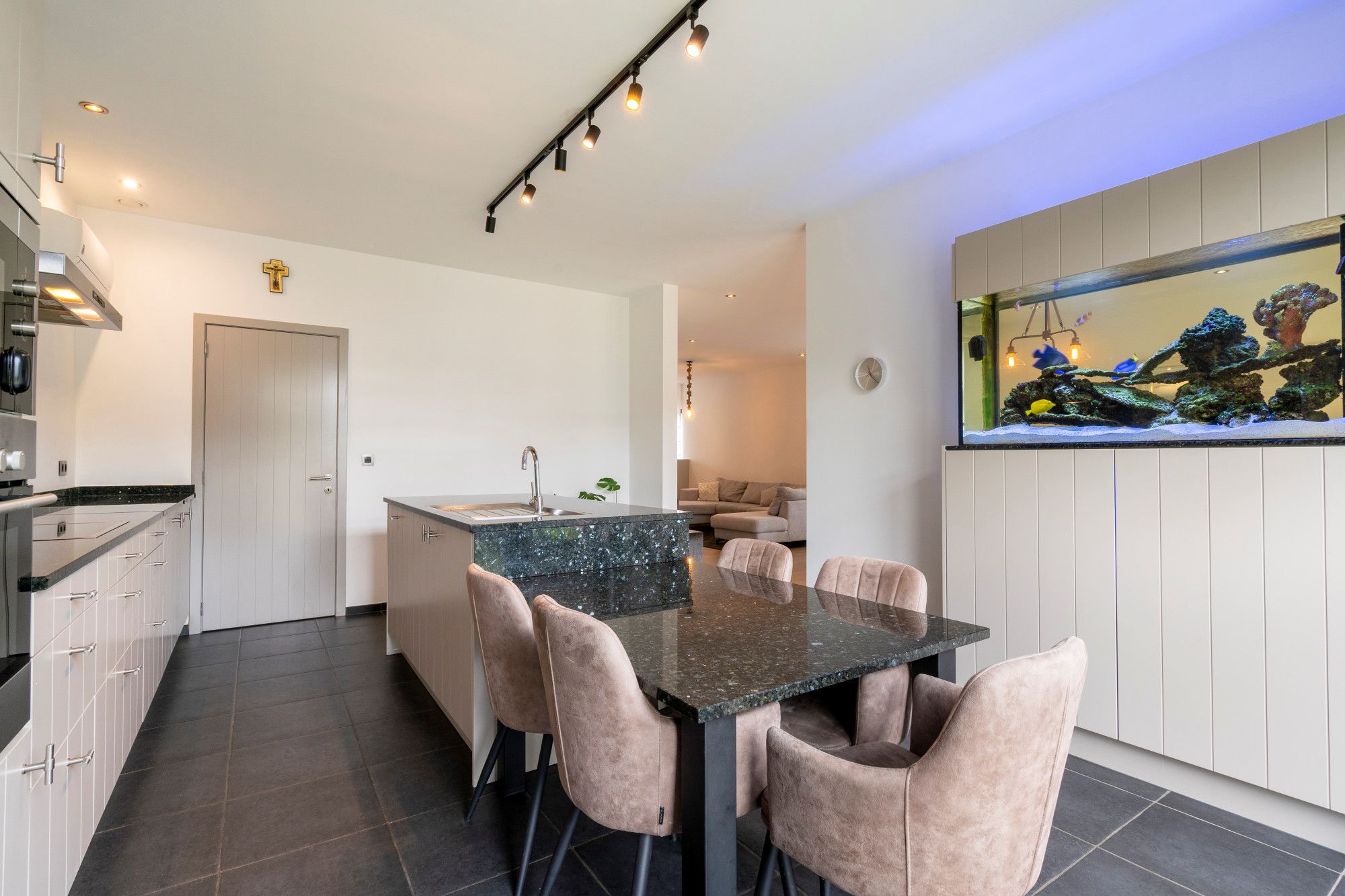 The bespoke kitchen is fitted with low and high cabinets with work surfaces and dining area in natural stone (granite grading), A-brand appliances, large sink with verlek, 90 cm induction hob and matching extractor hood, dishwasher, oven, microwave and an American fridge.
