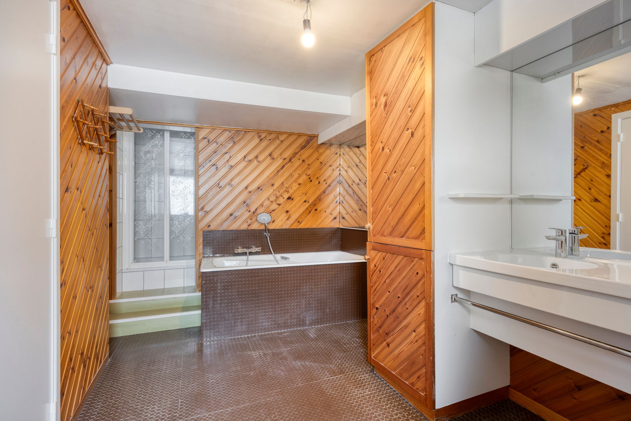 - Badkamer met douche, ligbad en twee wastafels in meubel