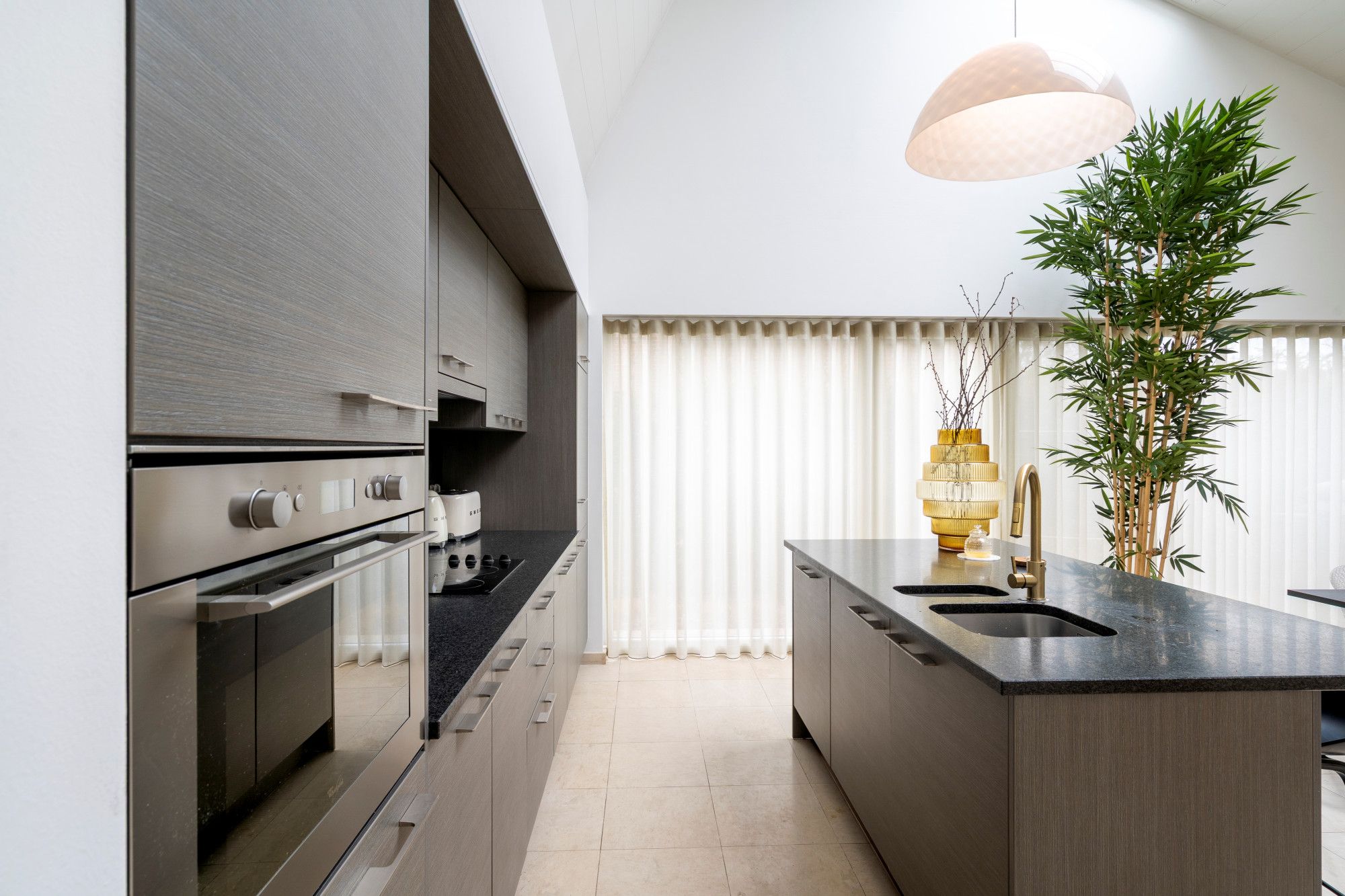 The kitchen in a whole of lower and upper cabinets is equipped with granite worktop, induction hob and extractor hood, combination oven, dishwasher and single sink.