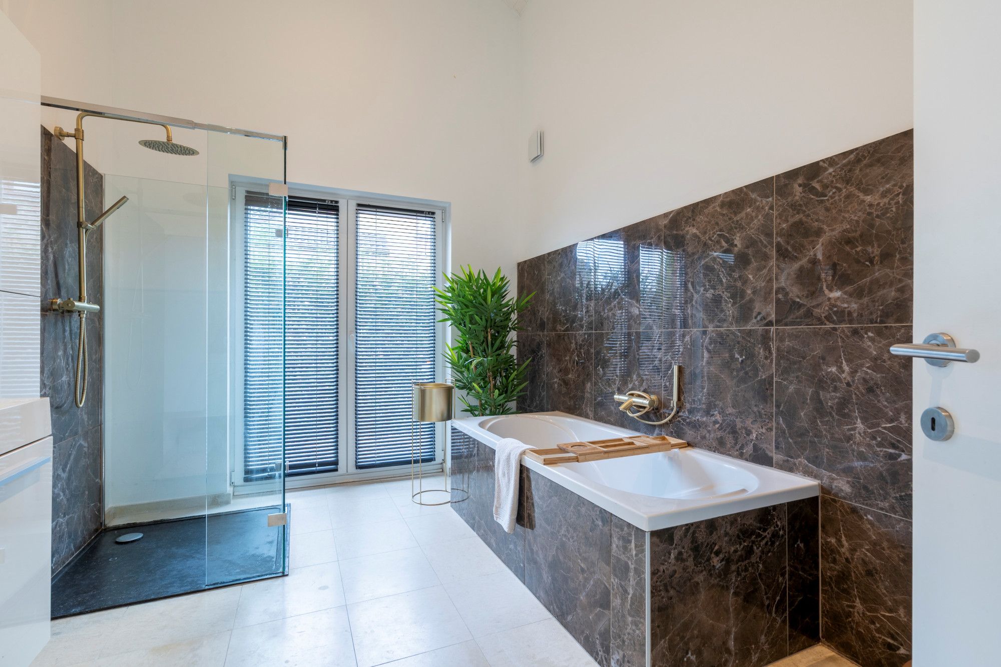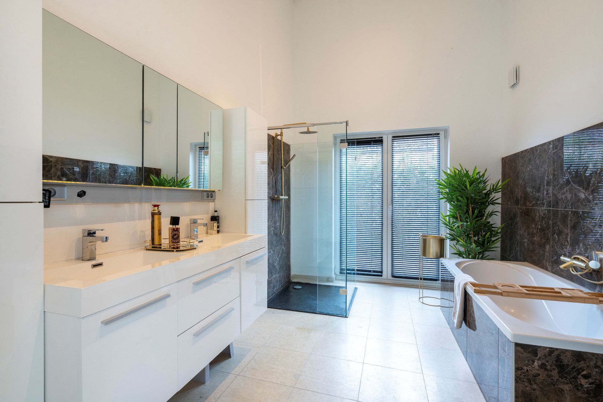 The bathroom is installed with a vanity unit, walk-in shower and bathtub.