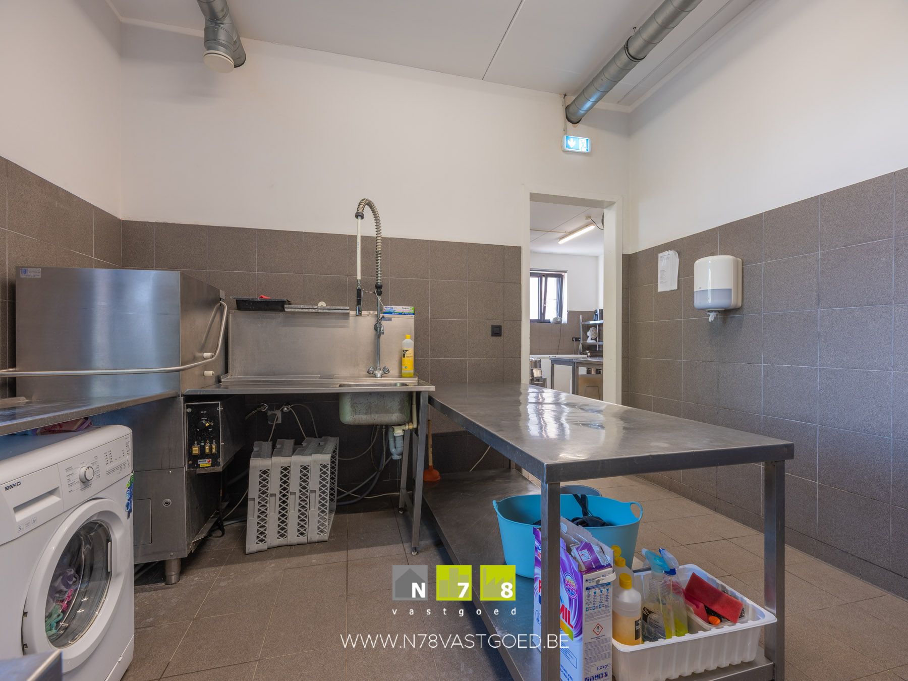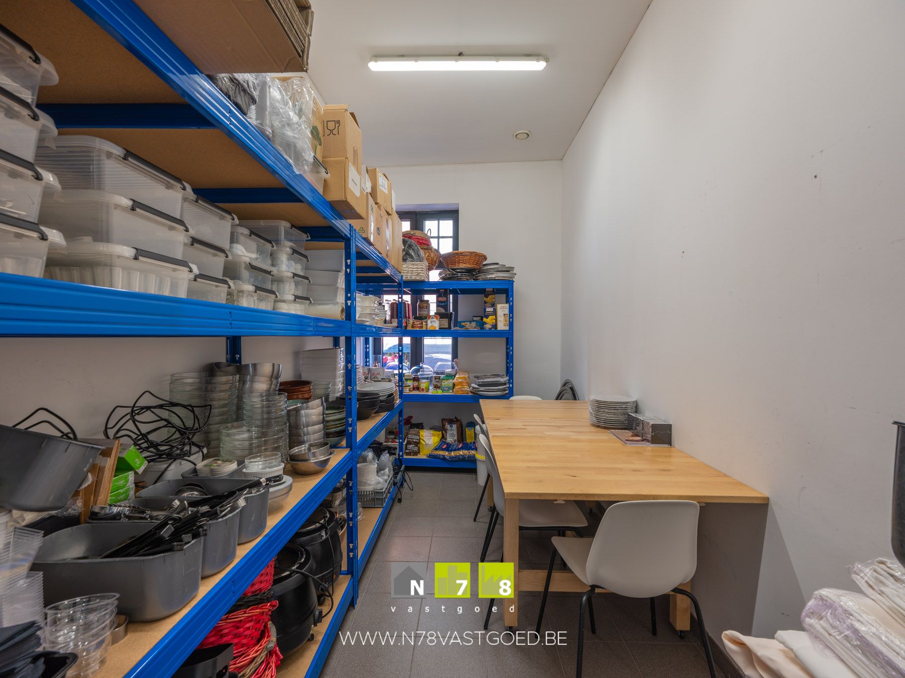 - Winkelruimte (32,20m²): ingericht met keukenmeubel, onderkast & lades, lavabo, airco, tegelvloer.