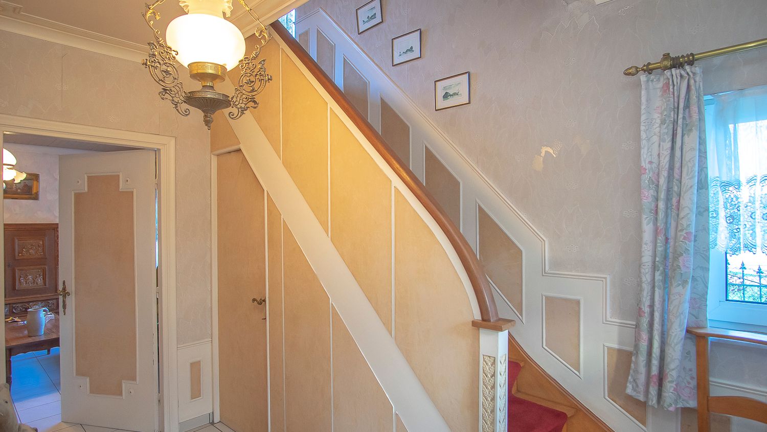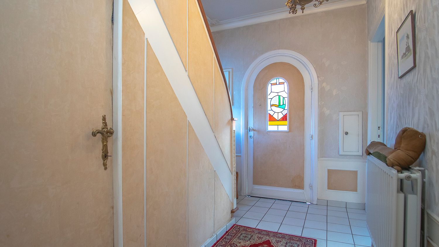 - Inkom: (2,20 m x 3,35 m = 7,37 m²) – hal met houten trap naar de verdieping – deur naar de kelder en toegang naar woonkamer en bureel.