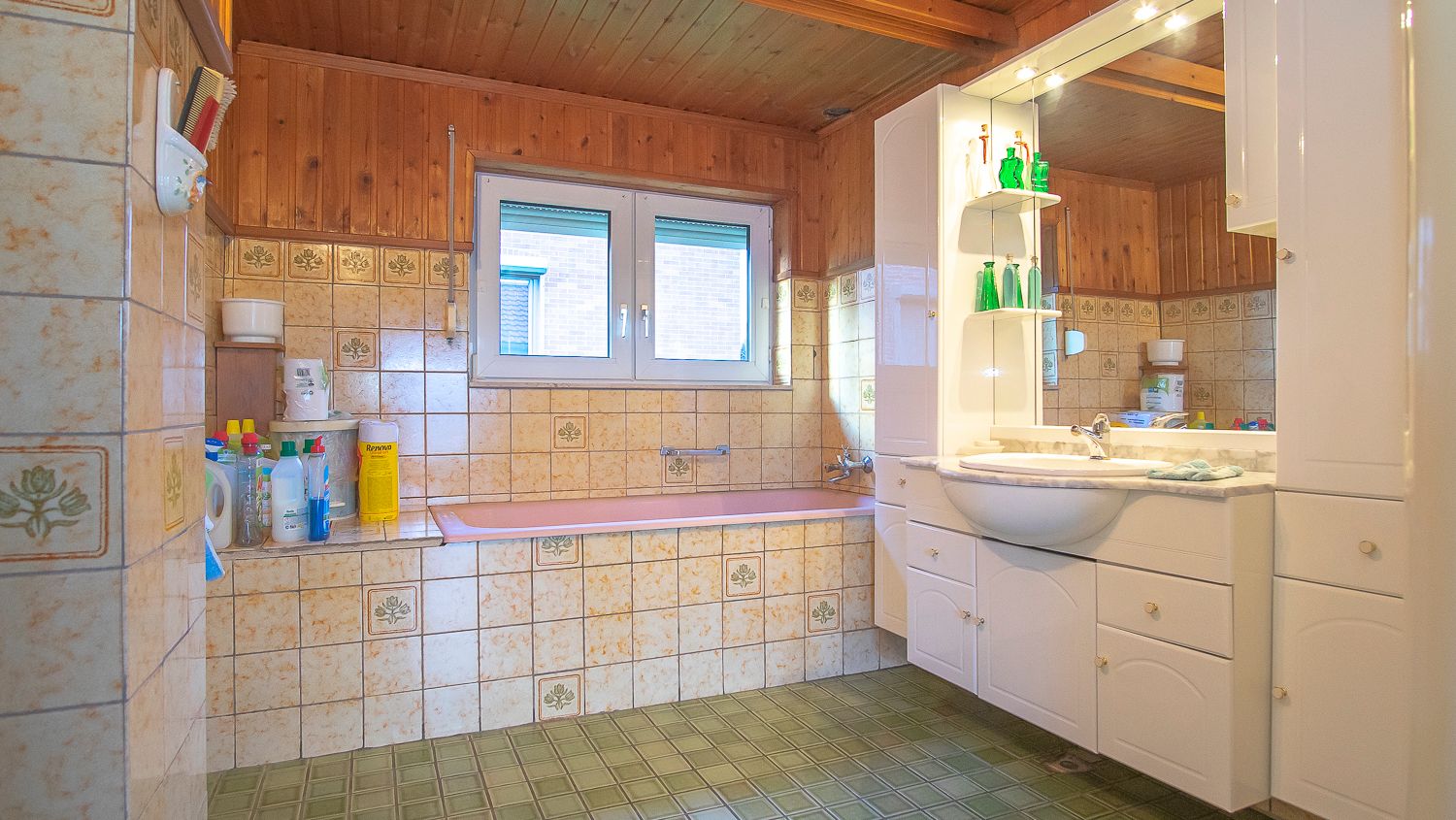 - Badkamer: (3,50 m x 2,30 m = 8,05 m²) – ingericht met ligbad – douche – badkamermeubel met wastafel, onderkasten en kolomkasten – buitenraam.
