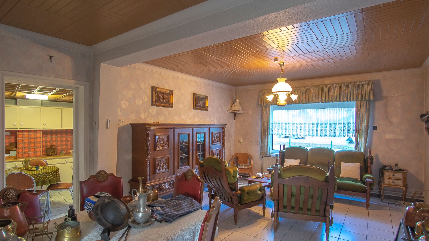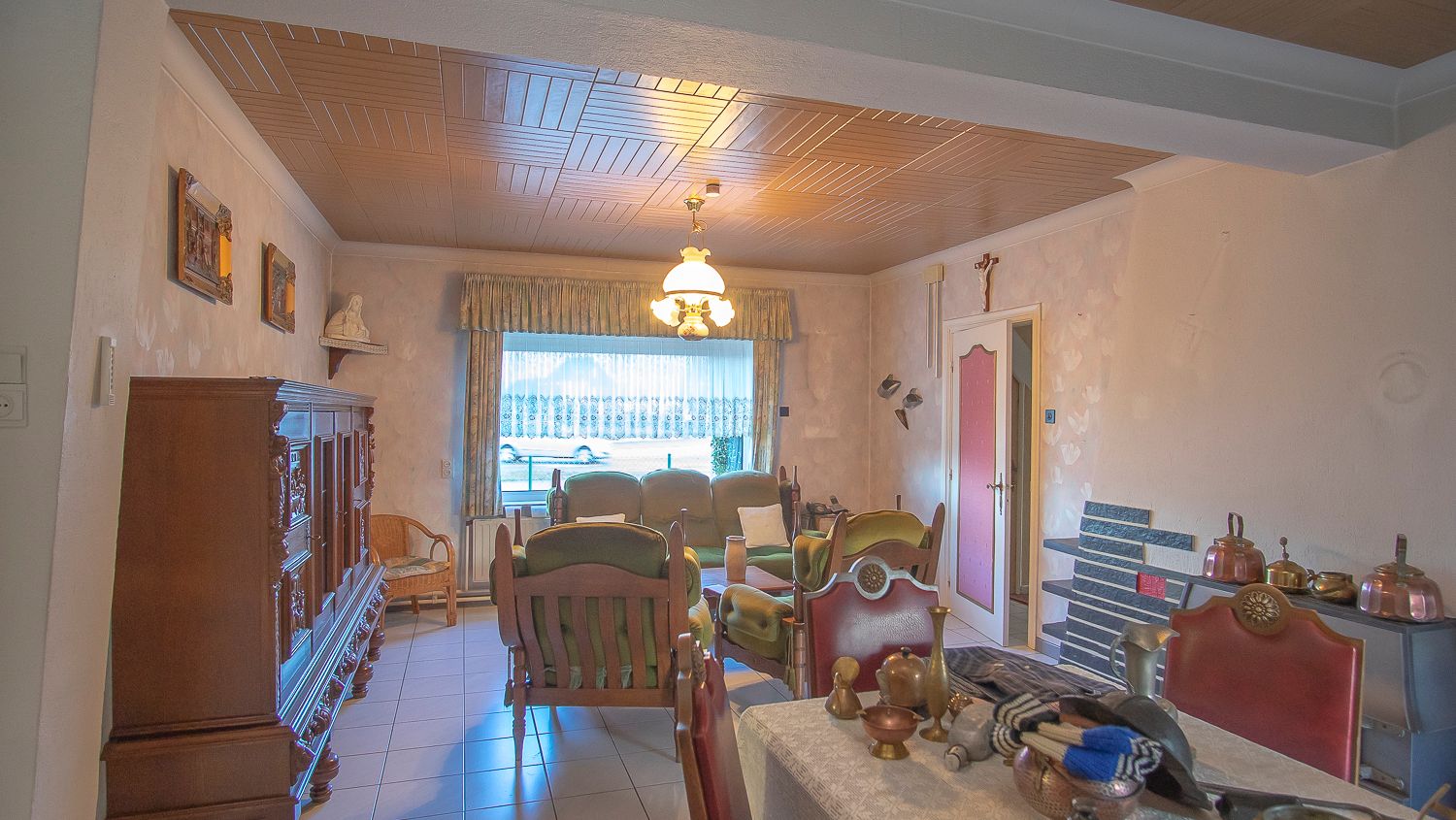 - Woonkamer: (6,40 m x 4,20 m = 26,88 m²) – witte tegelvloer – leefkamer met ramen op rechter en linker zijgevel – zicht naar de rotonde van Dilsen – rolluiken aanwezig.