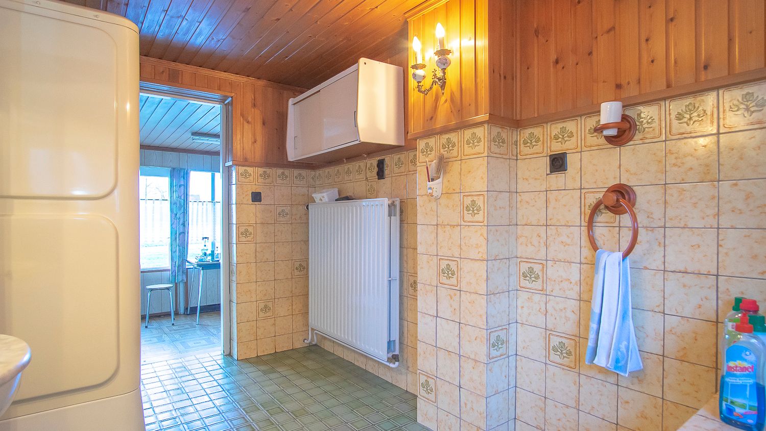 - Berging: (3,60 m x 2,60 m = 9,36 m²) – hier staat de cv-ketel (op stookolie) en de boiler – aansluitingen voor wasmachine – ruimte voor diepvries of extra koelkast – buitenraam.