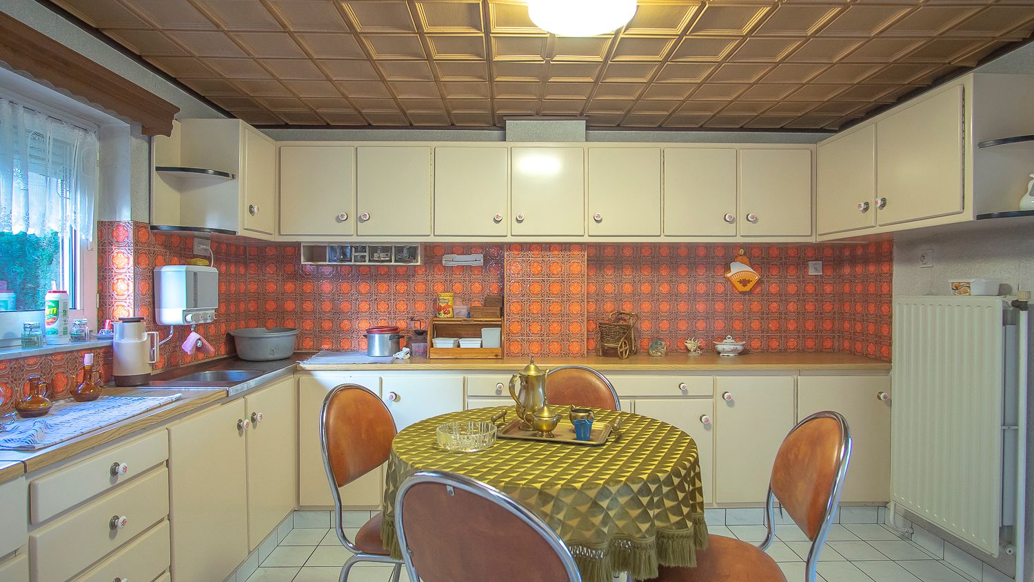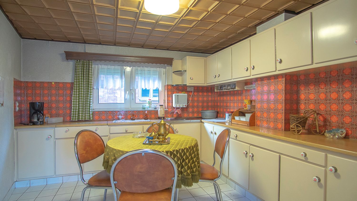 - Keuken : (3,60 m x 3,20 m = 11,52 m²) – witte tegelvloer – afzonderlijke leefkeuken met aanbouwkeuken in L-vorm – ruim voorzien aan kasten, eerder beperkt aan apparatuur -