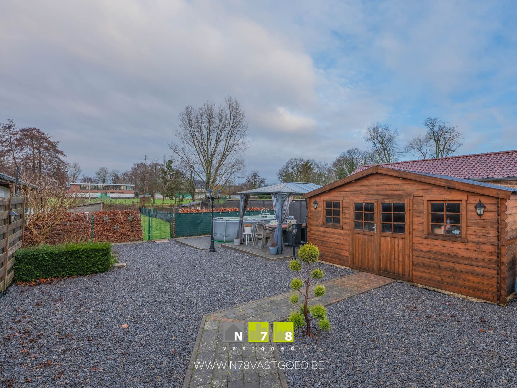 - Overdekt terras met zicht op de tuin: tegelvloer.