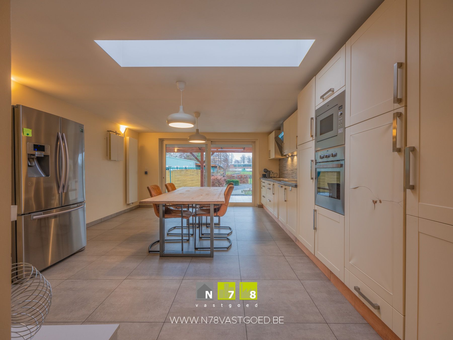 - Keuken (25,79m²): geïnstalleerd met onder- en bovenkasten, lades, keramische kookplaat, dampkap, vaatwasser, oven en microgolfoven, schuifraam naar overdekt terras, tegelvloer.