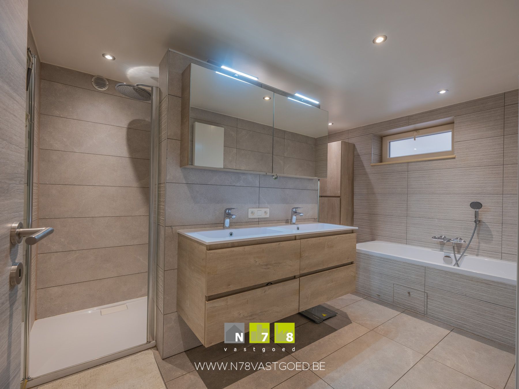 - Badkamer (10,22m²): badkamermeubel met dubbele lavabo, onderkast met lades, spiegelkast, kolomkast, ligbad en aparte douche, aansluitingen wasmachine en droogkast; wandbetegeling, tegelvloer.