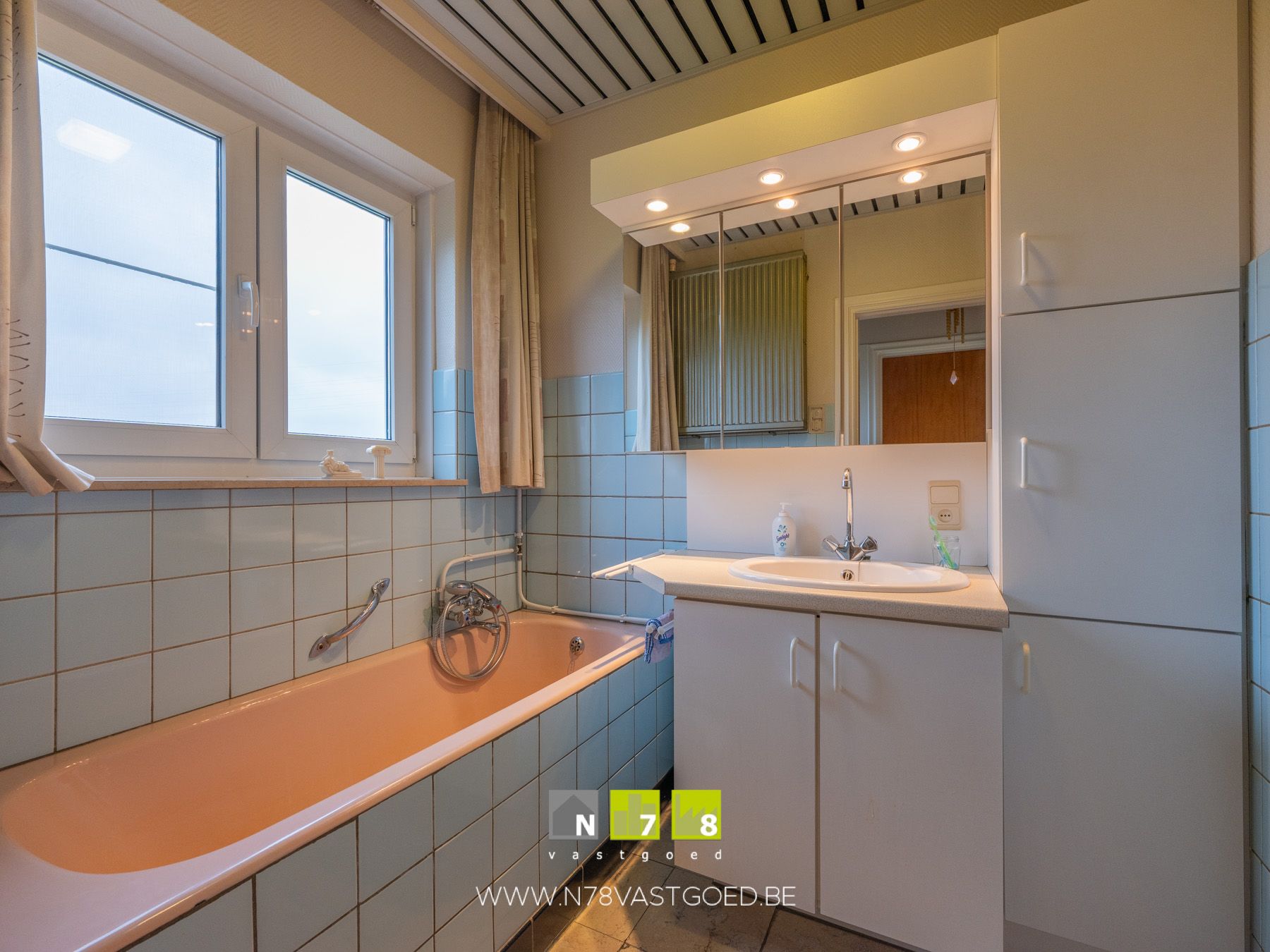 - Badkamer (3,81m²): geïnstalleerd met enkele lavabo, onderkast, kolomkast en spiegelkast, ligbad, tegelvloer.