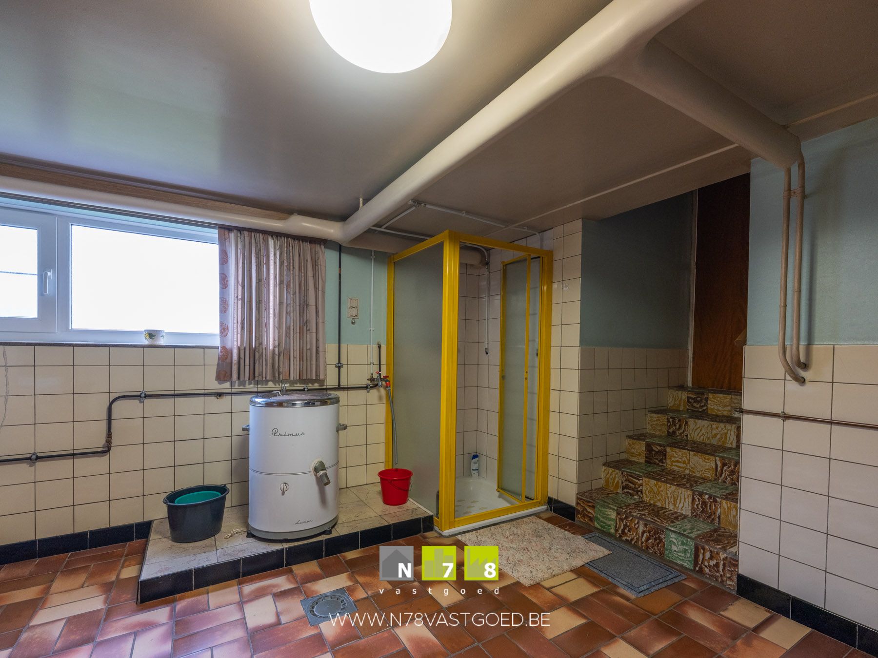 - Berging/wasplaats (14,12m²): CV ruimte, douchecabine, aansluitingen wasmachine, tegelvloer.
