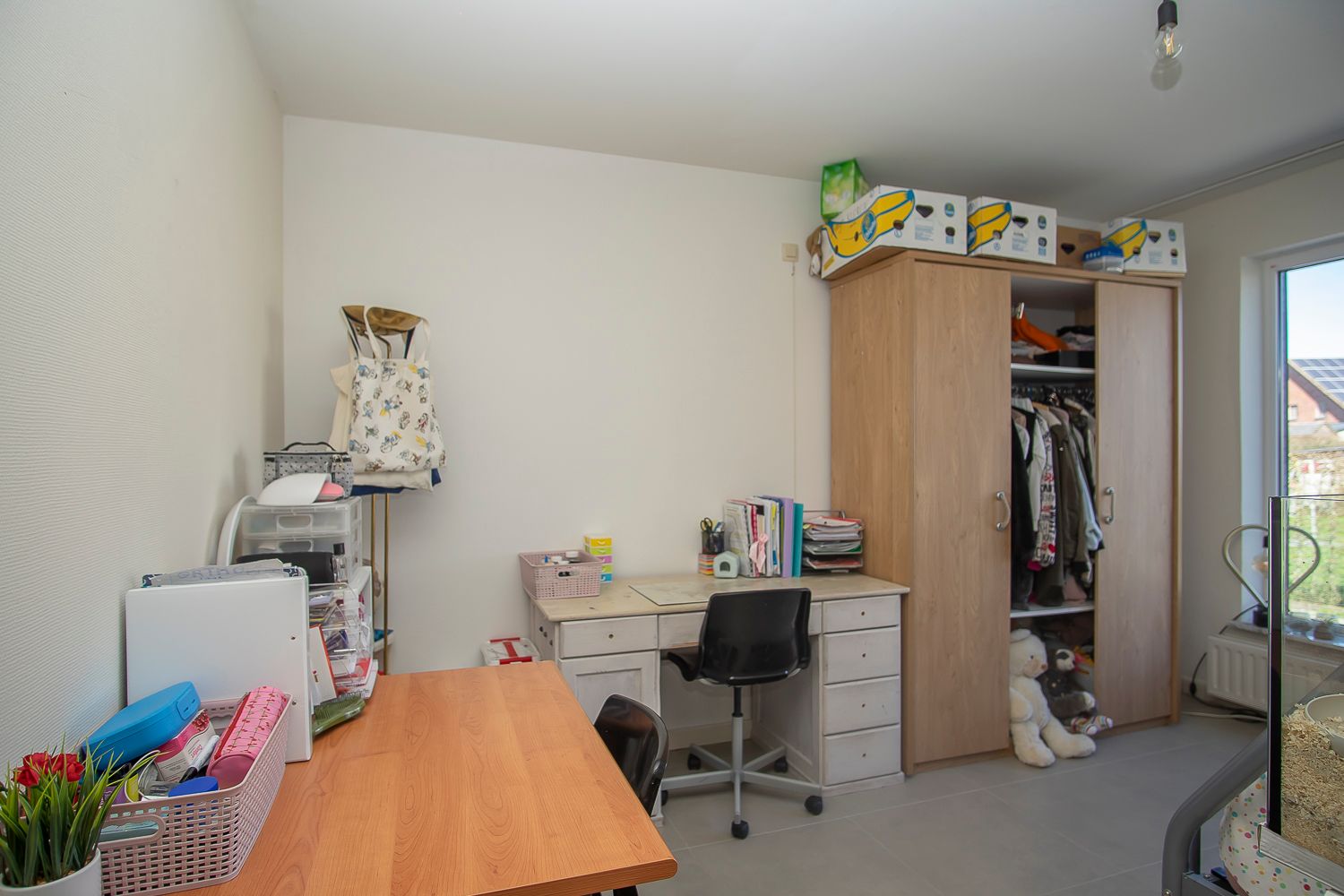 - Slaapkamer 3: (3,34 m x 2,75 m = 9,18 m²) – tegelvloer.