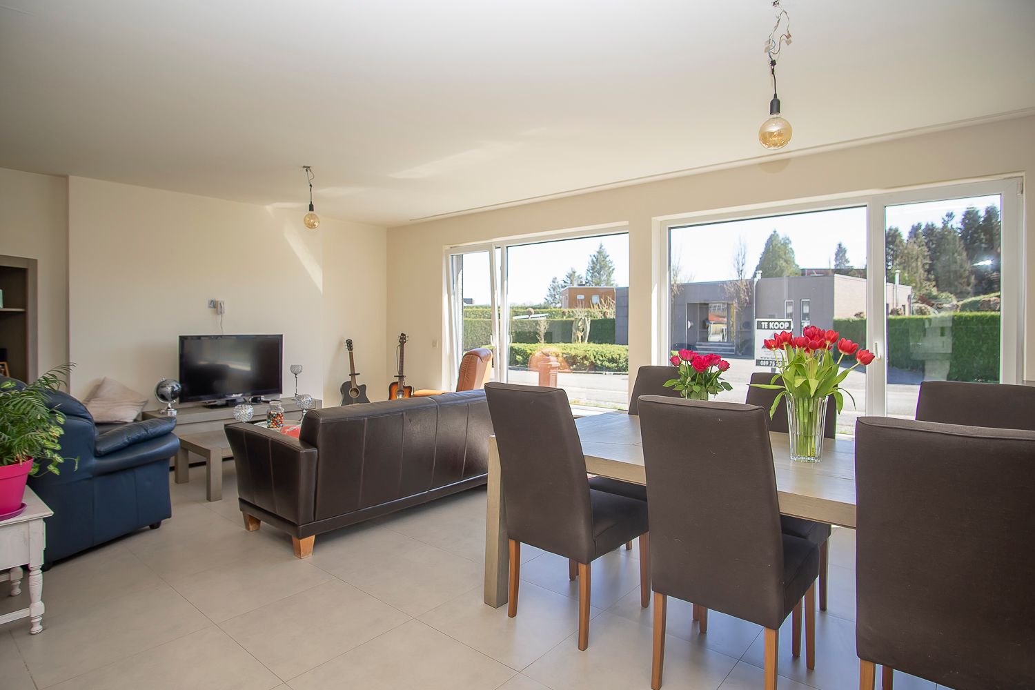 - Woonkamer: (7,44 m x 4,50 m = 33,48 m²) – tegelvloer – ruime, lichtrijke woonkamer.