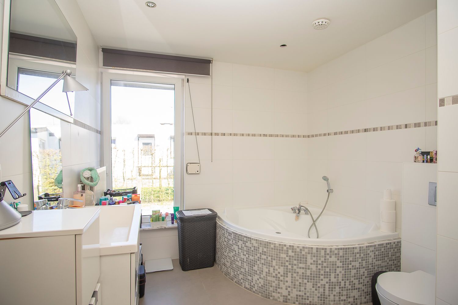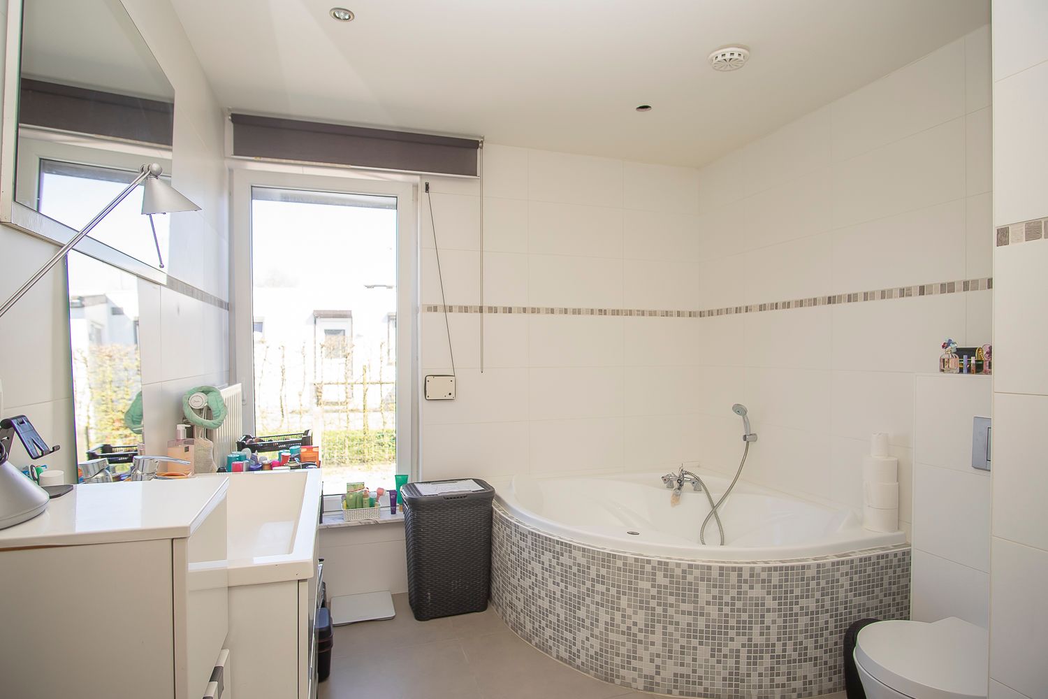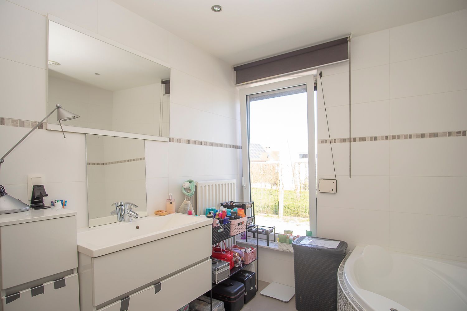 - Badkamer: (2,75 m x 3,34 m = 9,19 m²) – tegelvloer - mooie ruime badkamer met hoek ligbad - ruime inloopdouche met mengkraan, handdouche en regendouche – hangtoilet – badkamermeubel met een brede wastafel, laden en kastje.