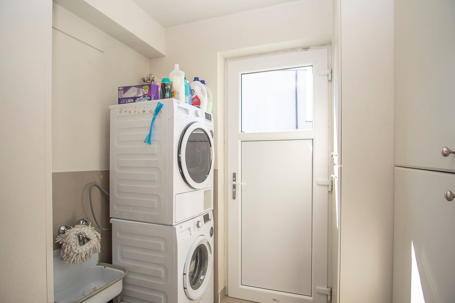 - Wasplaats/berging: (2,96 m x 2,75 m = 8,14 m²) – tegelvloer – inbouwkasten – aansluiting wasmachine – uitgietbak – cv op stookolie. – hier bevindt zich de achterdeur.