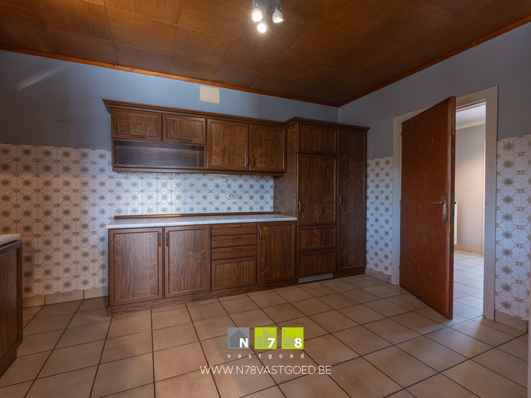 - Keuken (400m x 300m = 12,00m²): geïnstalleerd met onder- en bovenkasten, lades, koelkast, tegelvloer.