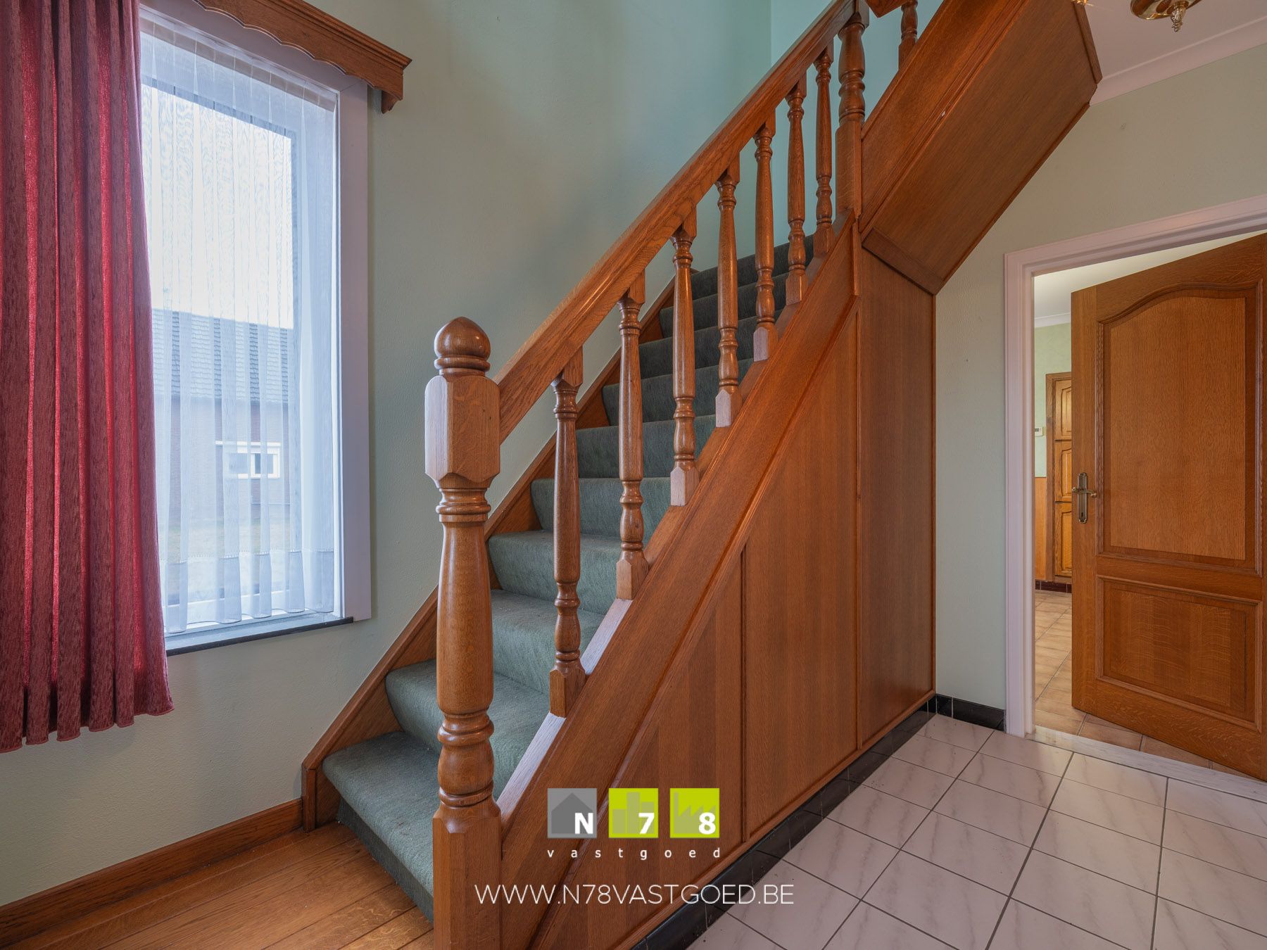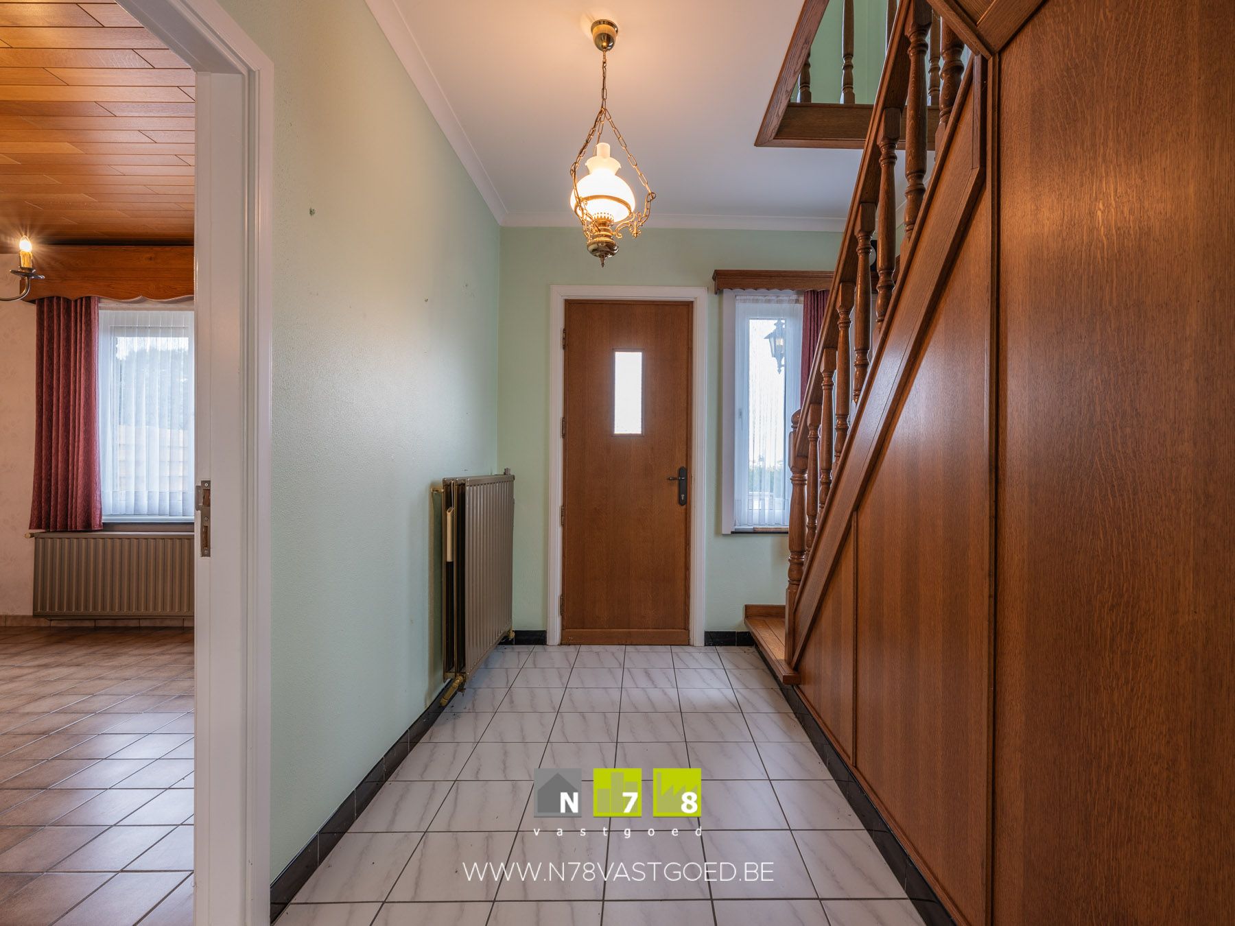 - Inkomhal (3,30m x 2,50m = 8,25m²): trap naar de eerste verdieping, tegelvloer.