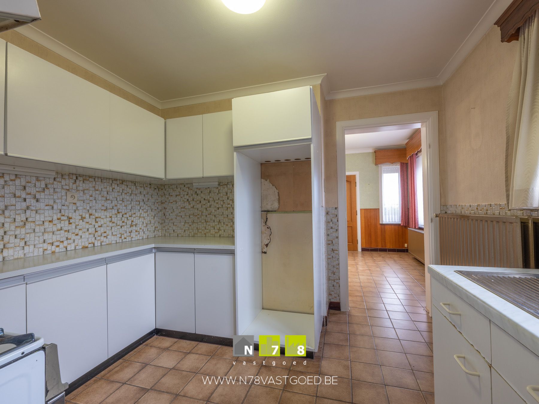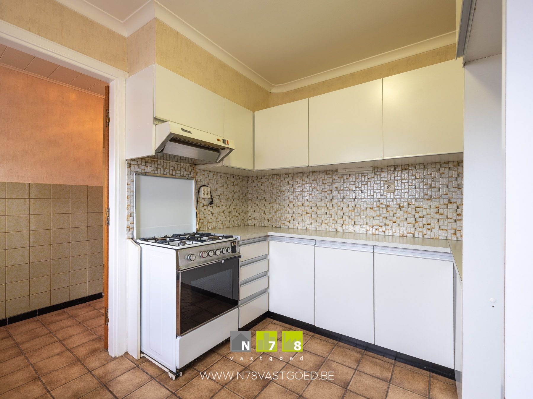 - Keuken (3,00m x 3,00m = 9,00m²): geïnstalleerde keuken met onderkasten, bovenkasten, spoelbak, gasfornuis, oven, dampkap, tegelvloer.