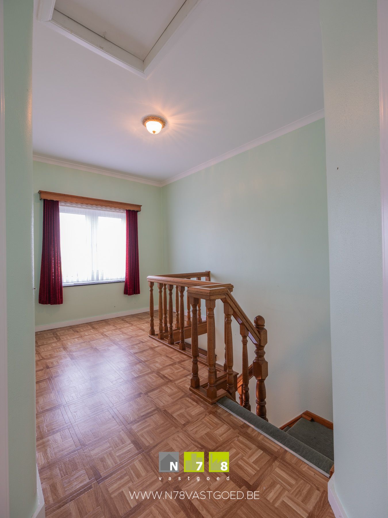 - Overloop ((2,40m x 3,00m) + (1,00m x 1,00m) = 8,20m²): trap naar het gelijkvloers, novilon.