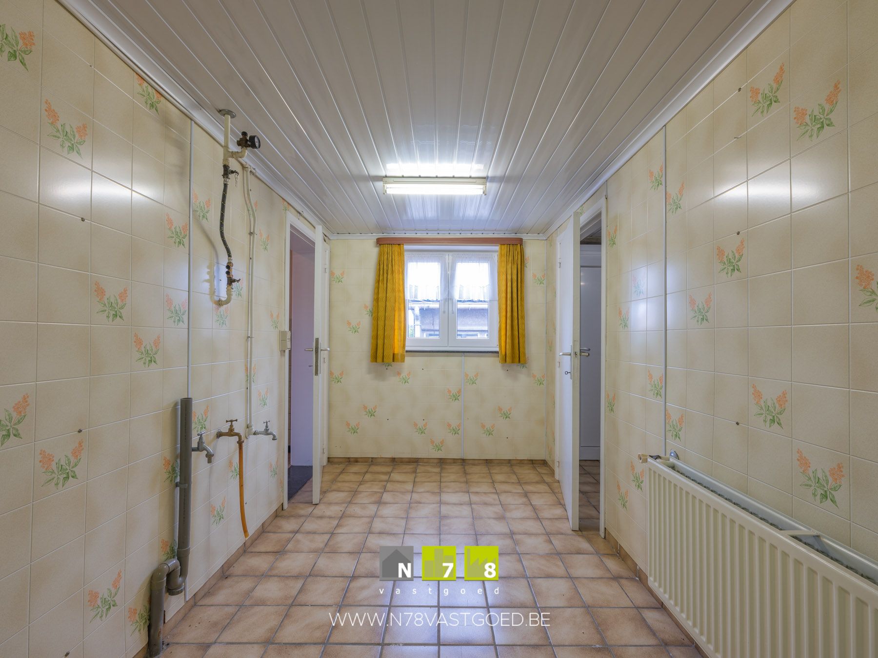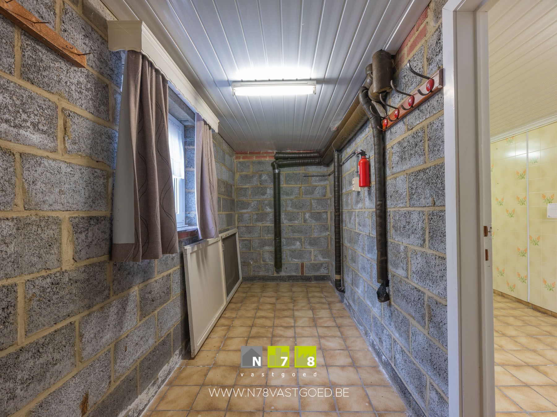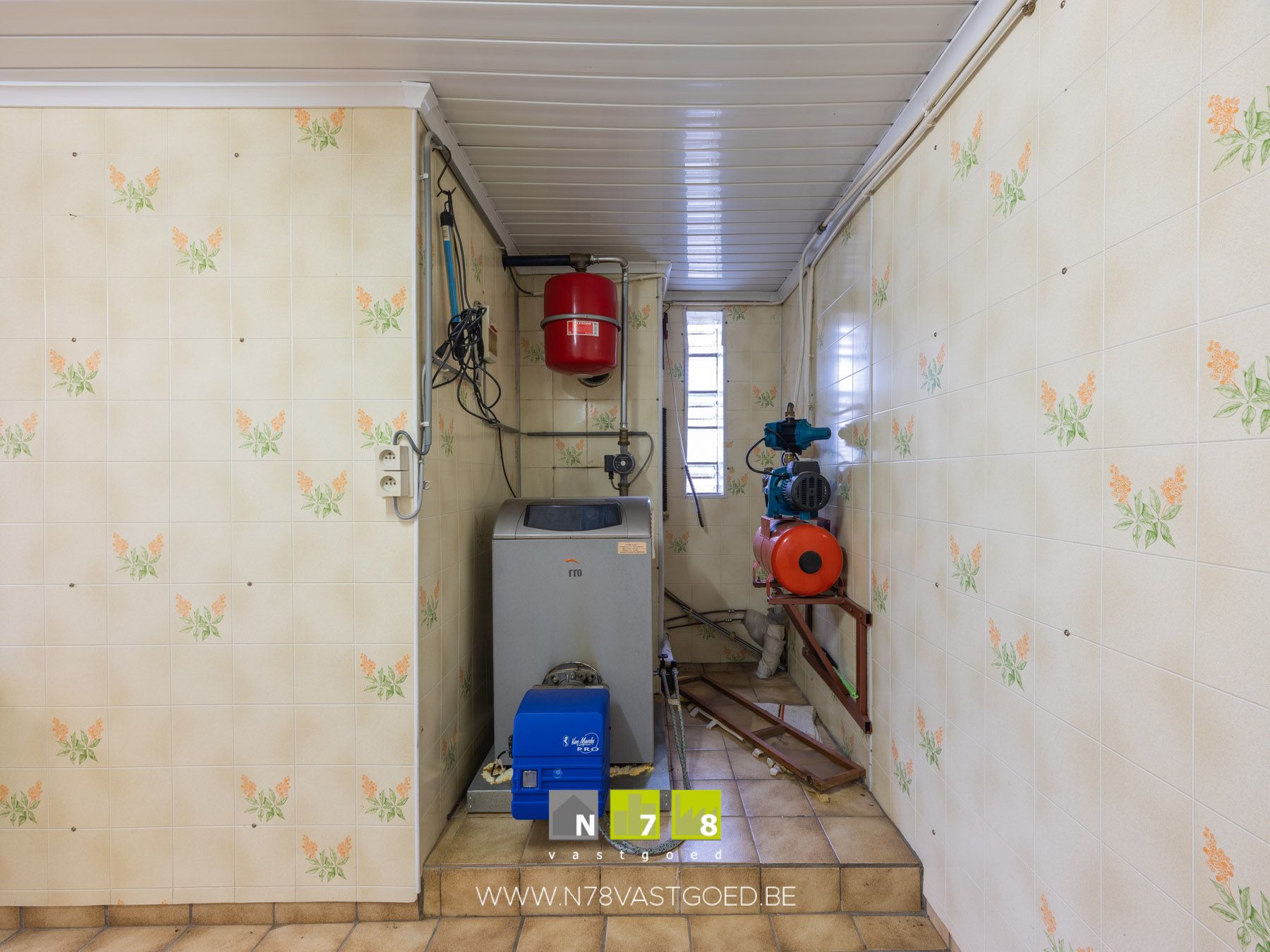 - Wasplaats (2,00m x 5,65m = 11,30m²): aansluiting wasmachine, Cv-installatie op stookolie, tegelvloer.
