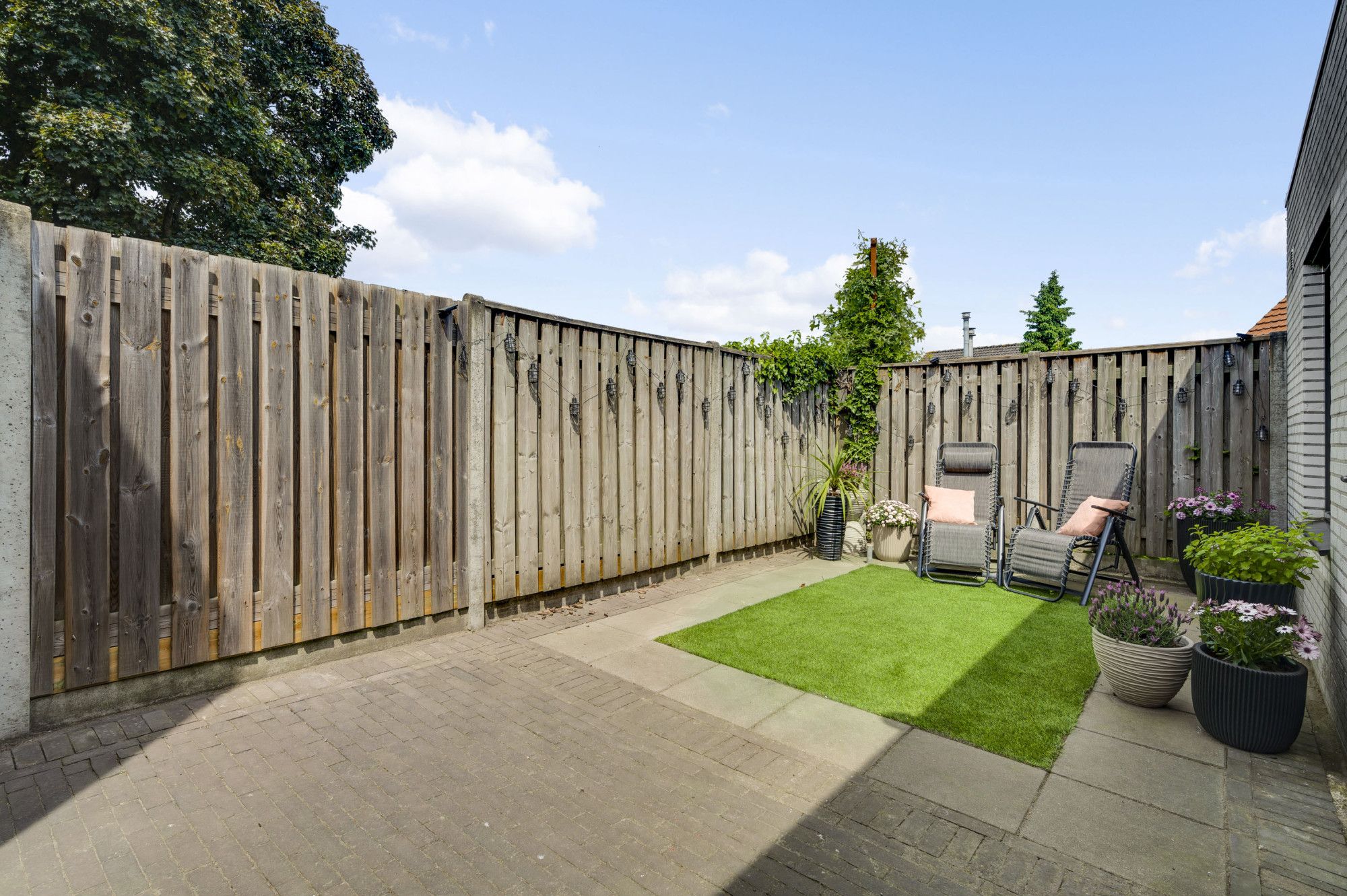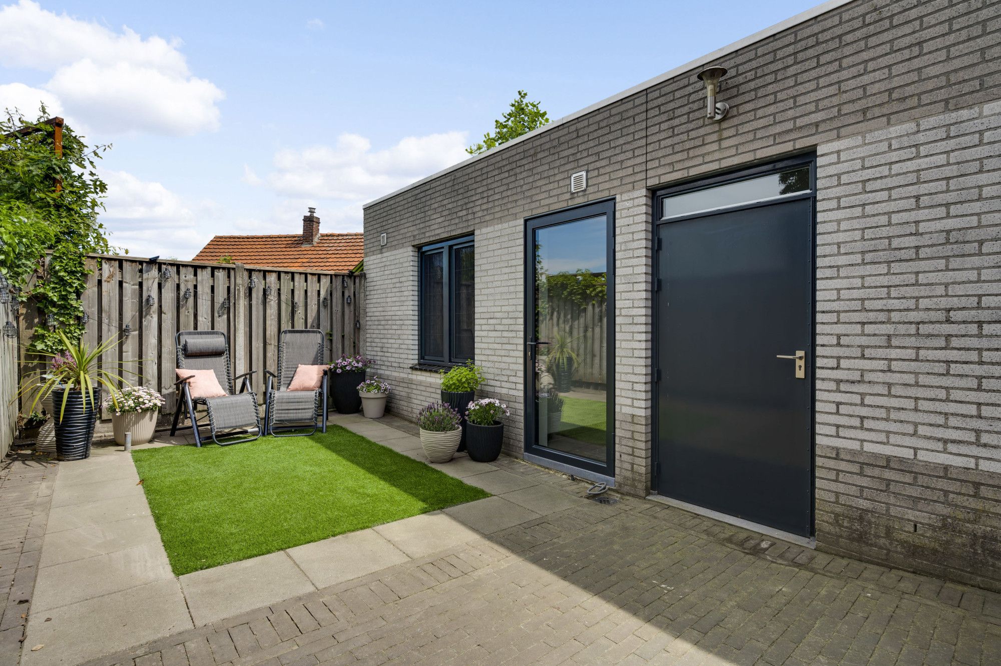De achtertuin is fraai aangelegd met onder andere kunstgras, terras en biedt optimale privacy. Dankzij de ligging geniet u hier van de middag- en avondzon. Aan de voorzijde van de woning is een gezellig, overdekt tweede terras ingericht waar u ook in de ochtend heerlijk in het zonnetje kunt ontbijten. De tuin is ook bereikbaar via een vrije achterom aan de zijkant van het perceel met tevens een afsluitbare poort. Of u nu in de zon wilt ontspannen of juist beschut wilt genieten van het buitenleven – deze tuin biedt het allemaal.