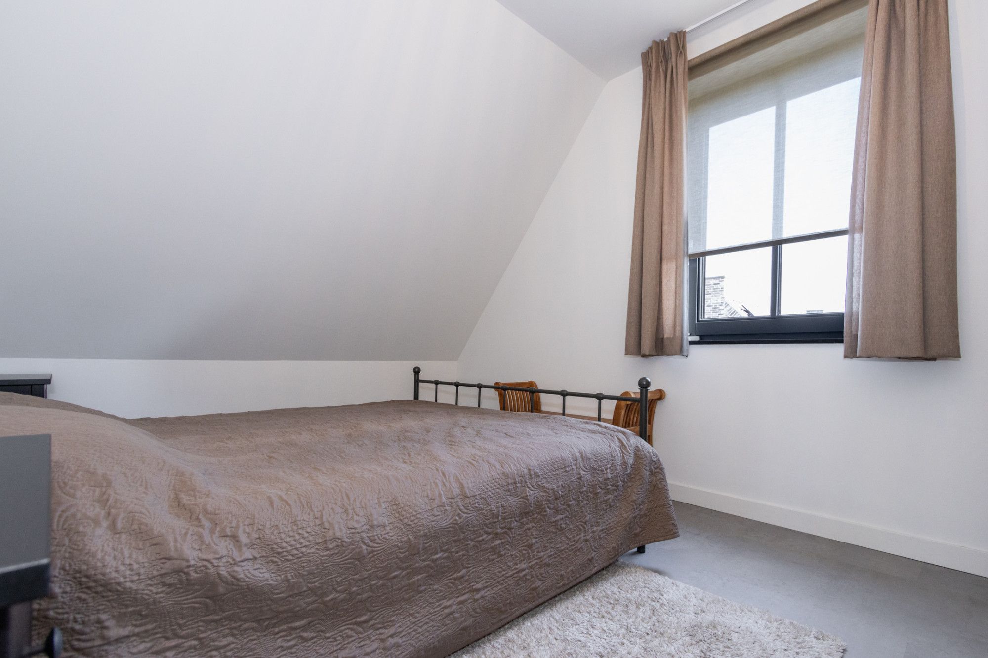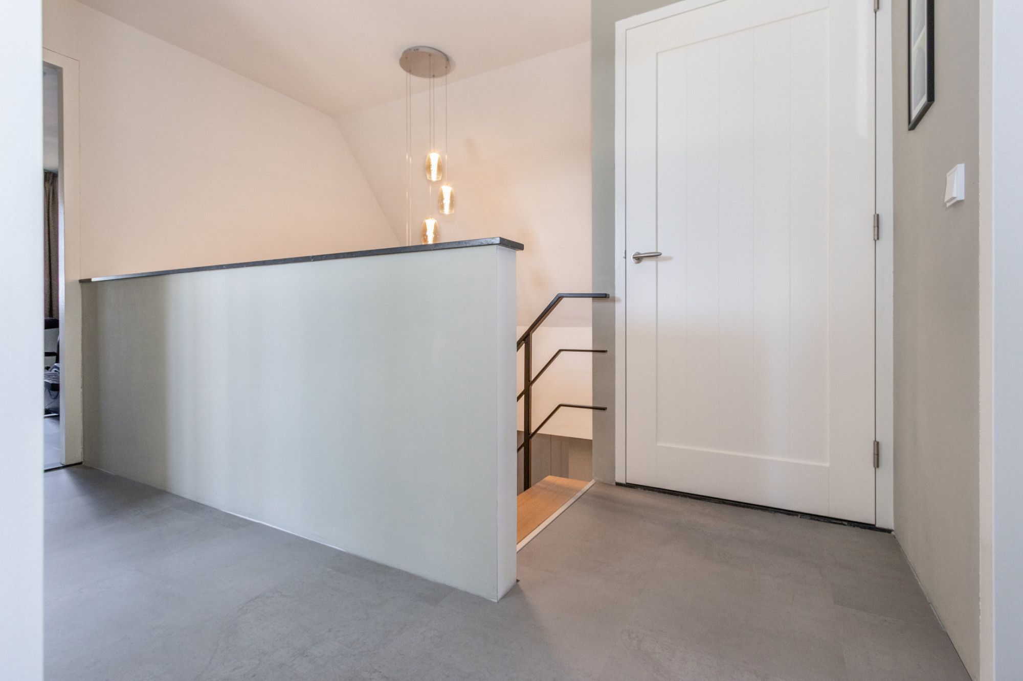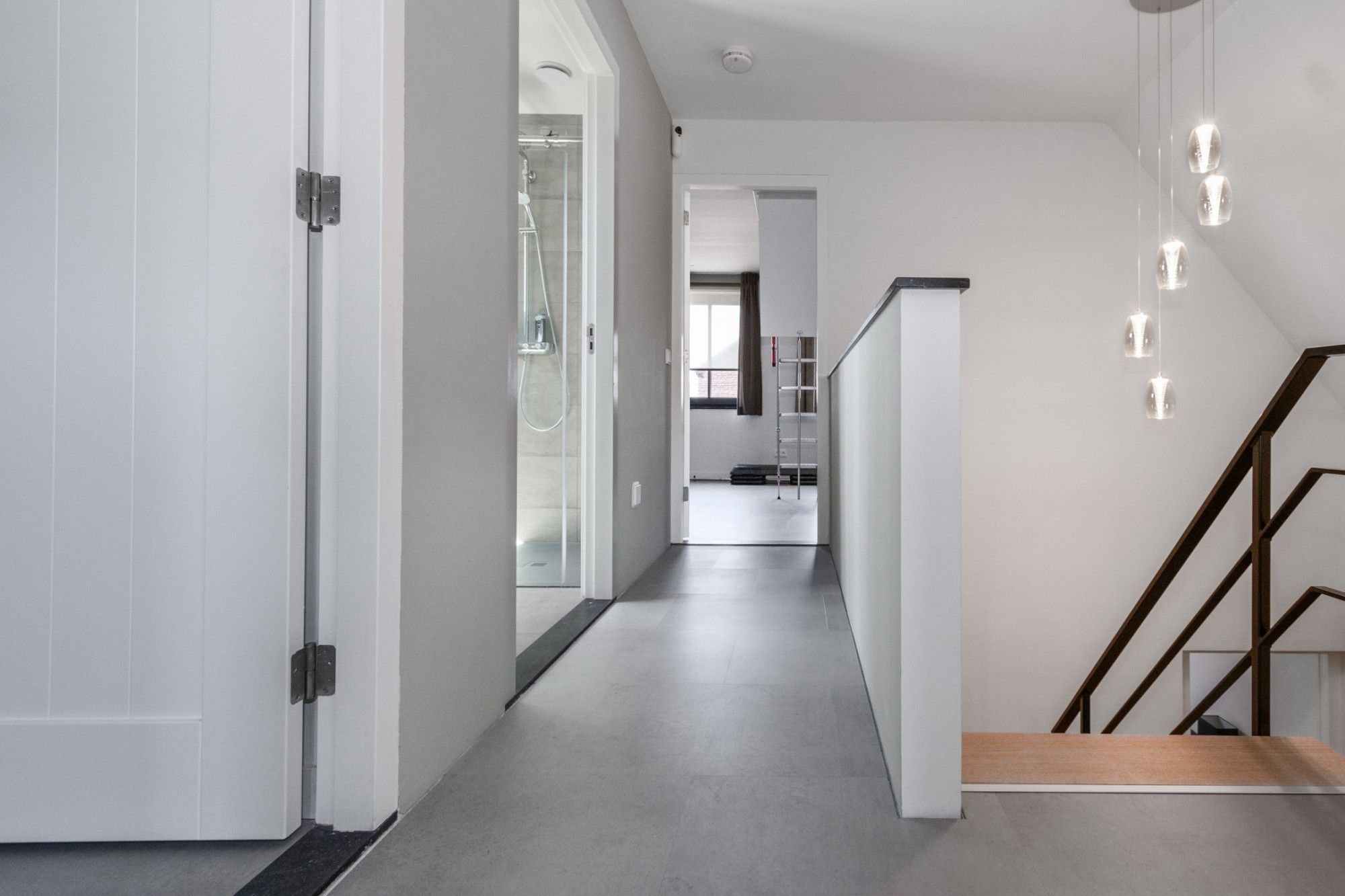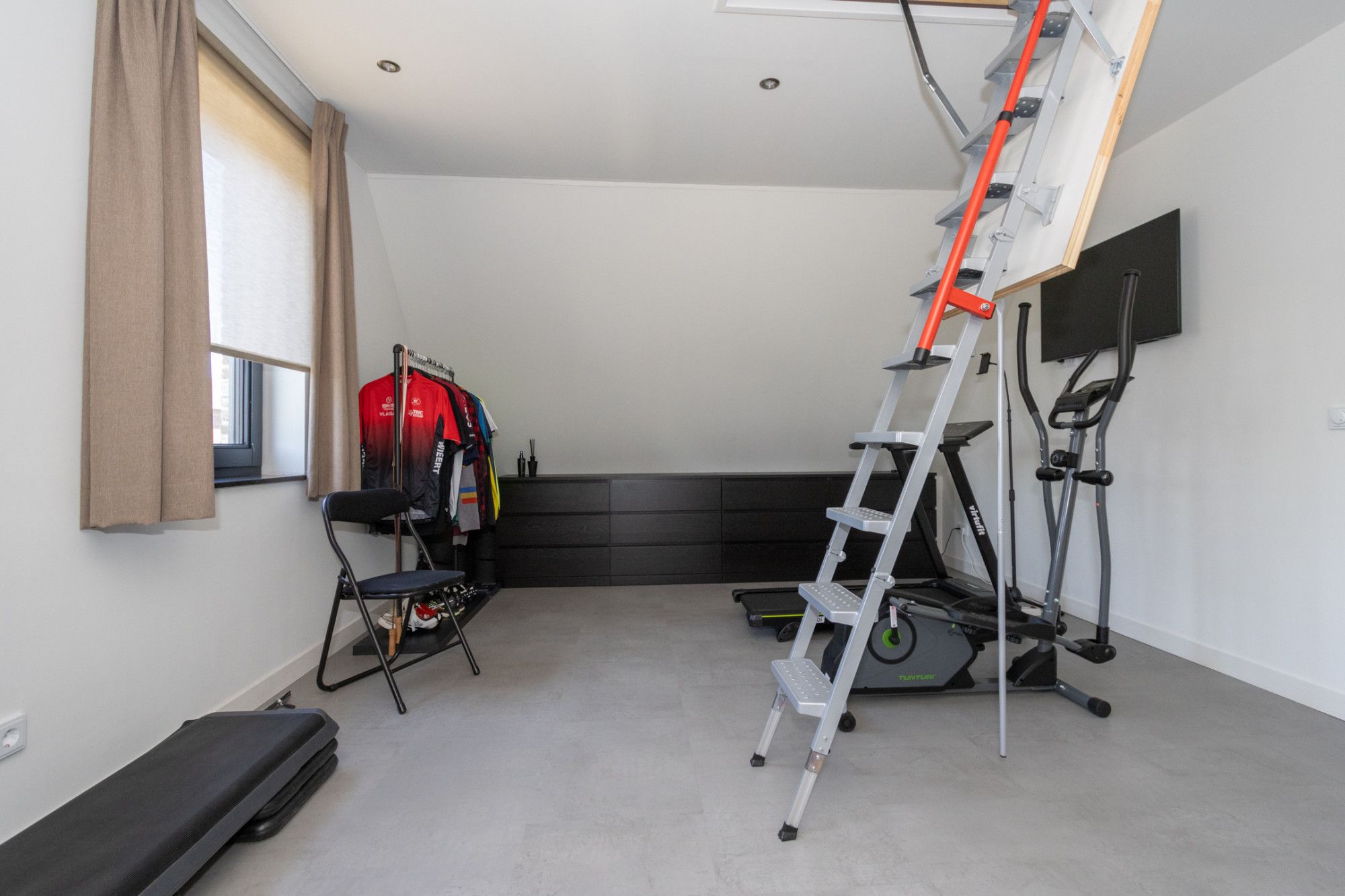 Via een stijlvolle open trap van staal met eikenhouten treden bereik je de eerste verdieping met een mooie vide. Hier bevinden zich drie ruime slaapkamers en een tweede badkamer. De slaapkamers zijn afgewerkt met een houtlook pvc-vloer en voorzien van screens voor extra comfort. De tweede badkamer is uitgevoerd in dezelfde luxe stijl als op de begane grond, en beschikt over een inloopdouche, een wastafelmeubel en een condensvrije spiegel. Via een degelijke vlizotrap in de grootste slaapkamer, momenteel in gebruik als gym, is de ruime bergzolder te bereiken. Een ideale plek voor extra opbergruimte.