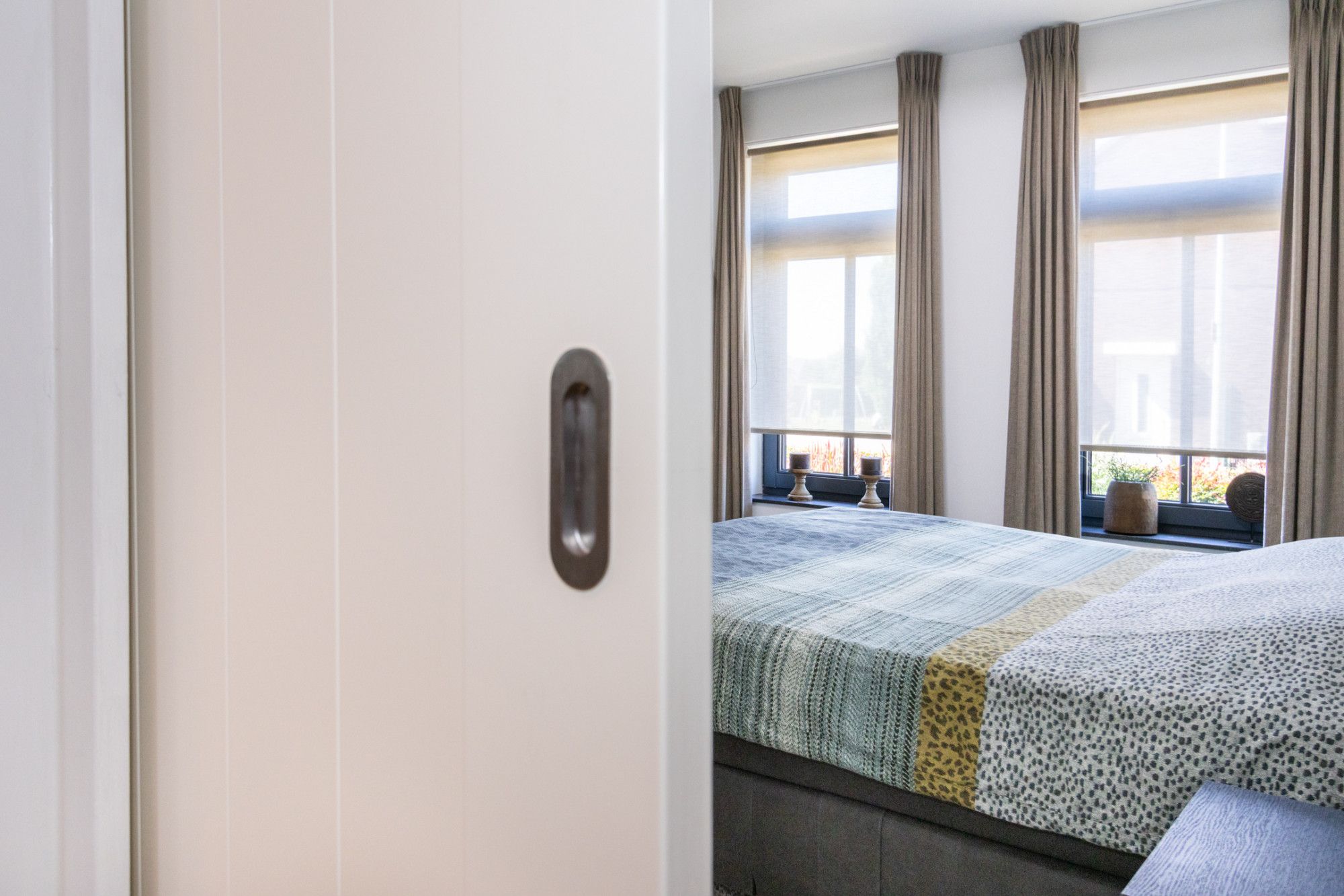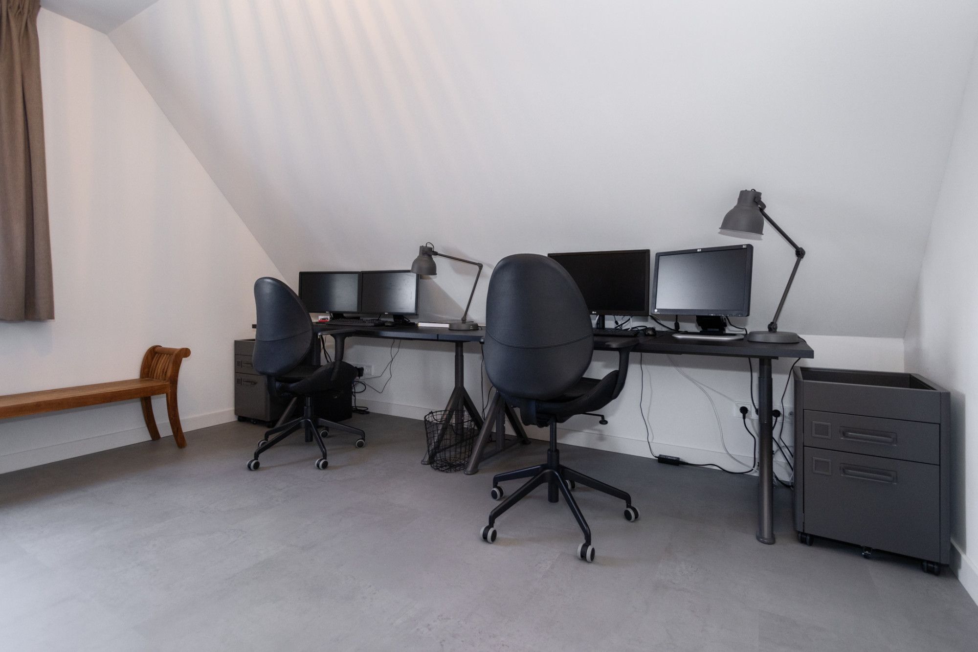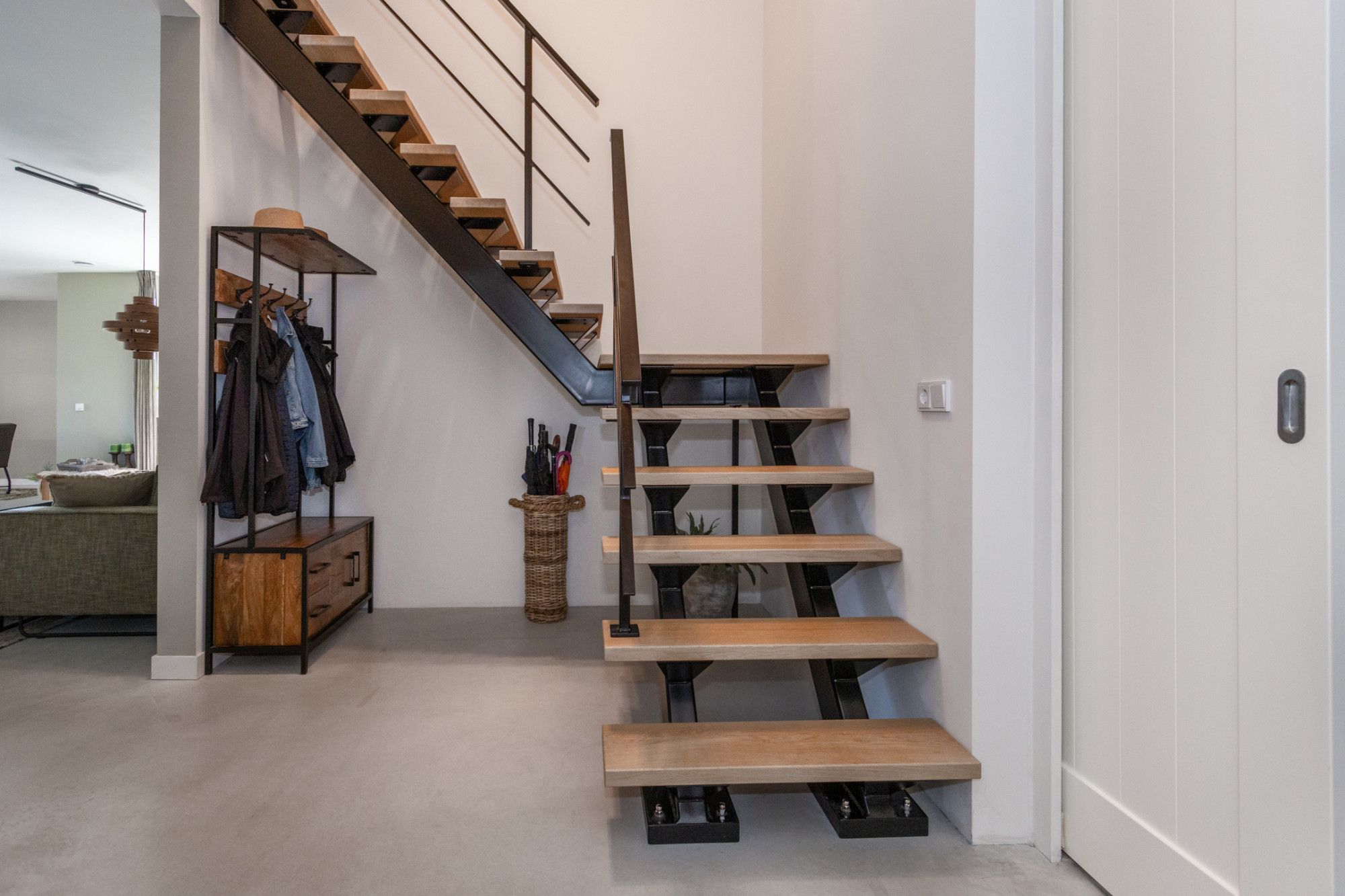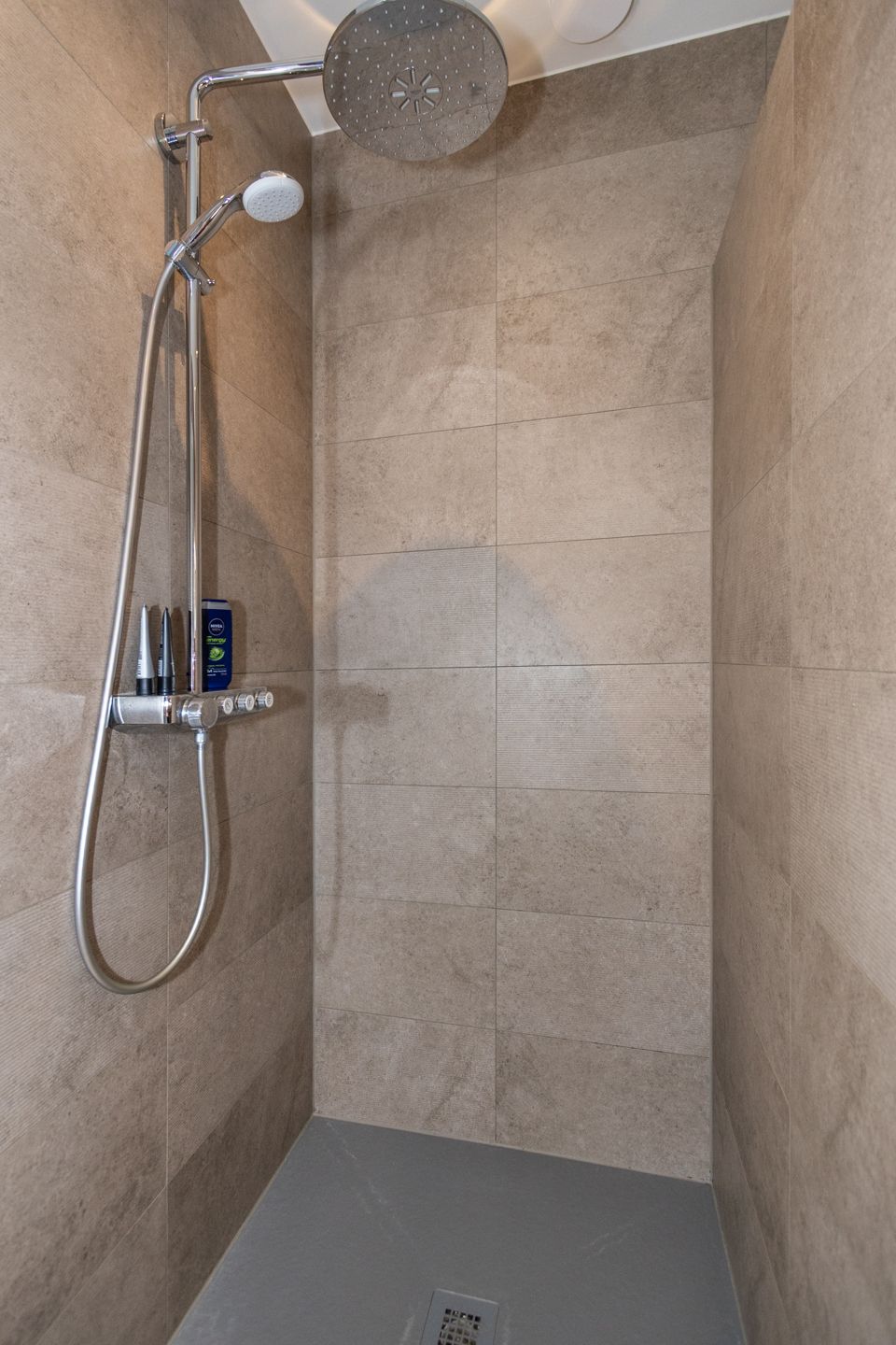 Via een stijlvolle open trap van staal met eikenhouten treden bereik je de eerste verdieping met een mooie vide. Hier bevinden zich drie ruime slaapkamers en een tweede badkamer. De slaapkamers zijn afgewerkt met een houtlook pvc-vloer en voorzien van screens voor extra comfort. De tweede badkamer is uitgevoerd in dezelfde luxe stijl als op de begane grond, en beschikt over een inloopdouche, een wastafelmeubel en een condensvrije spiegel. Via een degelijke vlizotrap in de grootste slaapkamer, momenteel in gebruik als gym, is de ruime bergzolder te bereiken. Een ideale plek voor extra opbergruimte.