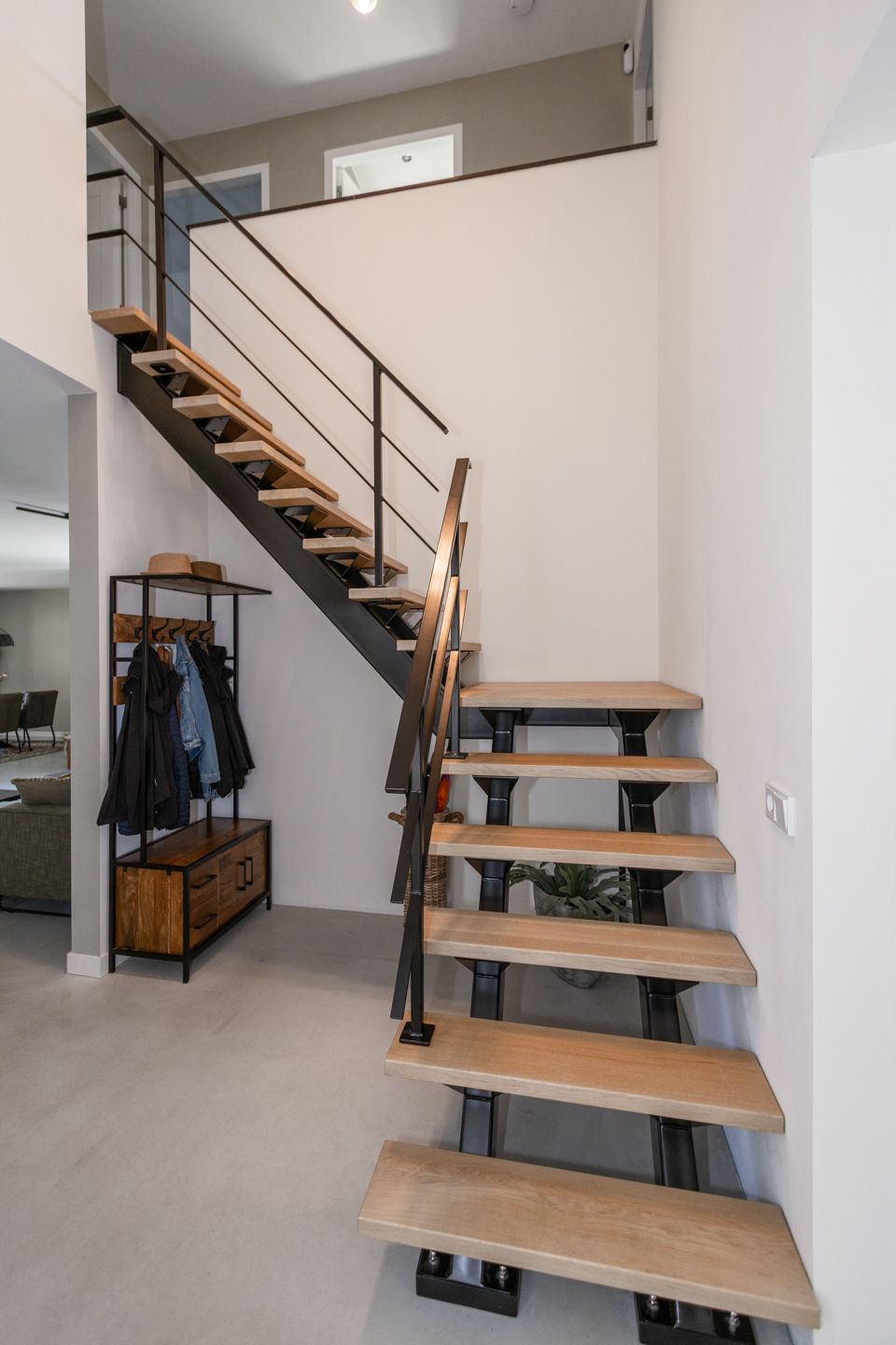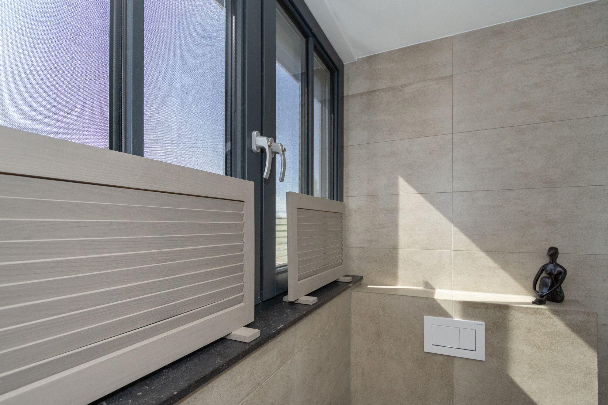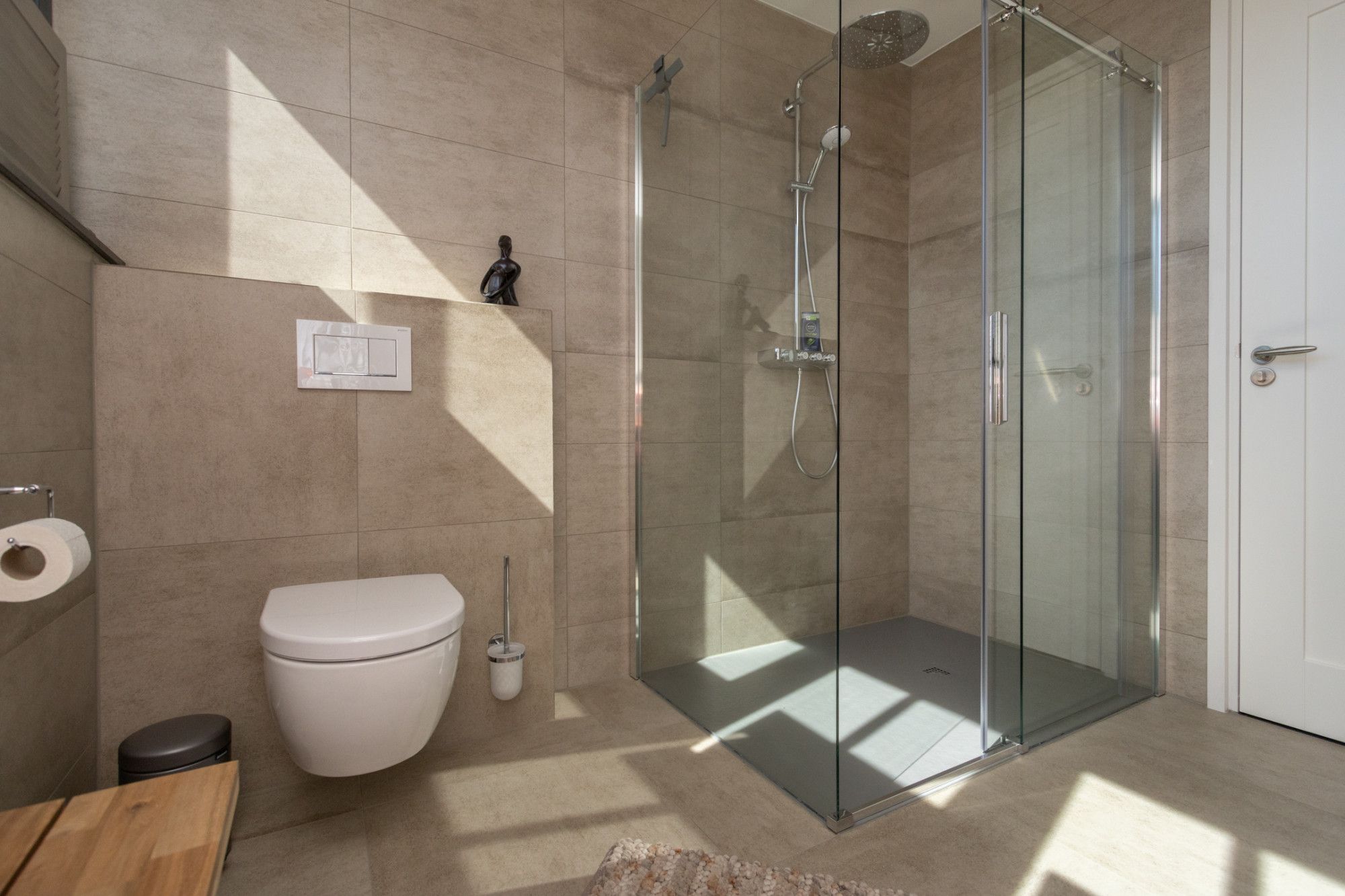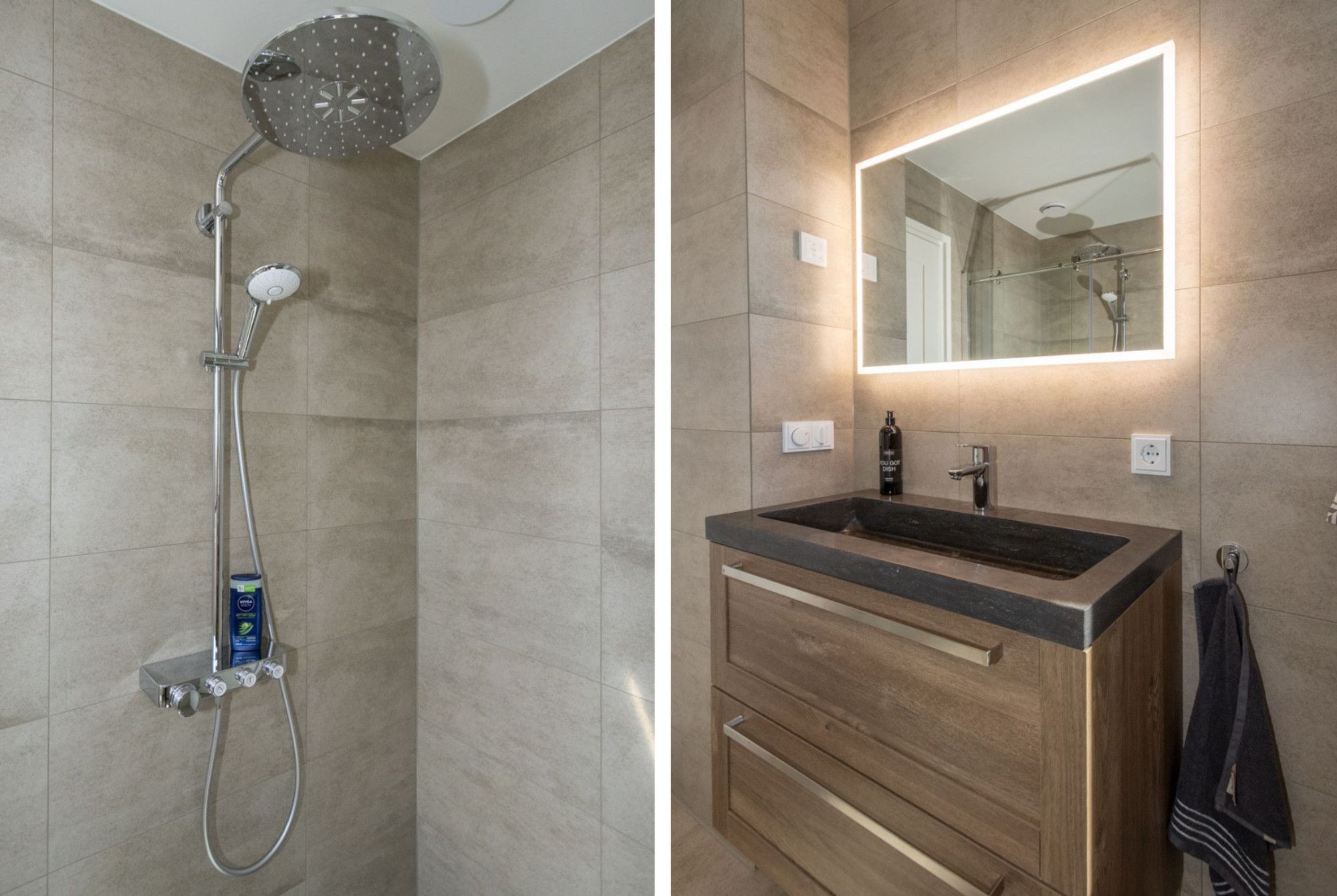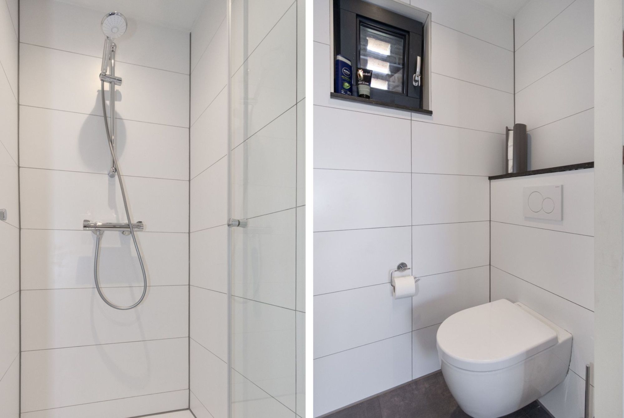 Via een stijlvolle open trap van staal met eikenhouten treden bereik je de eerste verdieping met een mooie vide. Hier bevinden zich drie ruime slaapkamers en een tweede badkamer. De slaapkamers zijn afgewerkt met een houtlook pvc-vloer en voorzien van screens voor extra comfort. De tweede badkamer is uitgevoerd in dezelfde luxe stijl als op de begane grond, en beschikt over een inloopdouche, een wastafelmeubel en een condensvrije spiegel. Via een degelijke vlizotrap in de grootste slaapkamer, momenteel in gebruik als gym, is de ruime bergzolder te bereiken. Een ideale plek voor extra opbergruimte.