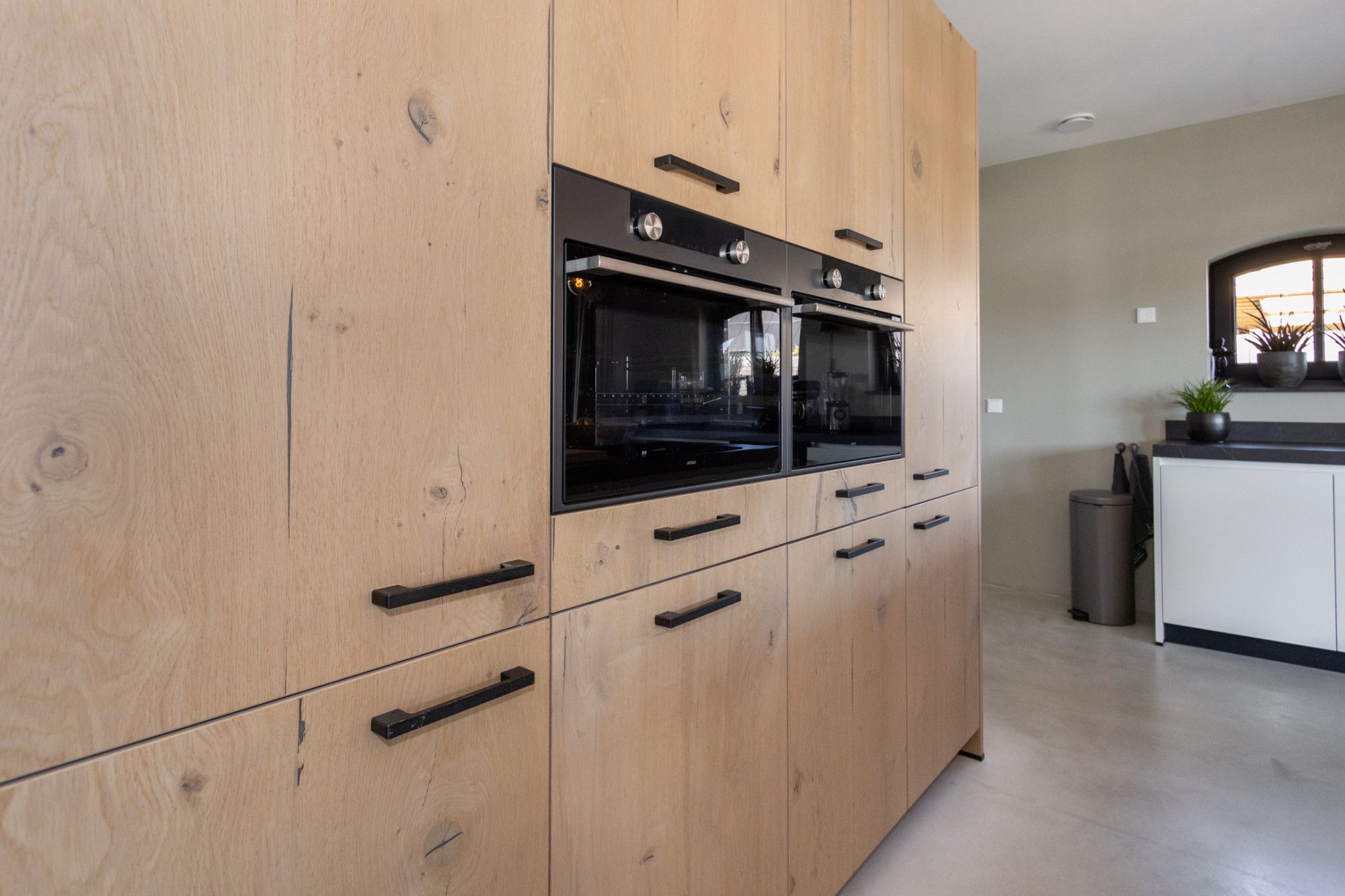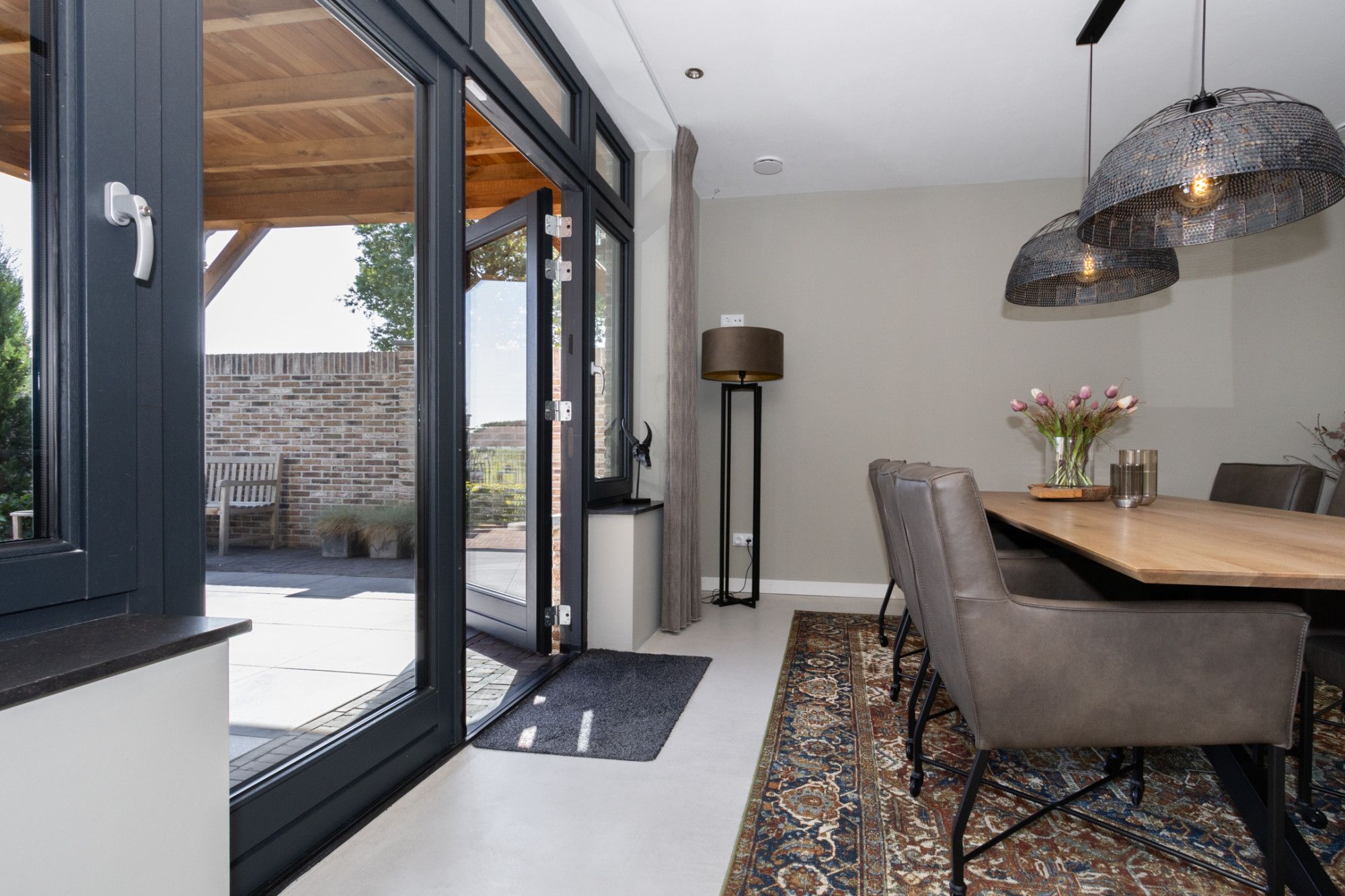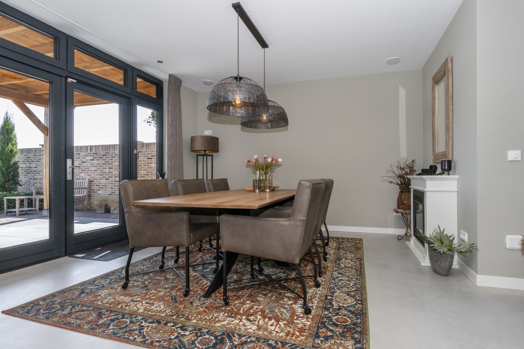 De woonkamer biedt een prachtige lichtinval dankzij openslaande deuren aan zowel de zij- als achterzijde, waardoor er direct contact is met de tuin. De halfopen verbinding met het eetgedeelte en de keuken creëert een ruimtelijk en samenhangend geheel. In het eetgedeelte zorgt een elektrische haard voor sfeer en warmte. Deze ruimte sluit direct aan op het kook- en spoeleiland en de kastenwanden van de keuken, waar alle inbouwapparatuur is geïntegreerd. De luxe keuken is van alle gemakken voorzien: een Bora inductiekookplaat met geïntegreerde afzuiging, twee Quooker-kranen voor kokend en koud/bruisend water, een ATAG-vaatwasser, twee ATAG-ovens, een ruime ATAG-koelkast en -vriezer, én een stijlvolle wijnkoelkast van Pando. Het Dekton werkblad combineert een stijlvolle uitstraling met uitstekende hitte-, zuur- en krasbestendigheid, en is bovendien uitgerust met een praktisch stroompunt. Vanuit het kookeiland kijk je uit over de tuin, waar een sfeervolle, verlichte houten overkapping aan de achtergevel het buitenleven verlengt tot ver in het seizoen.