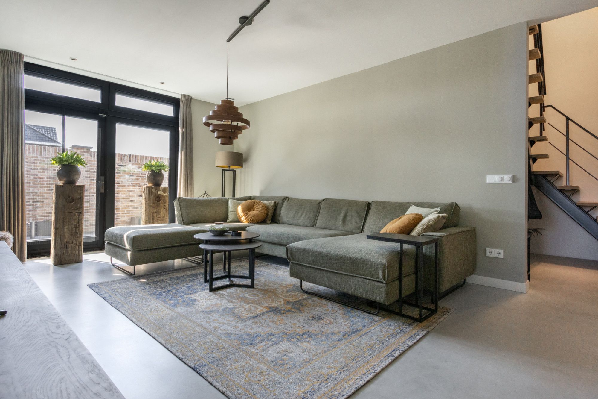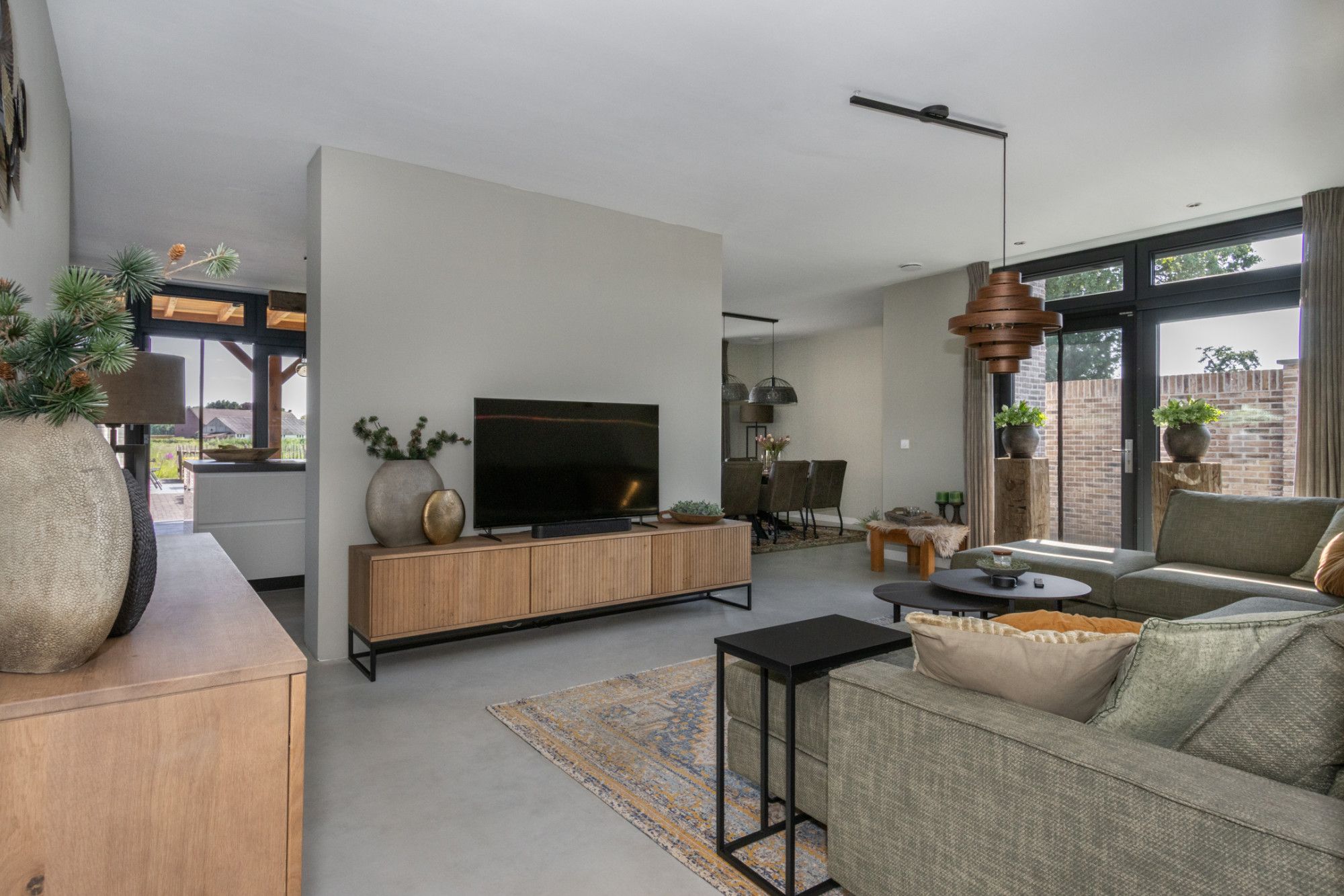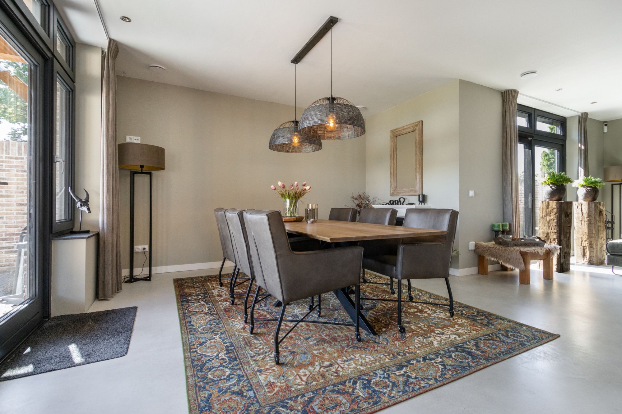 De woonkamer biedt een prachtige lichtinval dankzij openslaande deuren aan zowel de zij- als achterzijde, waardoor er direct contact is met de tuin. De halfopen verbinding met het eetgedeelte en de keuken creëert een ruimtelijk en samenhangend geheel. In het eetgedeelte zorgt een elektrische haard voor sfeer en warmte. Deze ruimte sluit direct aan op het kook- en spoeleiland en de kastenwanden van de keuken, waar alle inbouwapparatuur is geïntegreerd. De luxe keuken is van alle gemakken voorzien: een Bora inductiekookplaat met geïntegreerde afzuiging, twee Quooker-kranen voor kokend en koud/bruisend water, een ATAG-vaatwasser, twee ATAG-ovens, een ruime ATAG-koelkast en -vriezer, én een stijlvolle wijnkoelkast van Pando. Het Dekton werkblad combineert een stijlvolle uitstraling met uitstekende hitte-, zuur- en krasbestendigheid, en is bovendien uitgerust met een praktisch stroompunt. Vanuit het kookeiland kijk je uit over de tuin, waar een sfeervolle, verlichte houten overkapping aan de achtergevel het buitenleven verlengt tot ver in het seizoen.