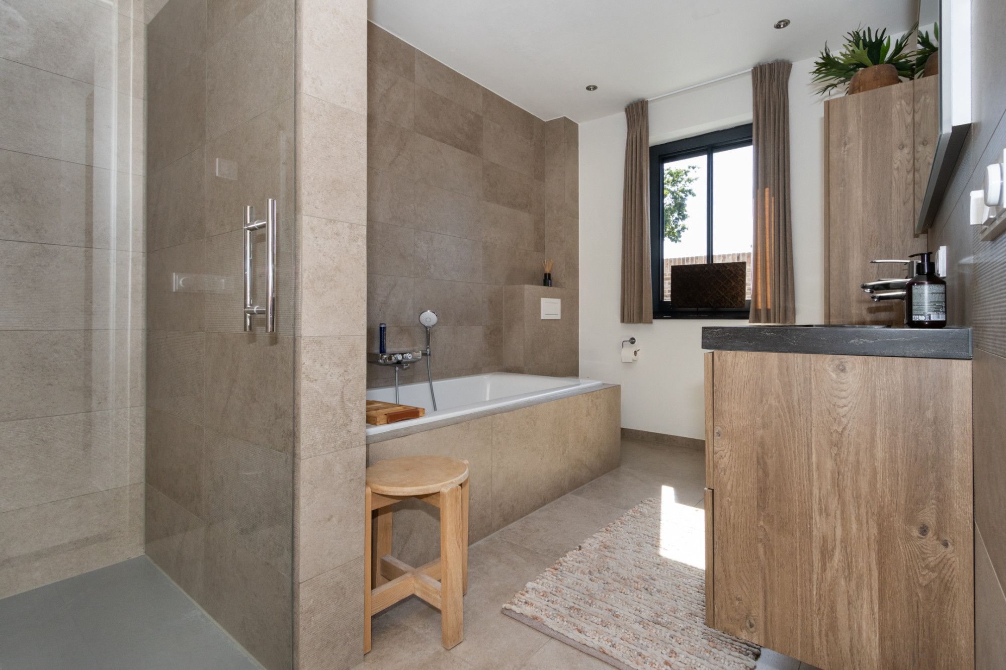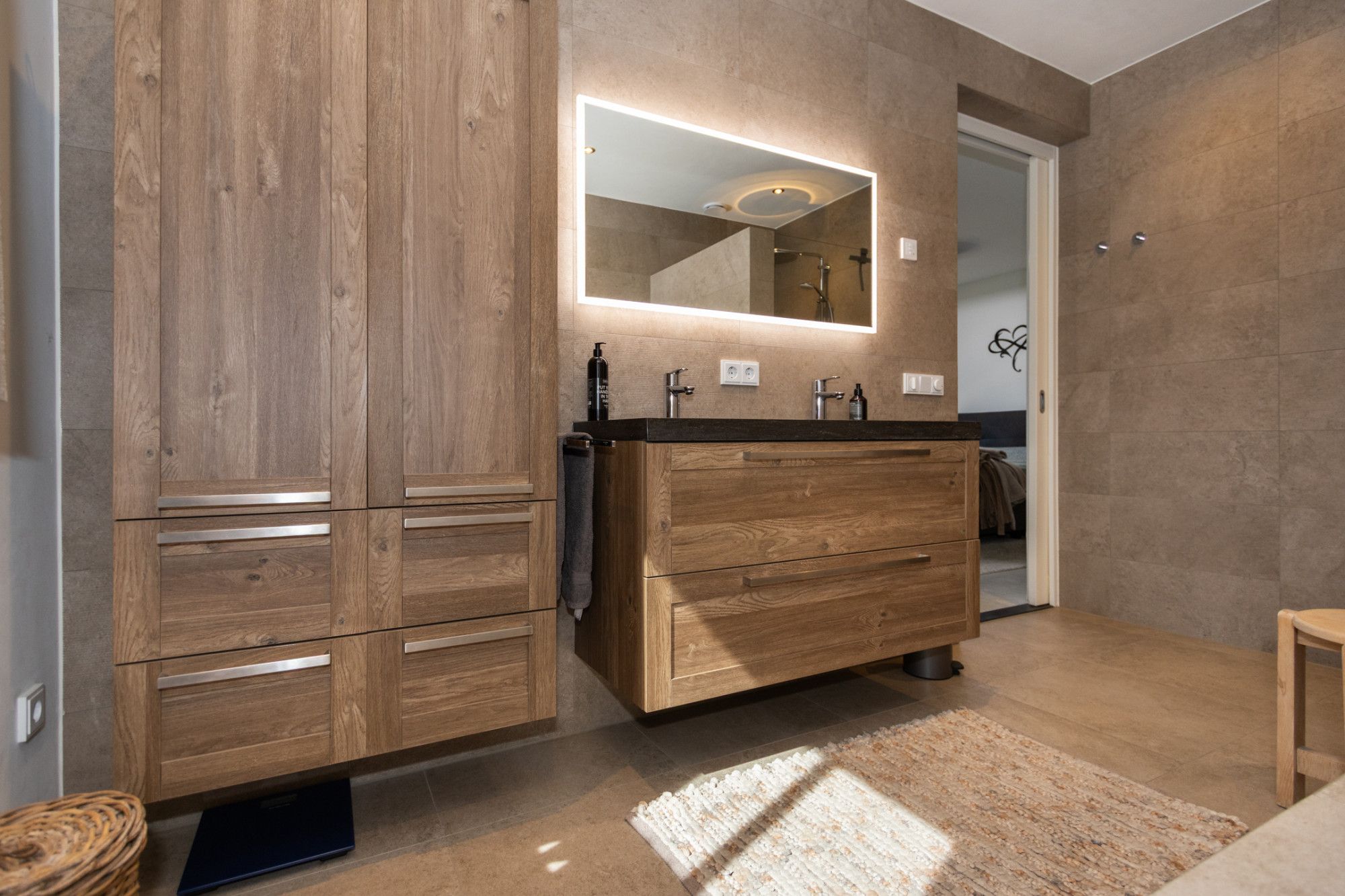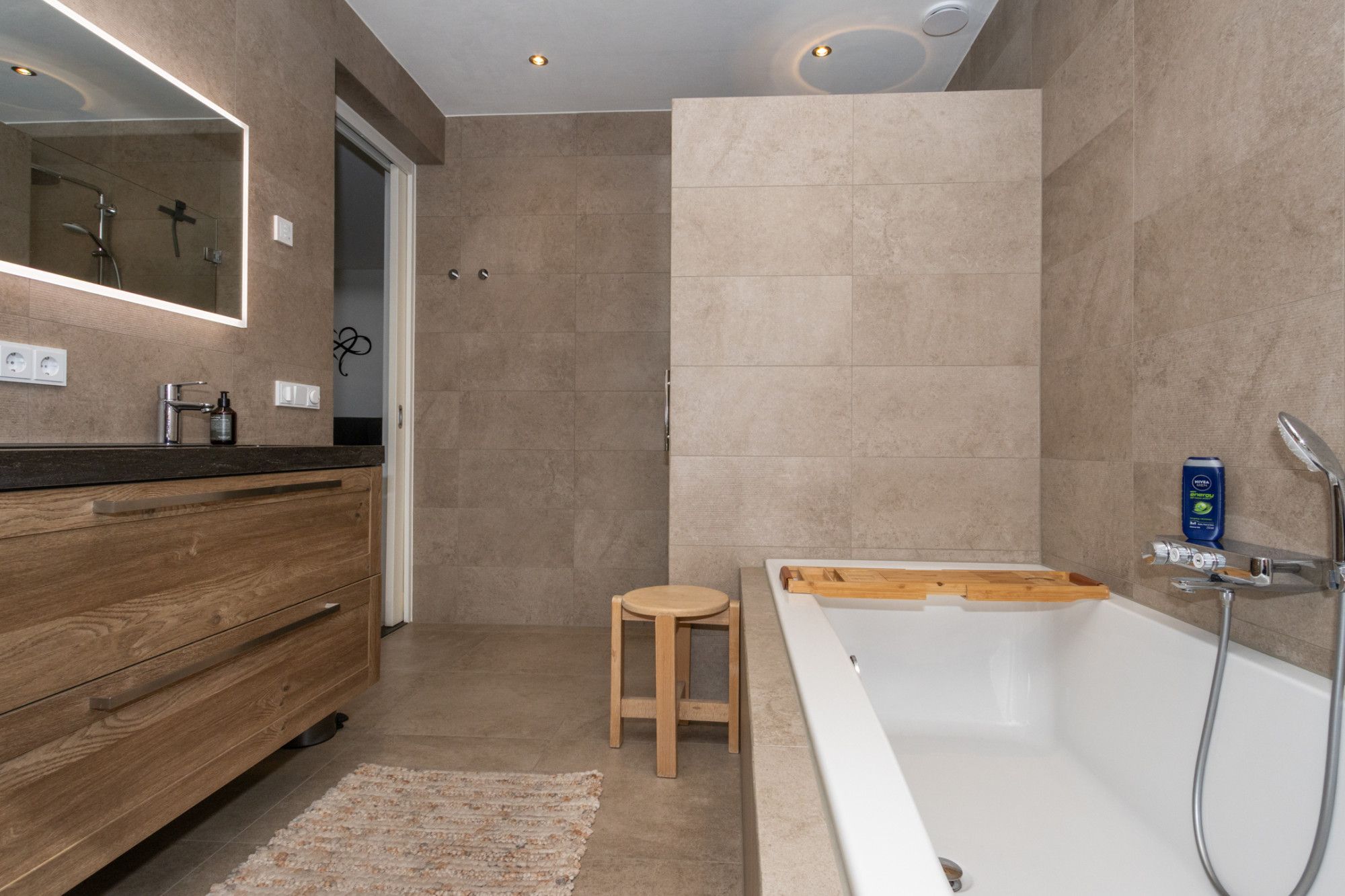 Op de begane grond bevindt zich tevens een royale slaapkamer met inloopkast en een luxe en suite badkamer. De badkamer is voorzien van een inloopdouche, ligbad, toilet, stijlvol wastafelmeubel met dubbele wastafel, een praktische bergkast en een automatisch verlichte én verwarmde spiegel.