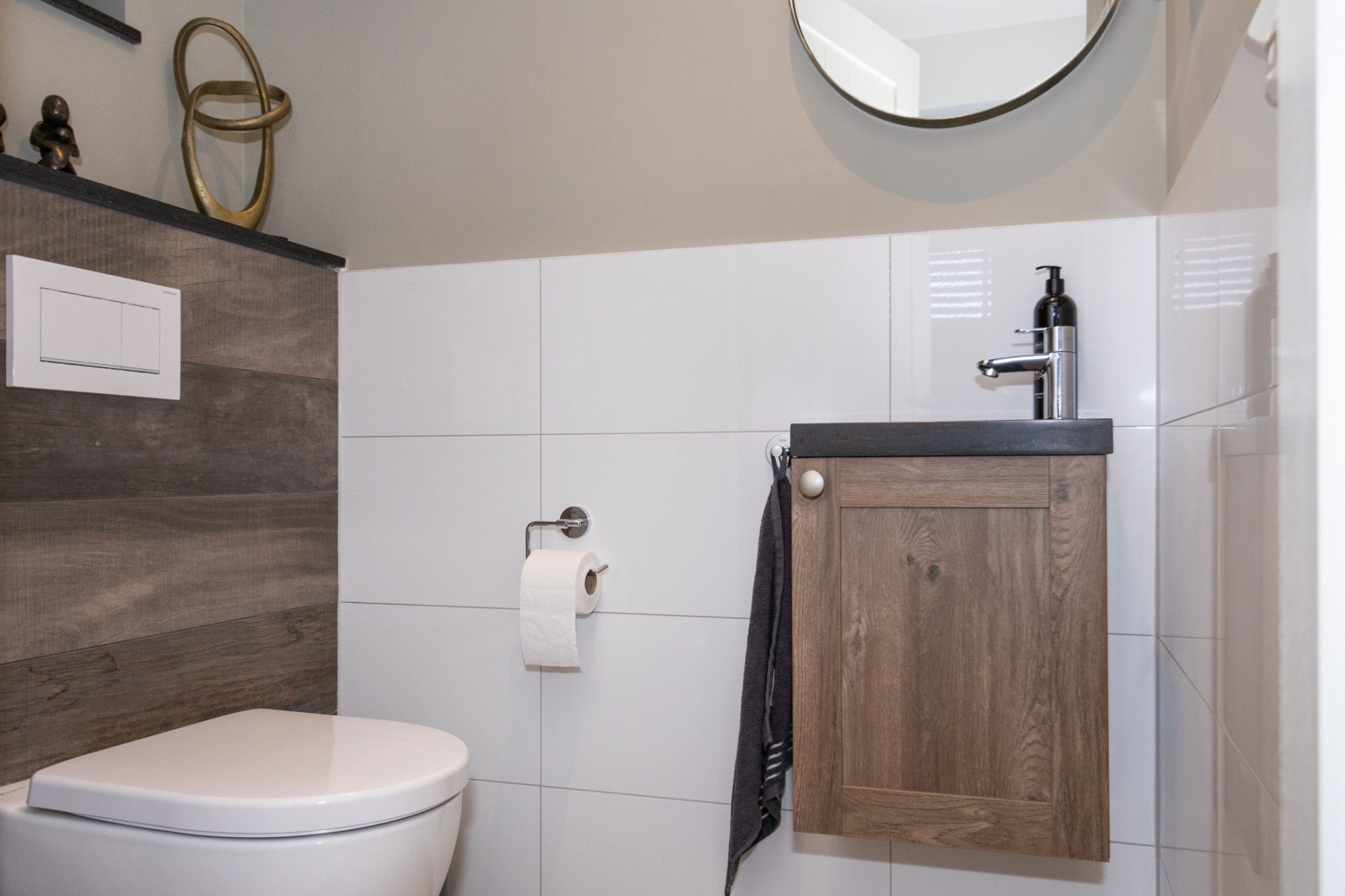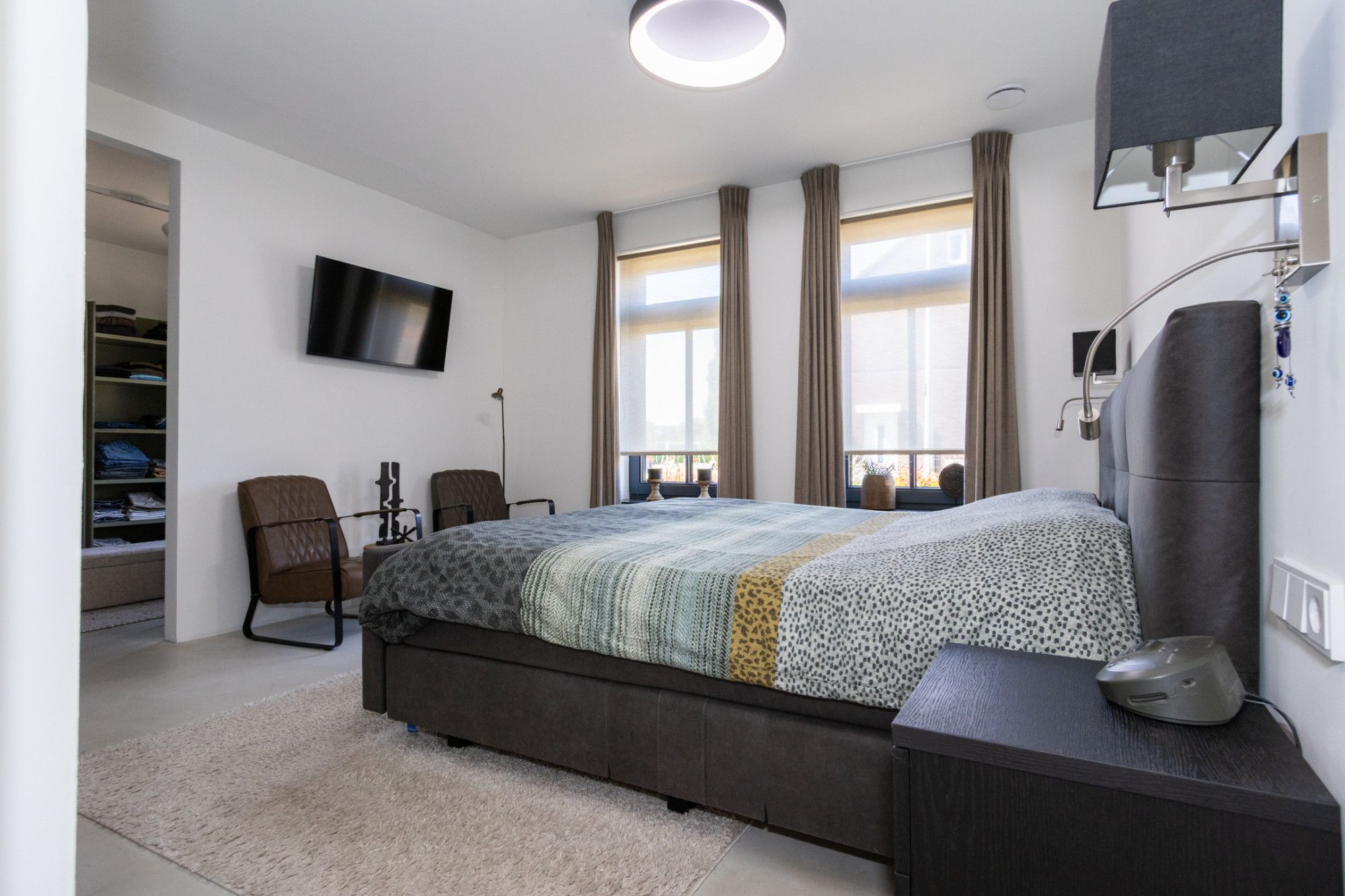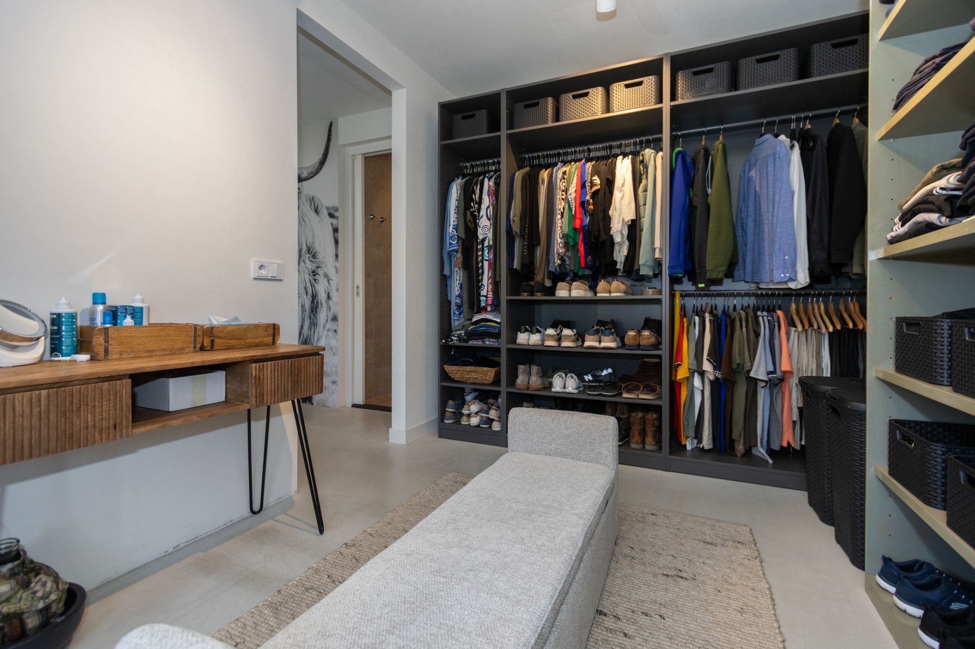 Op de begane grond bevindt zich tevens een royale slaapkamer met inloopkast en een luxe en suite badkamer. De badkamer is voorzien van een inloopdouche, ligbad, toilet, stijlvol wastafelmeubel met dubbele wastafel, een praktische bergkast en een automatisch verlichte én verwarmde spiegel.